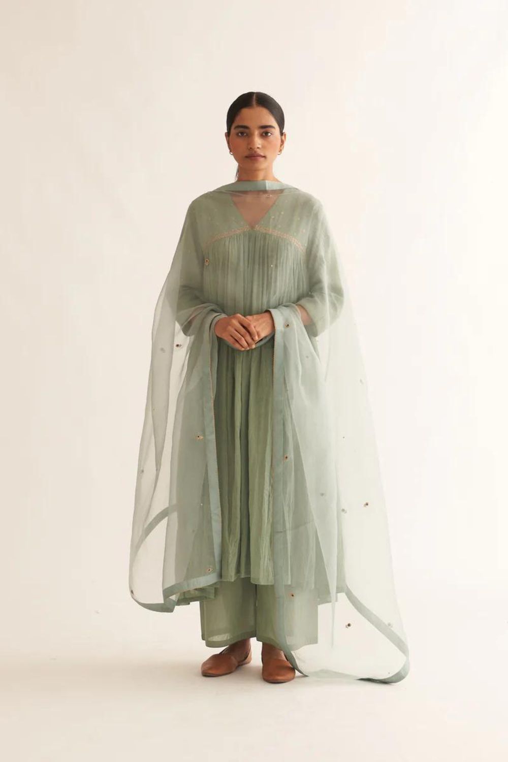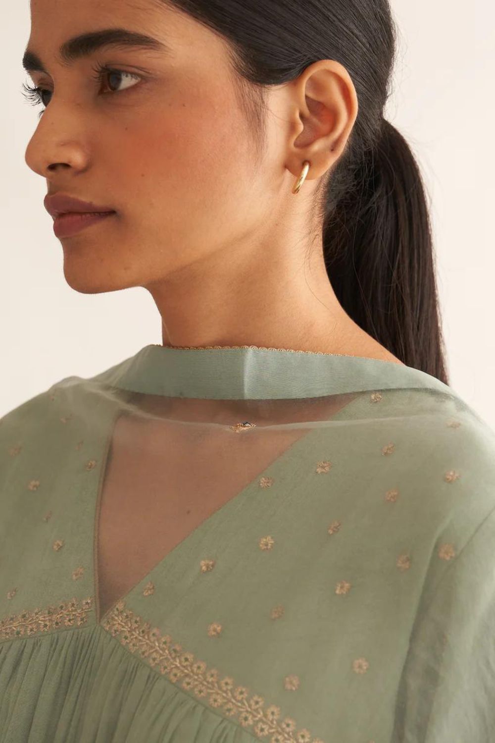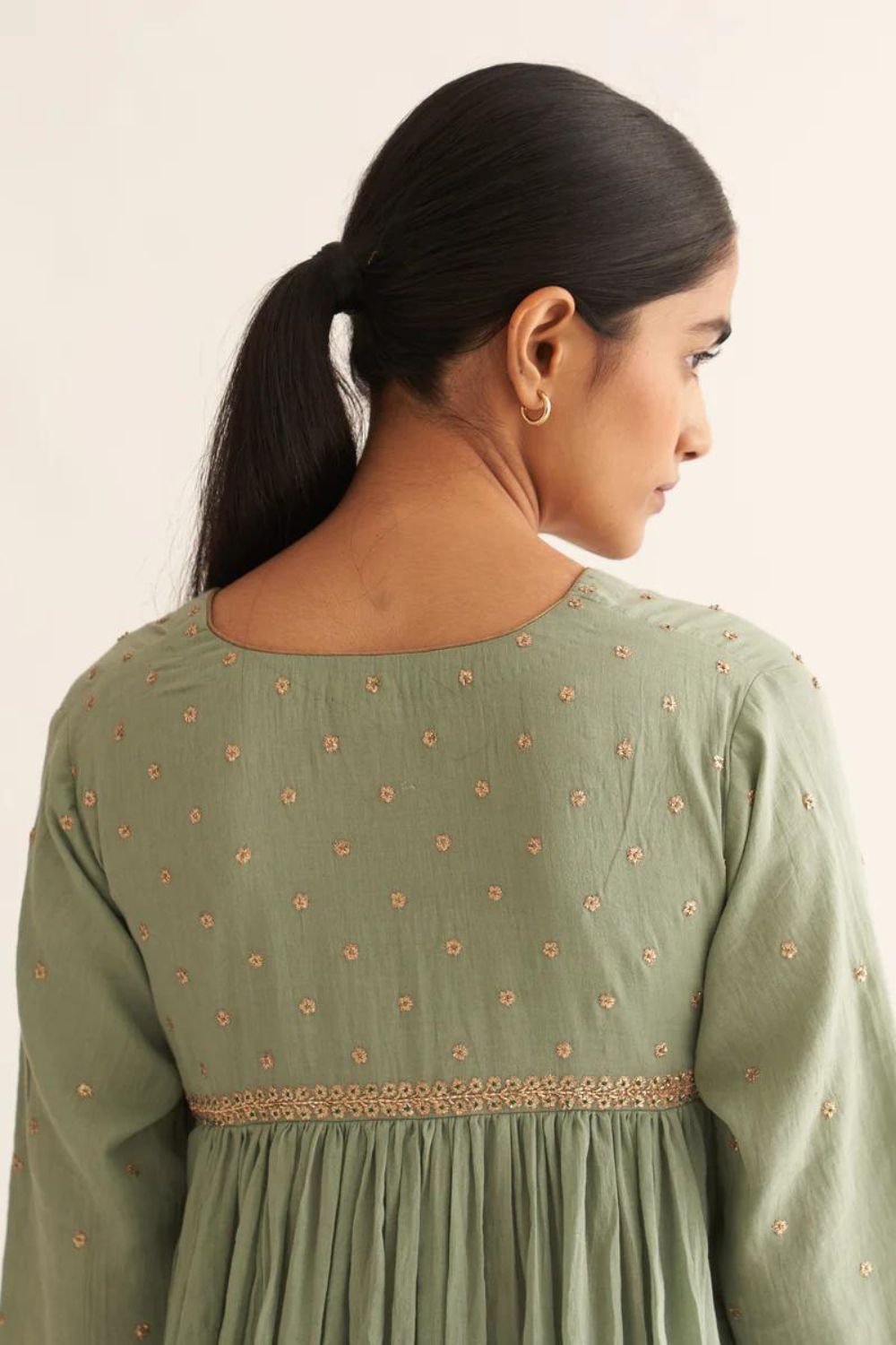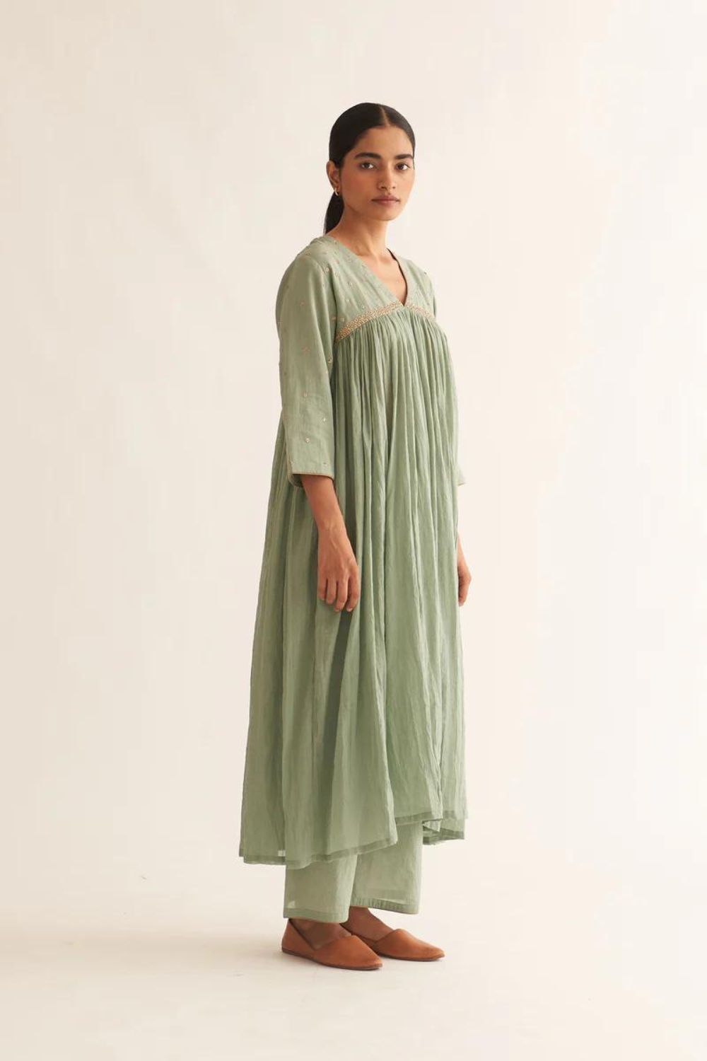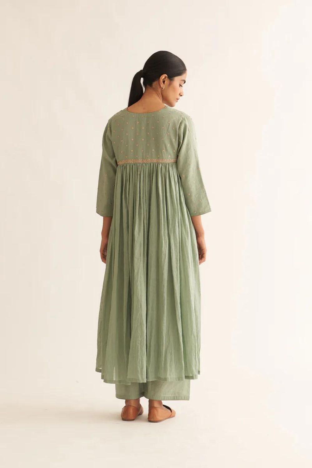 Featuring a light green kurta in cotton base with resham and zari work on sleeves and yoke.