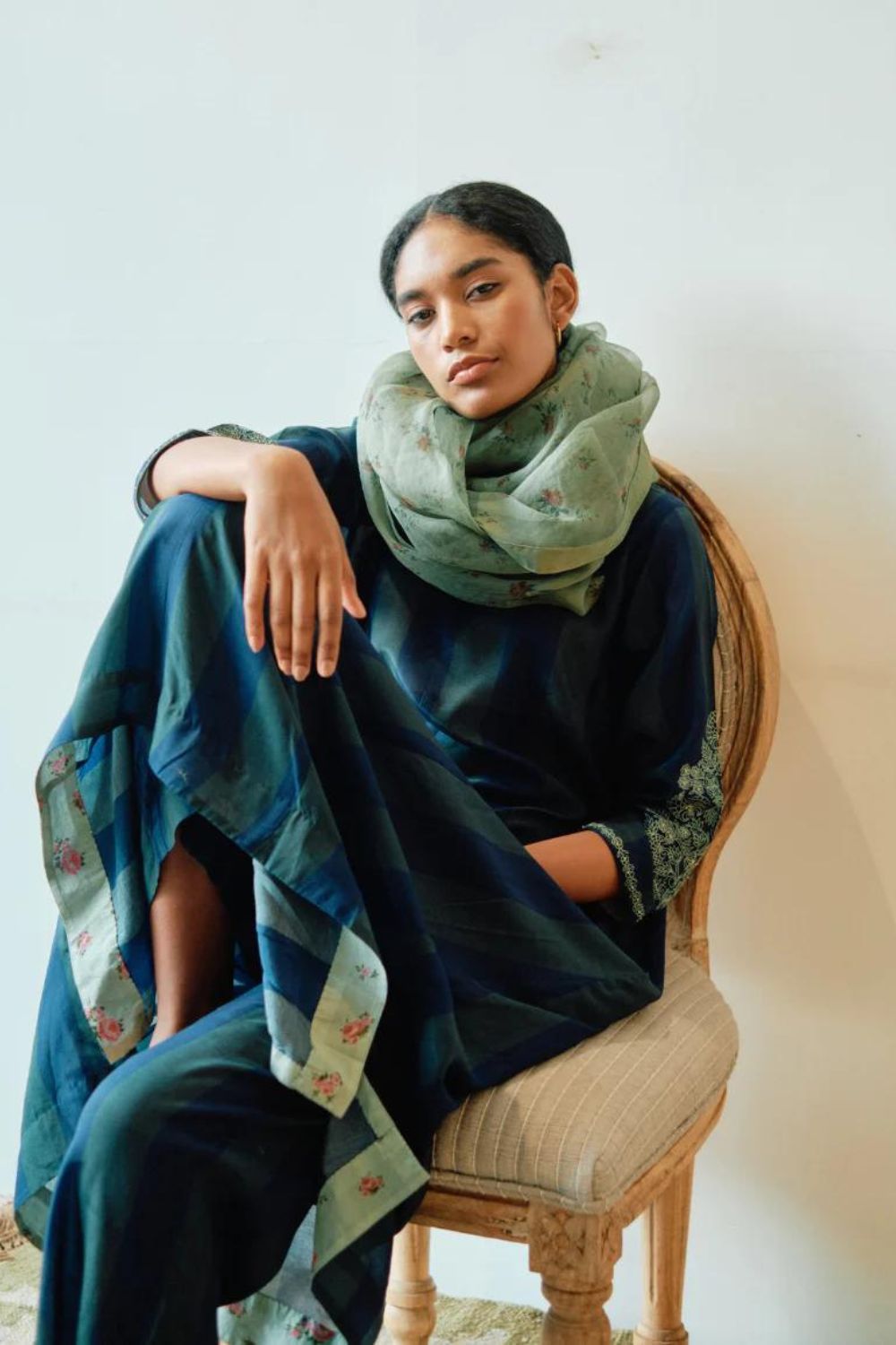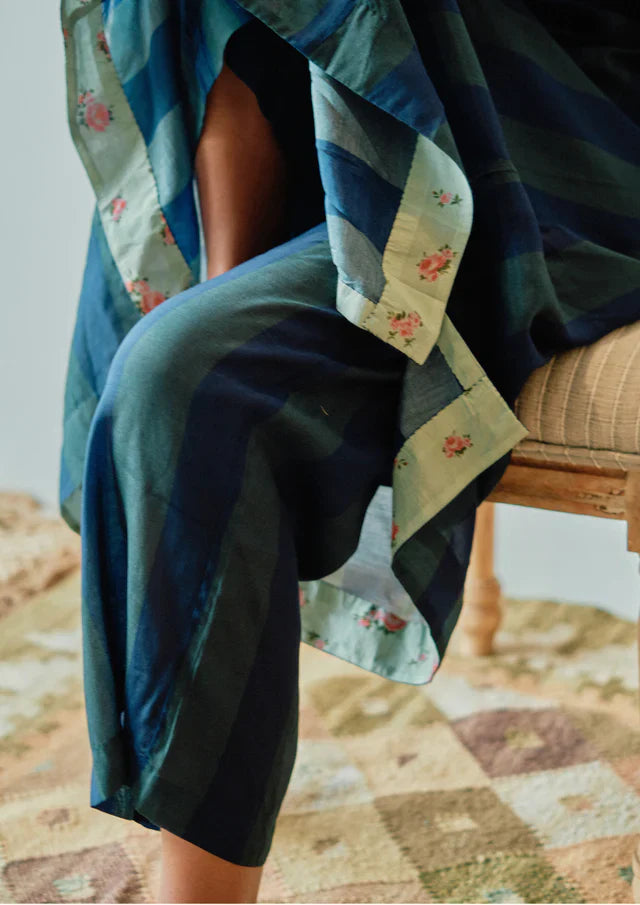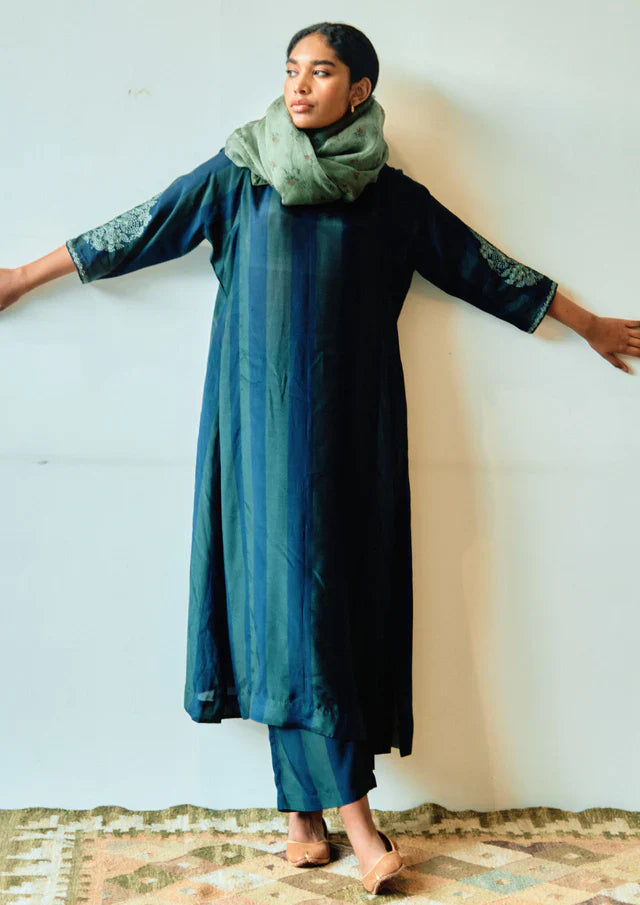 With indigo emerald stripes adorning the Chakbagla kurta style and matching pants, this ensemble exudes a sense of sophistication and charm. The kurta Set showcases hand-embroidery on sleeves, adding a touch of intricate craftsmanship to its design.