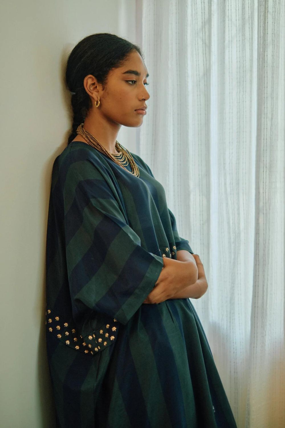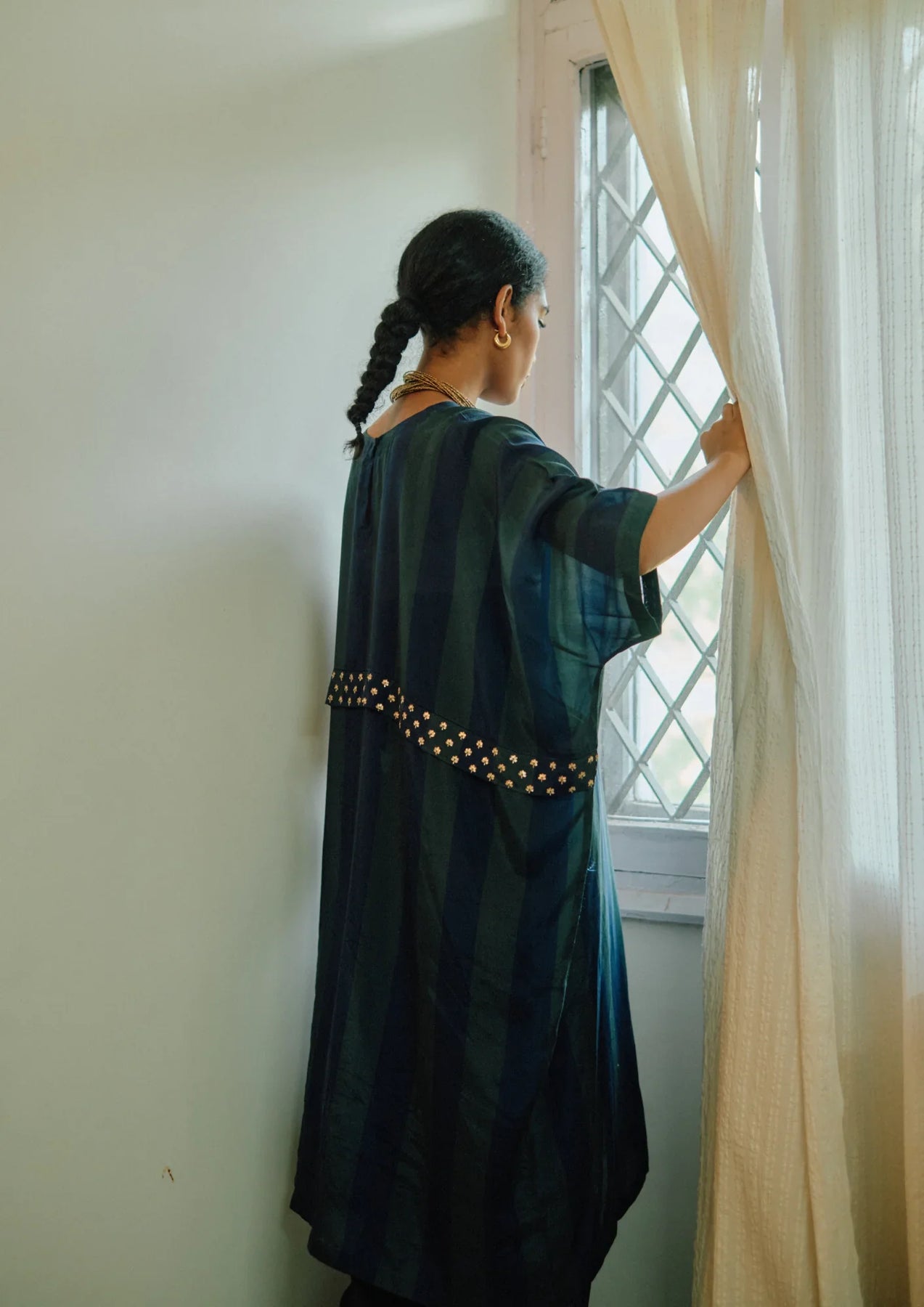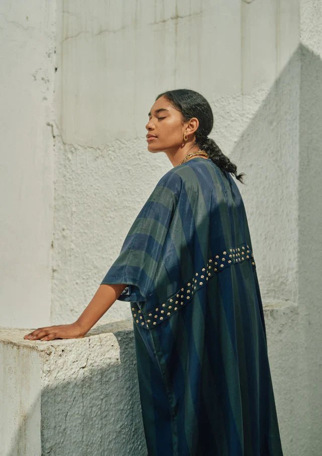 The exquisite Muscari Kaftan Set, crafted in a luxurious cotton silk fabric. This Kaftan Set is adorned with intricate embroidery at the belt, enhancing the elegance of the indigo emerald stripe Kaftan, paired with matching Striped Pants.