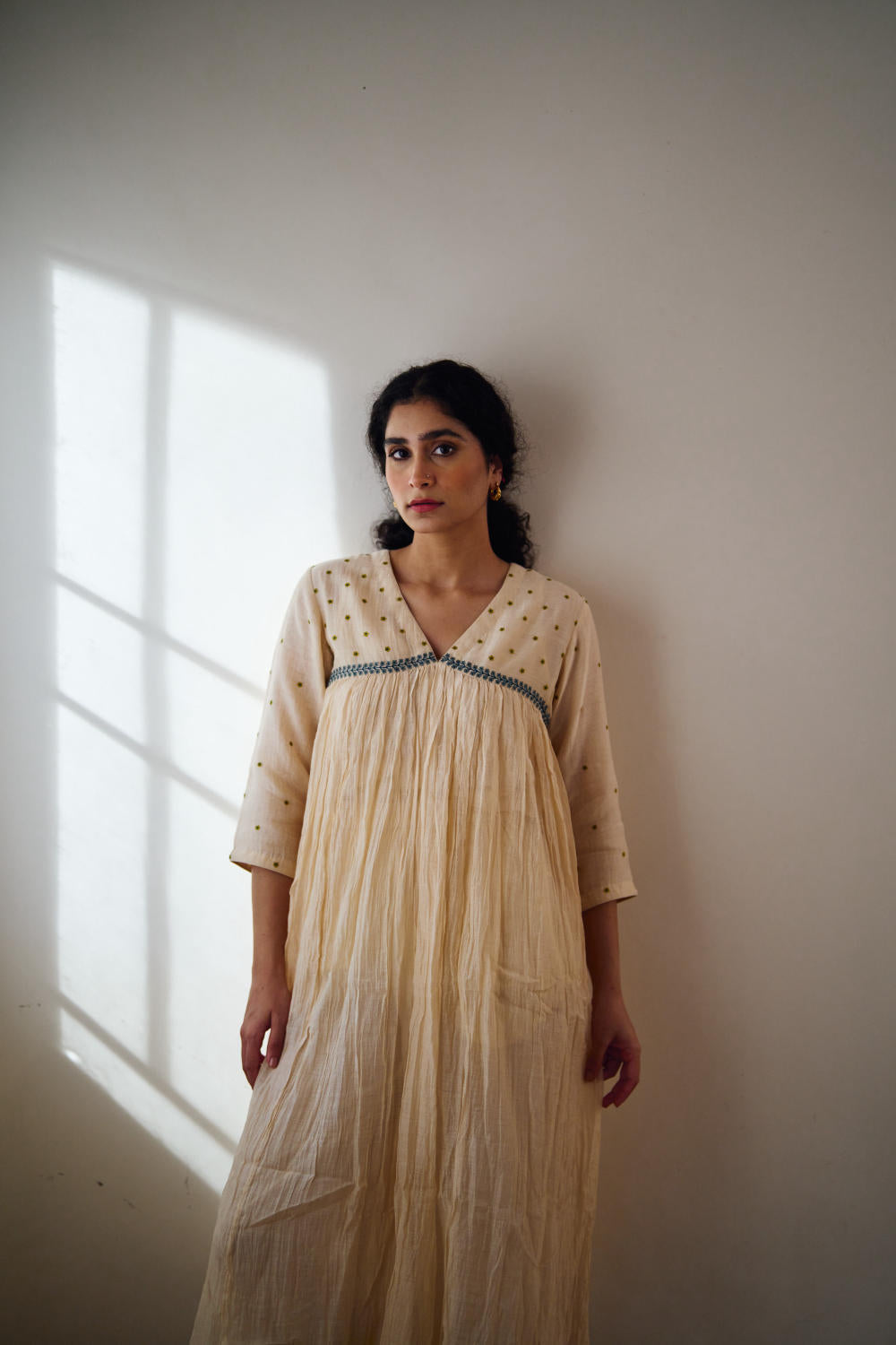 DOT is built on the philosophy of simple living: colours borrowed from nature, silhouettes that float rather than cling, and craftsmanship that honours tradition without performing it. There is a serenity to their pieces — soft pastels, fluid drapes, minimal embroidery, and a lingering hint of the vintage. Everything feels poetic, but never precious; modern, but never loud. Their garments live in that delicate balance where texture, alignment, and movement tell the story.
