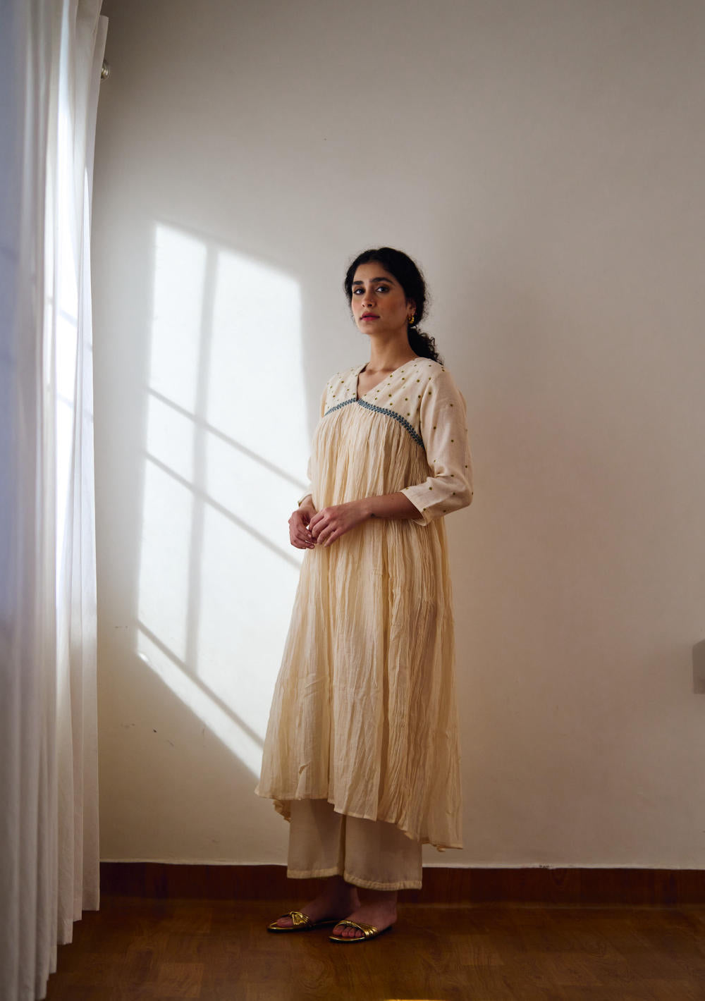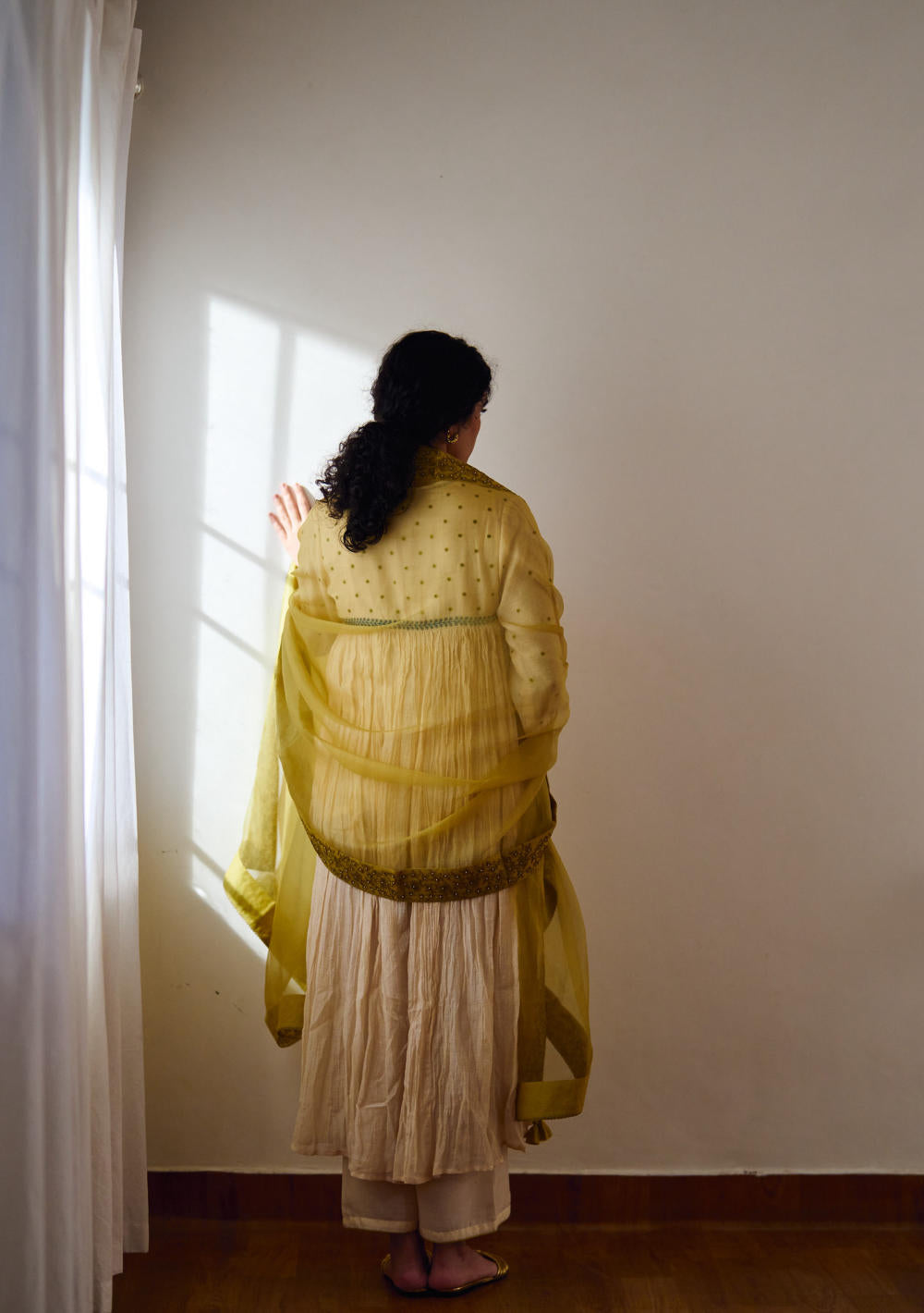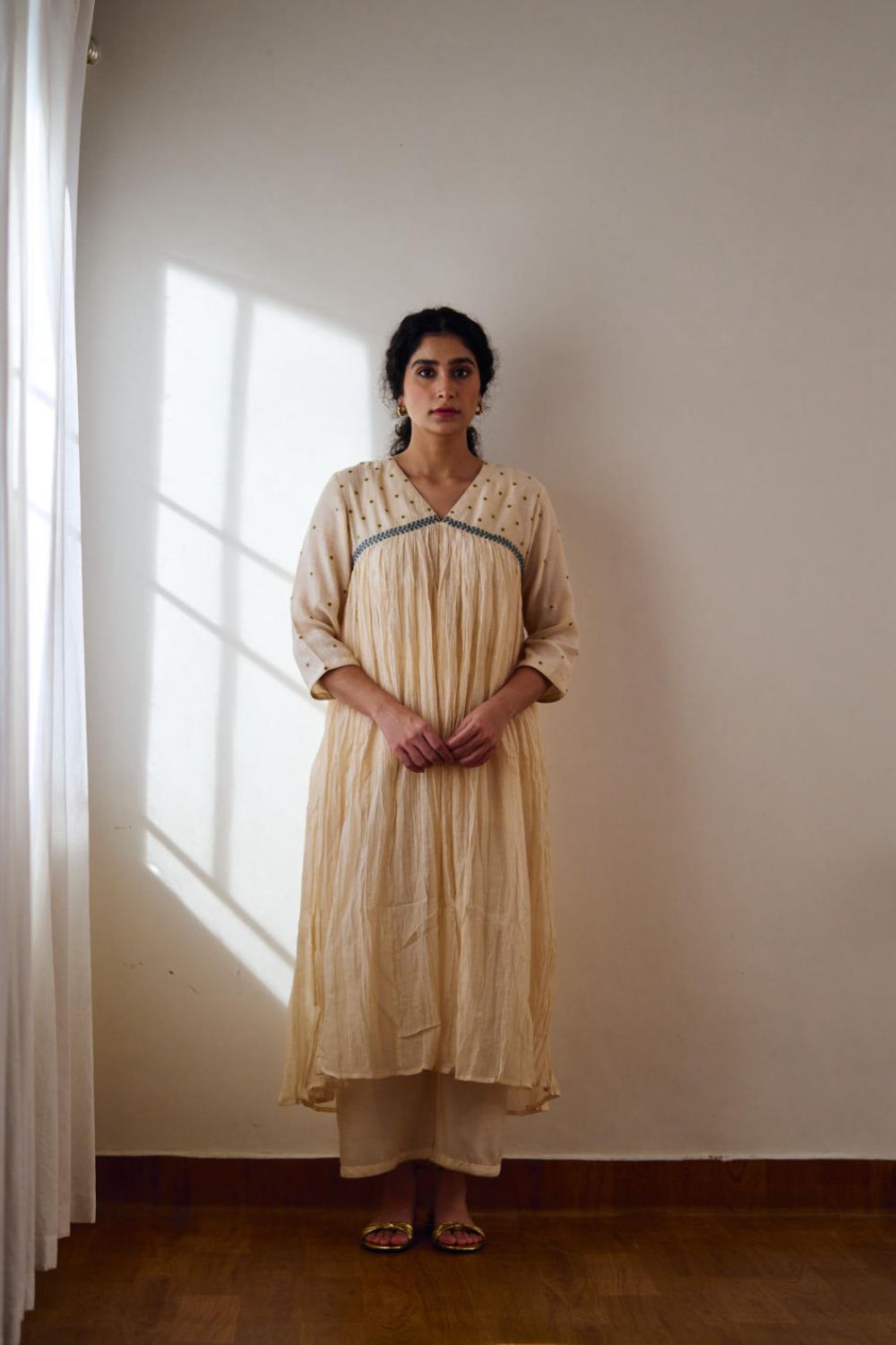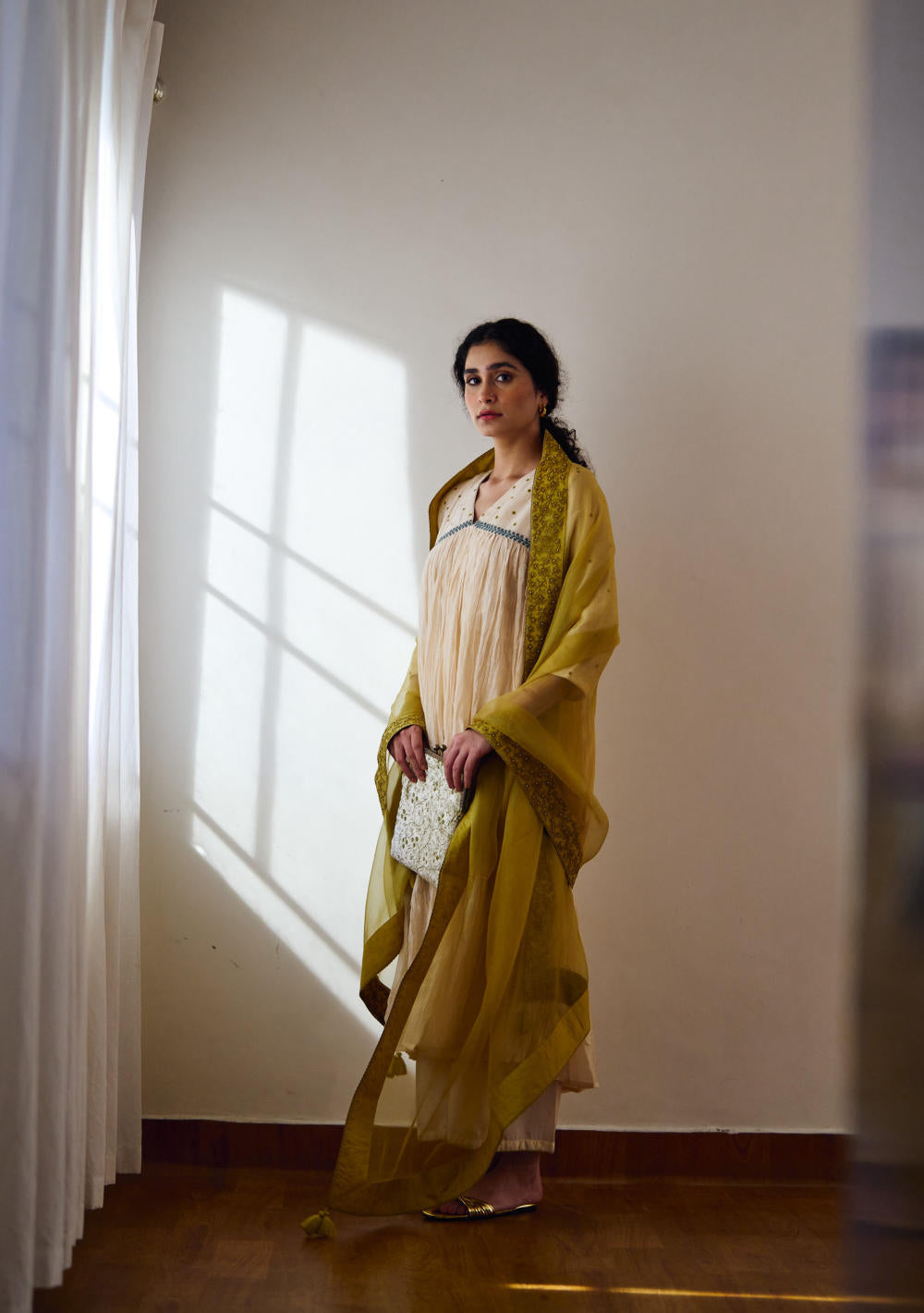 Introducing an elegant V-neck kurta set in Chanderi fabric that showcases exquisite craftsmanship. The kurta is adorned with resham floral embroidery, beautifully spread across the yoke and sleeves , adding a touch of grace and beauty. The yoke hem is delicately embellished with bel detailing, enhancing the overall charm of the ensemble.