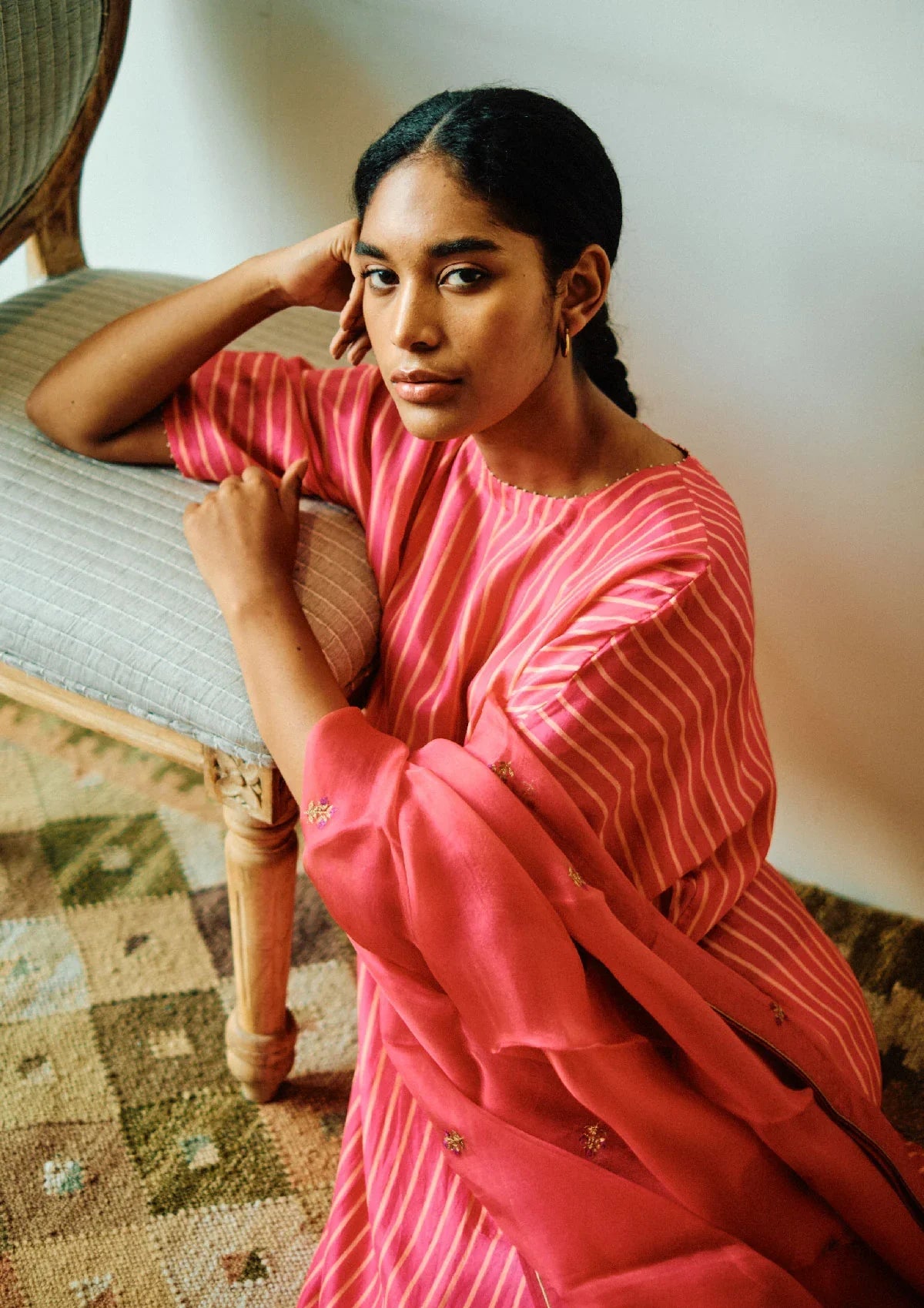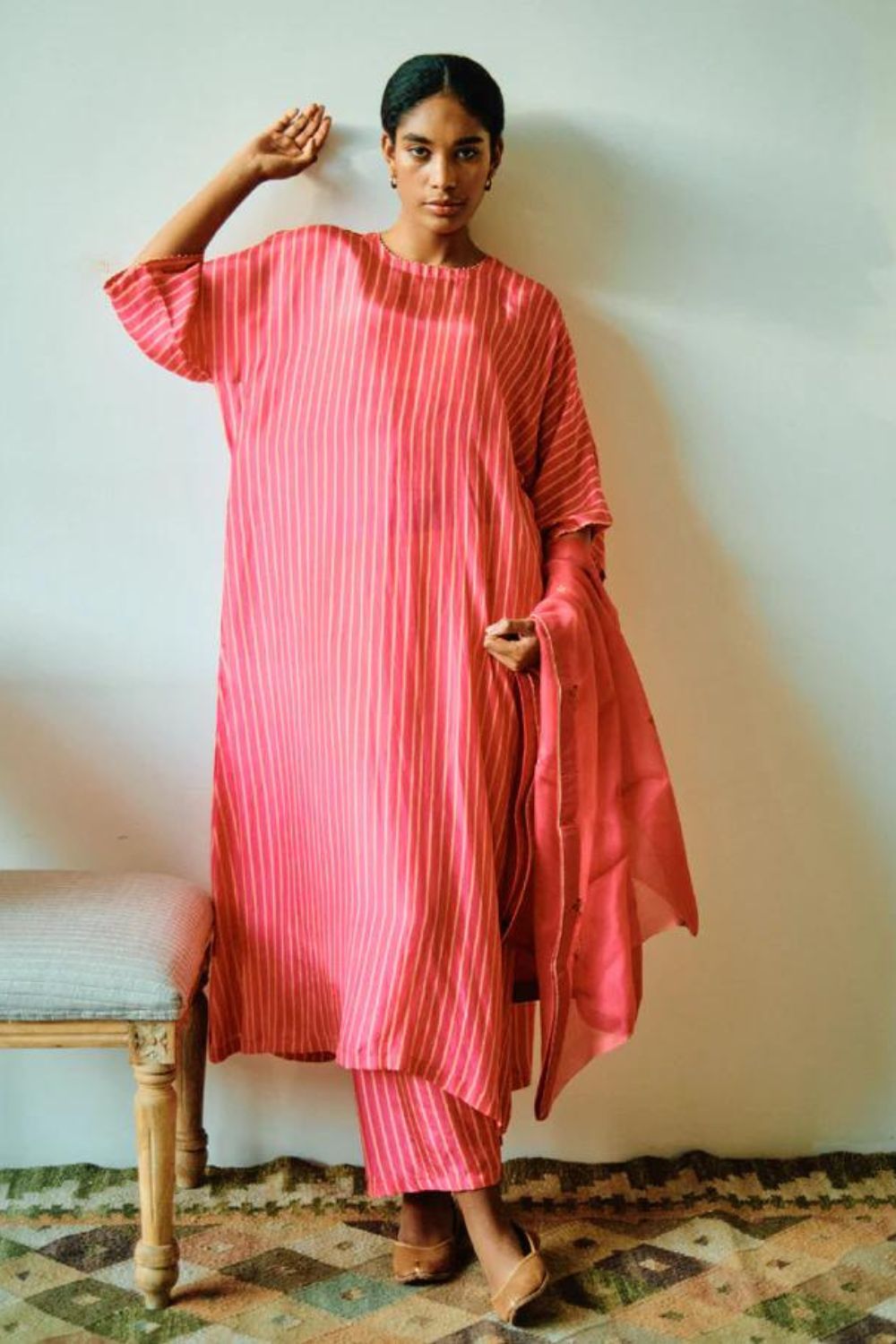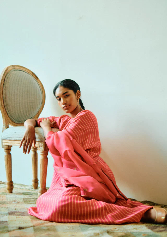 This Kurta set features poppy pink striped Chakbagla set with paired pants, crafted from high-quality Habutai Silk fabric. The Kurta Set has a very easy breezy and flowy silhouette, ensuring maximum comfort and style. Dupatta.