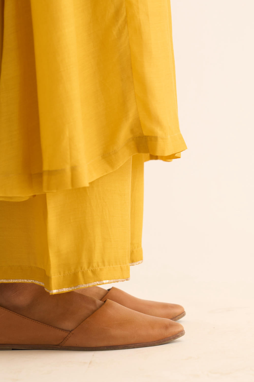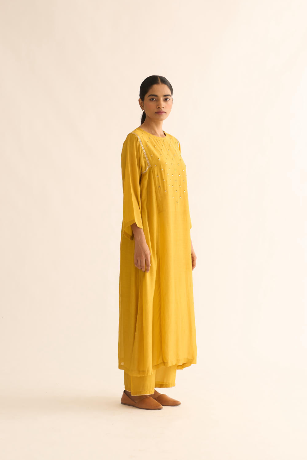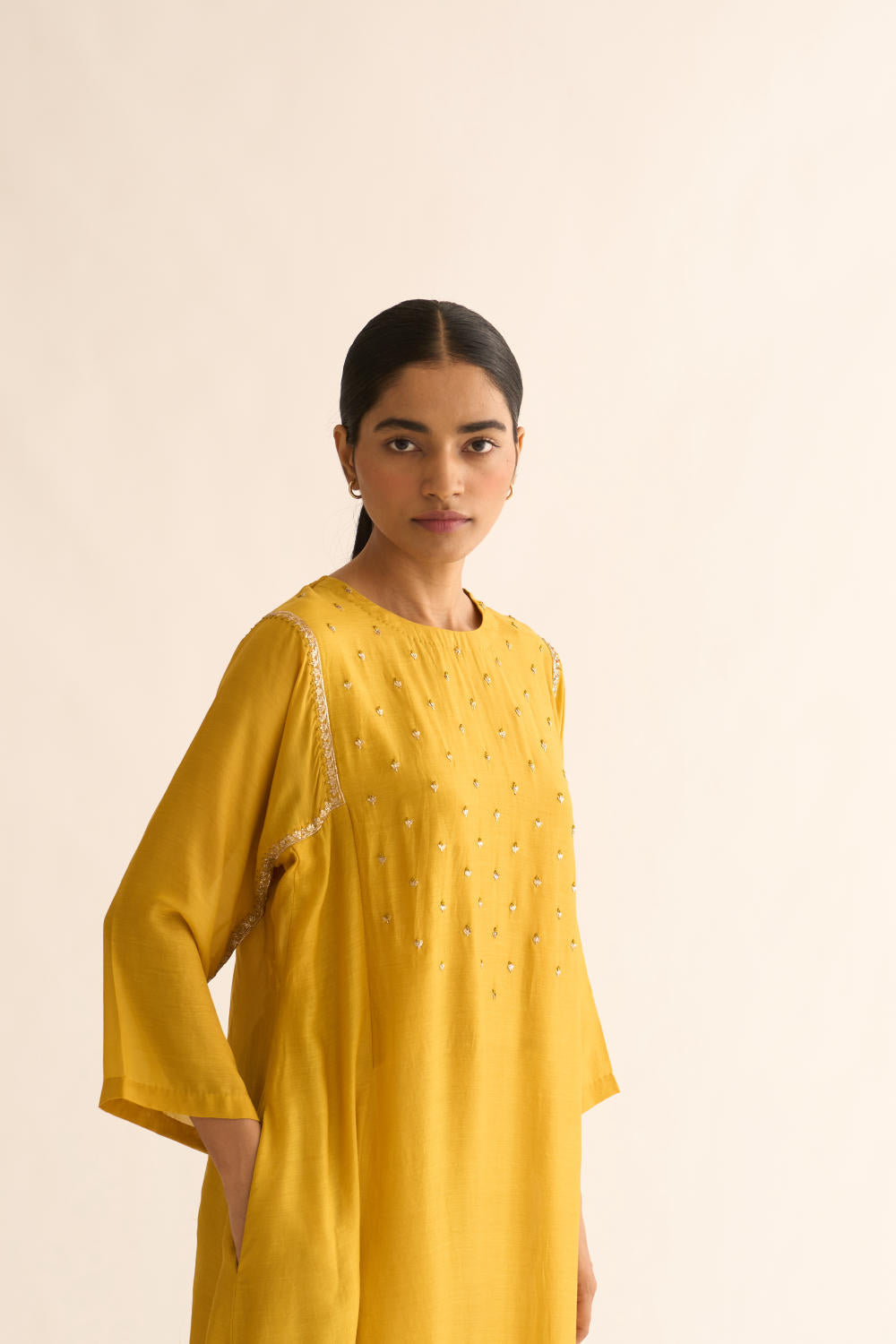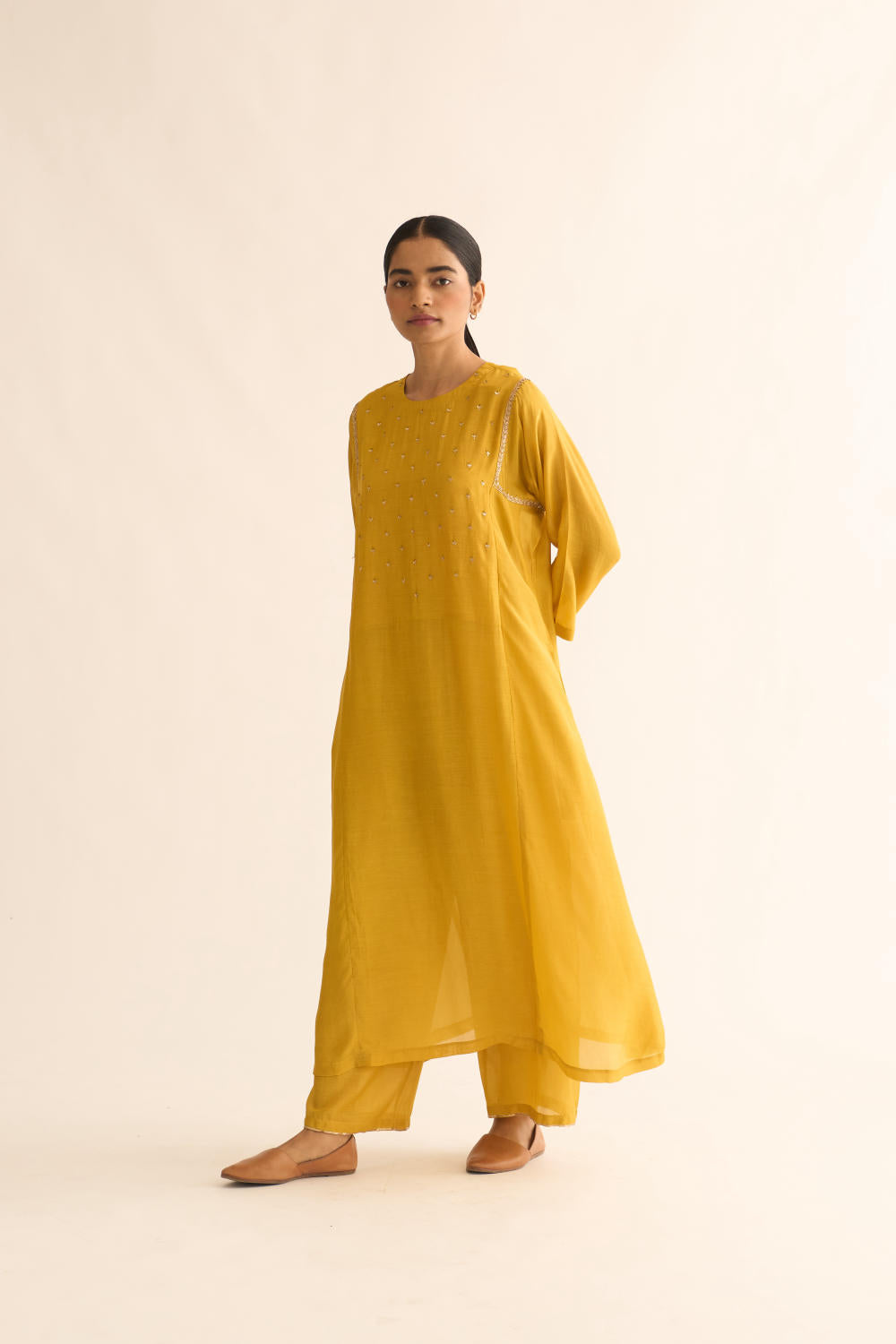 It's a Two piece garment made in cotton silk Colored in a shade of Bright mustard. The kurta is embellished with gold dabka work , complimenting the sensuality of the straight broad fit of the pants in cotton silk.