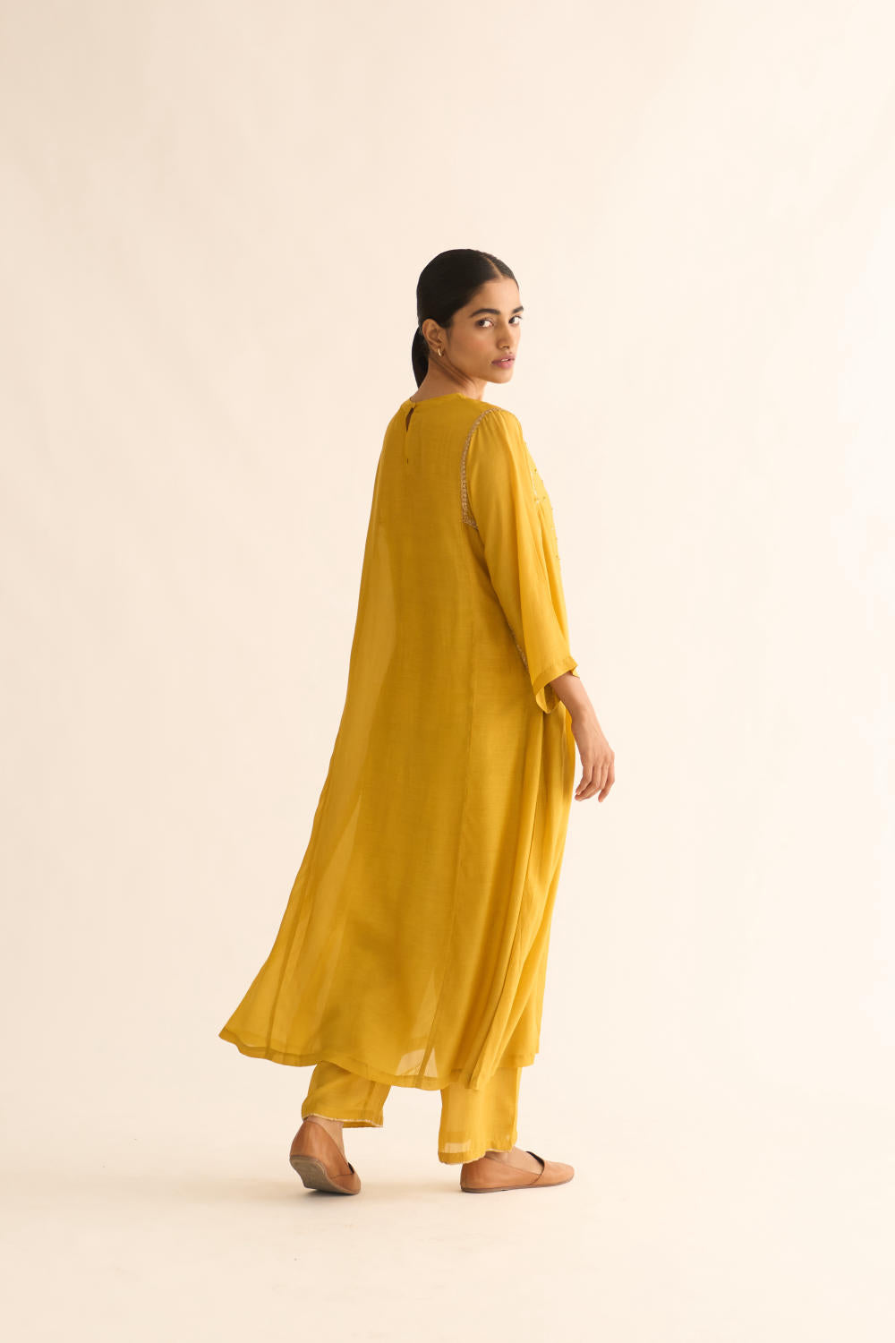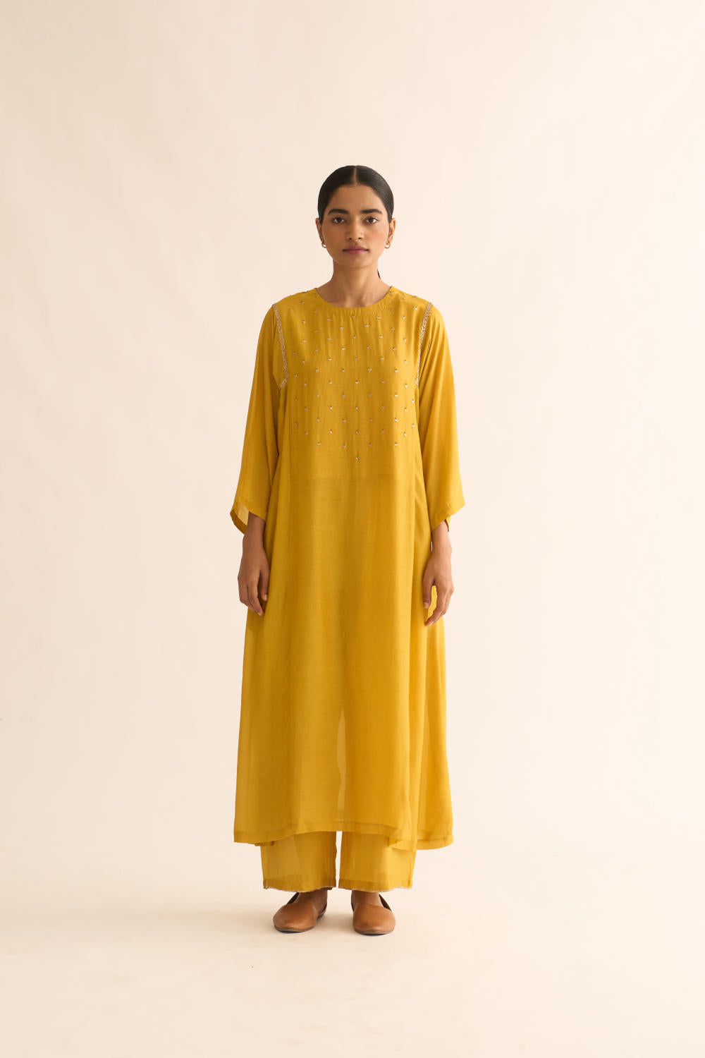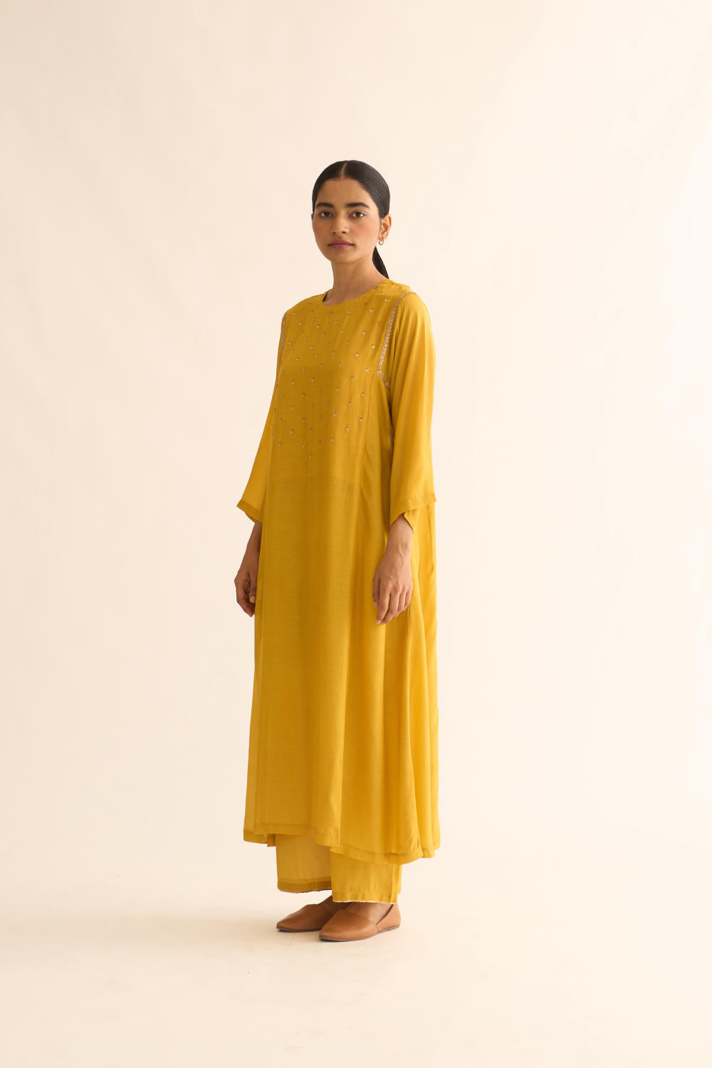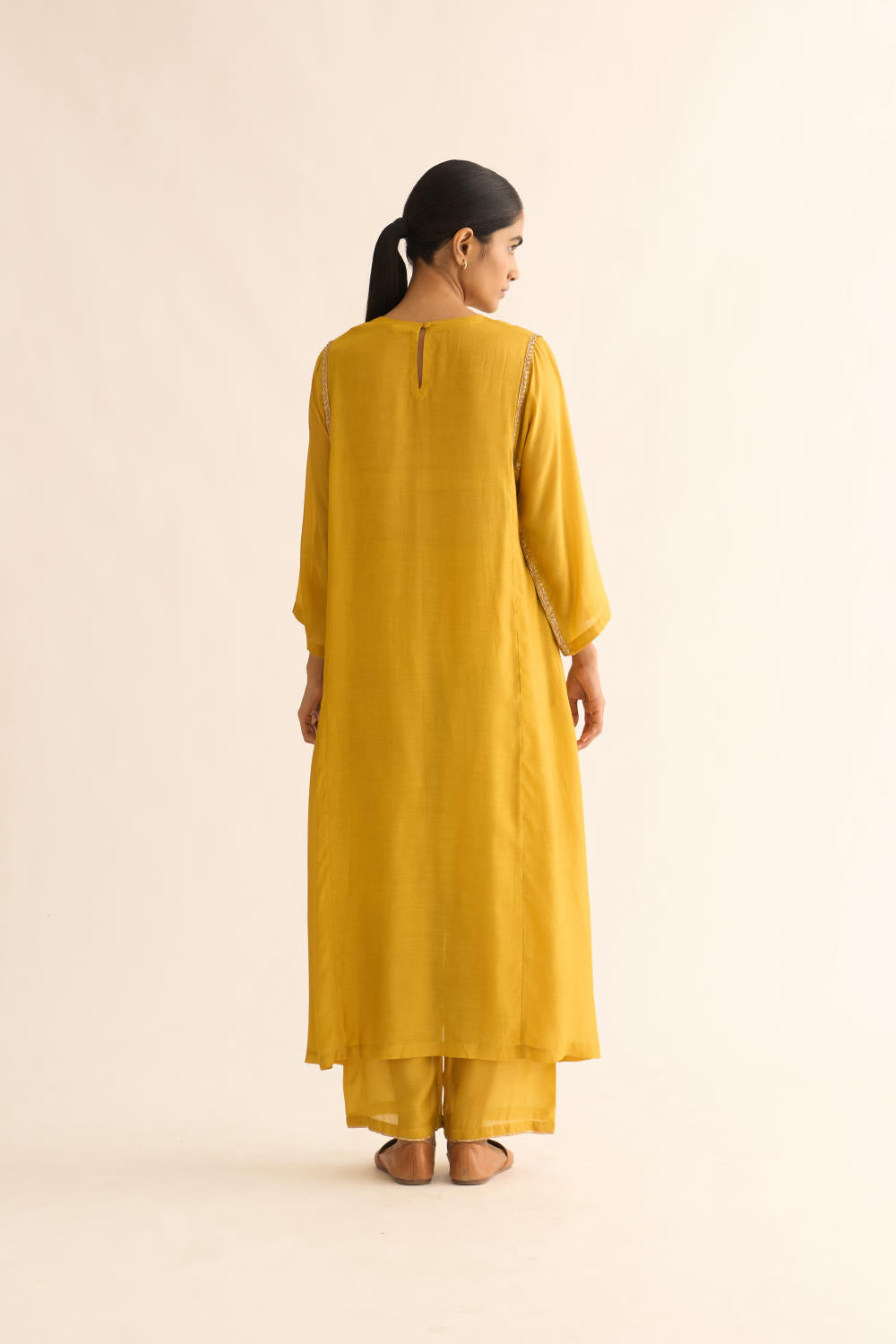 It's a Two piece garment made in cotton silk Colored in a shade of Bright mustard. The kurta is embellished with gold dabka work , complimenting the sensuality of the straight broad fit of the pants in cotton silk.