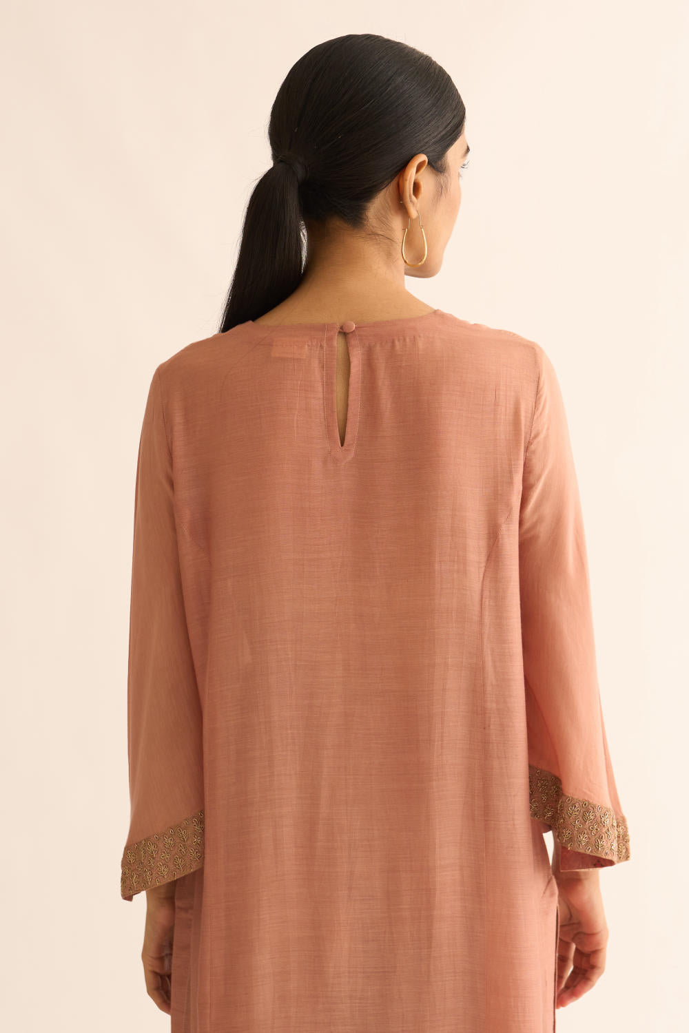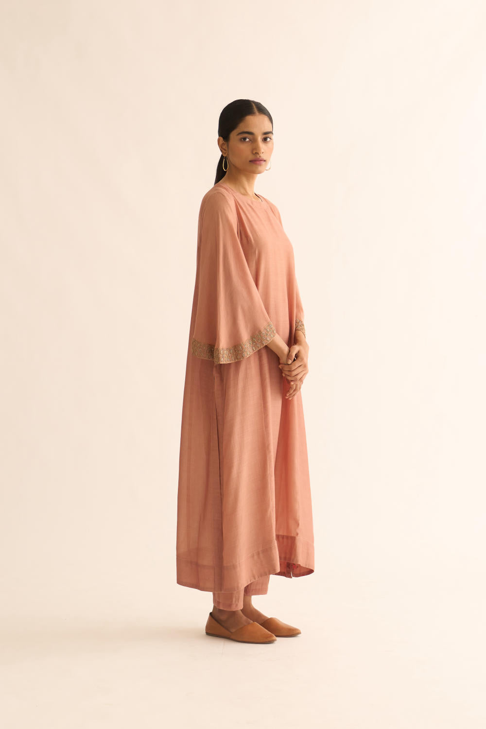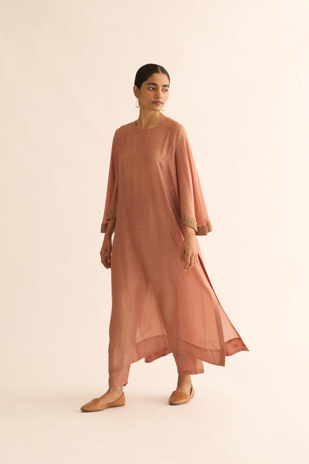 Featuring an old rose kurta in cotton silk base with zari embroidery. It is paired with matching pants.