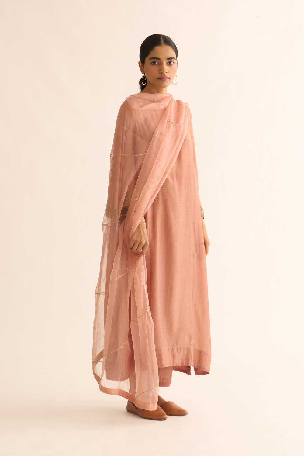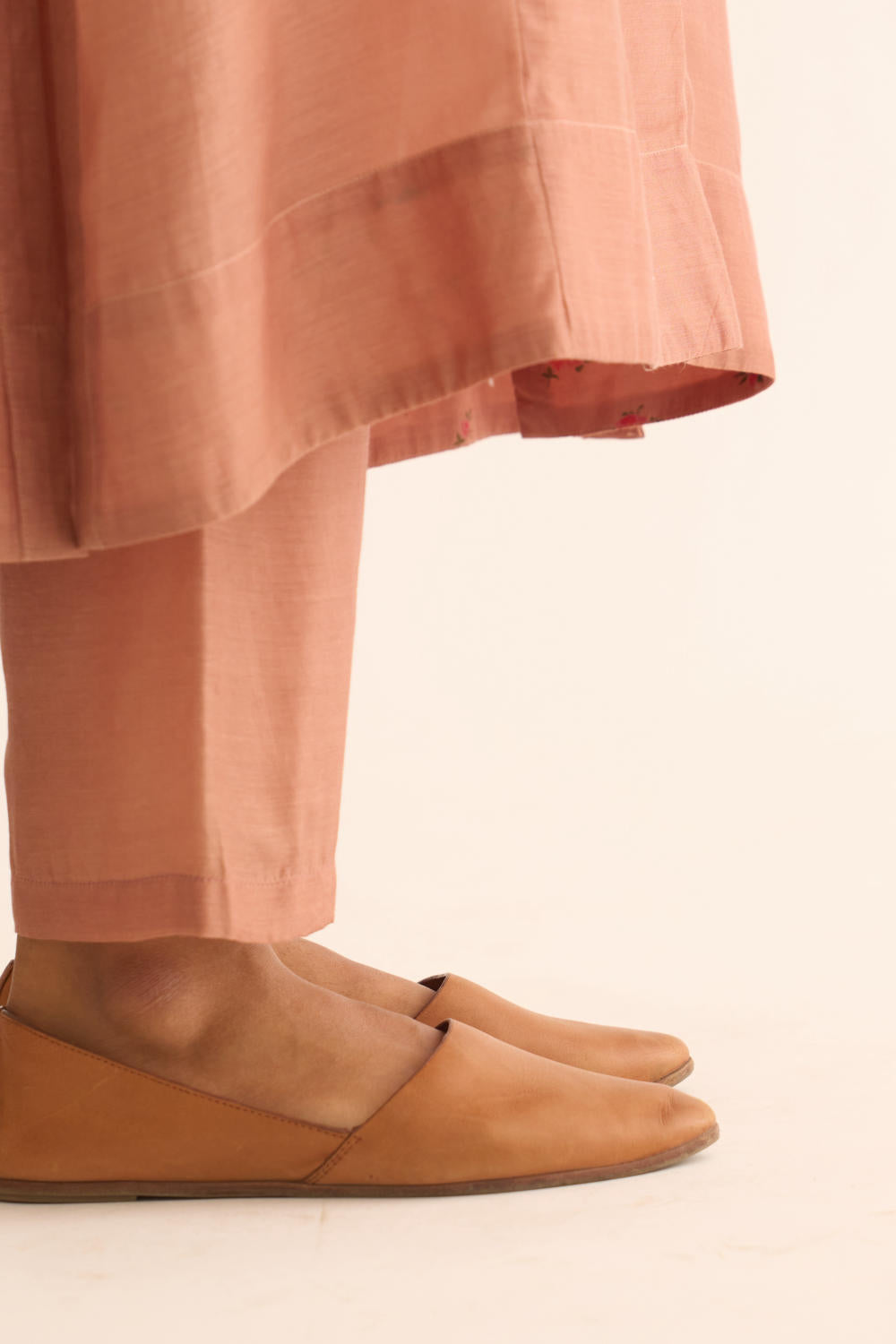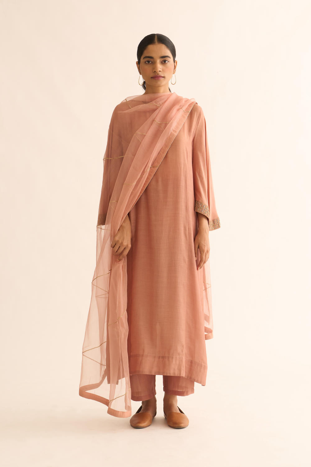 Featuring an old rose kurta in cotton silk base with zari embroidery. It is paired with matching pants.