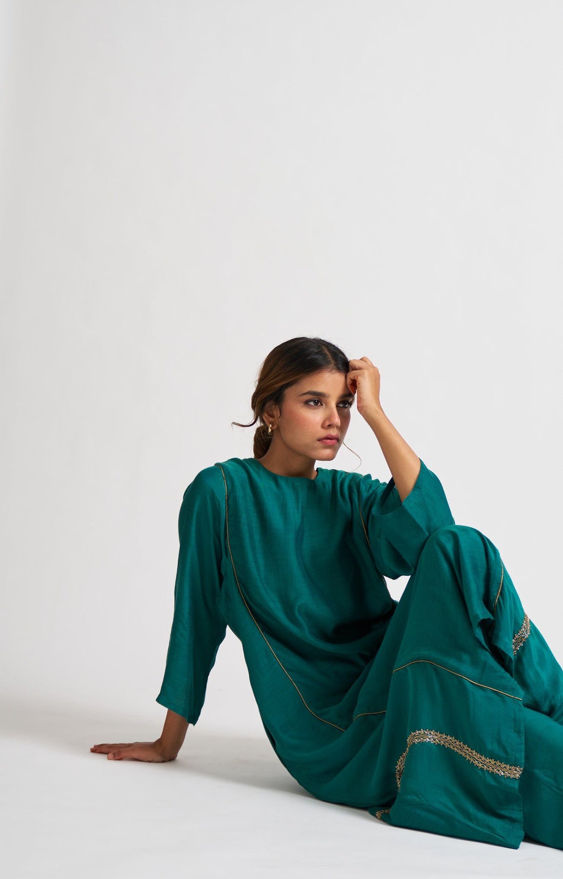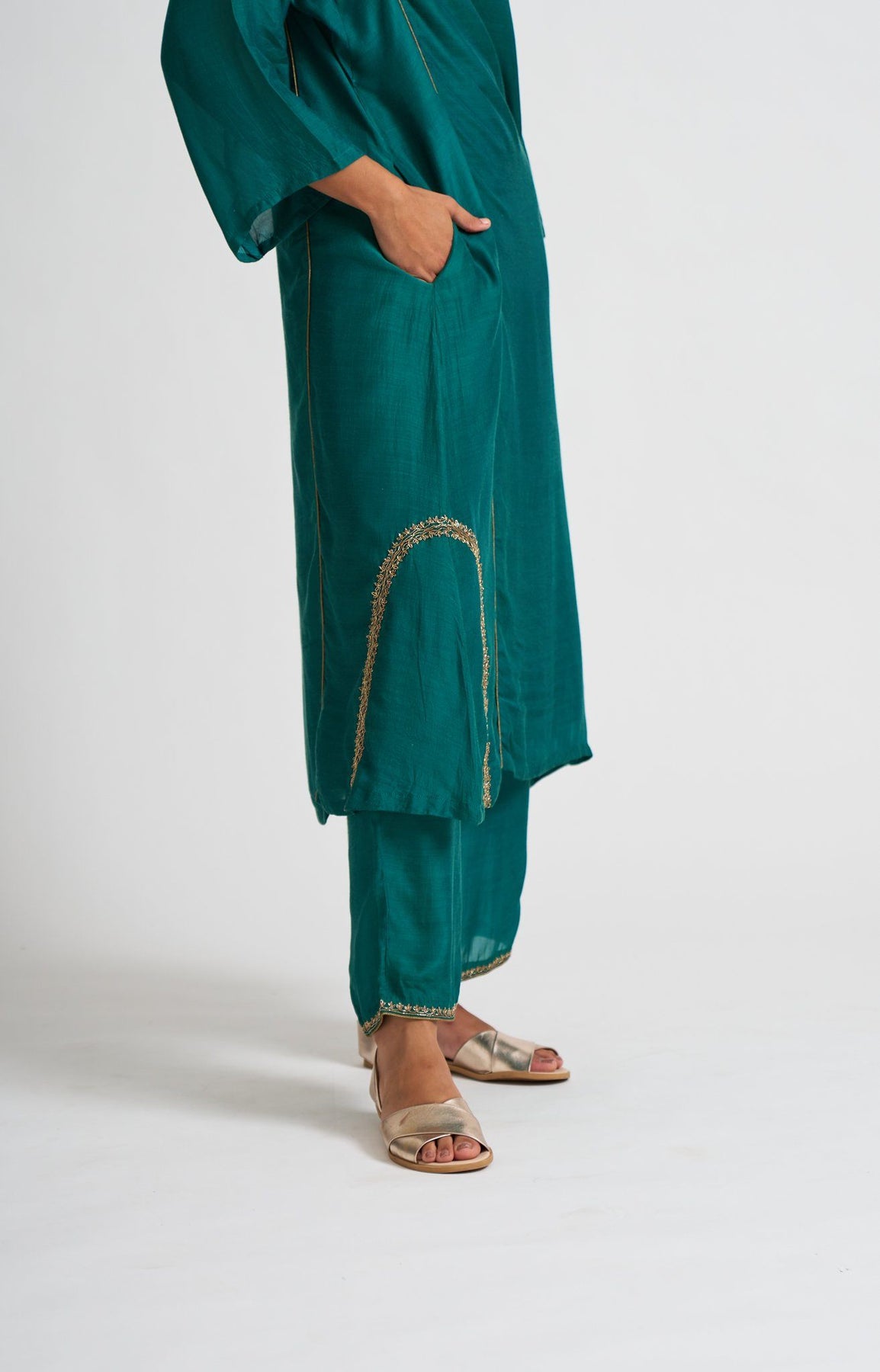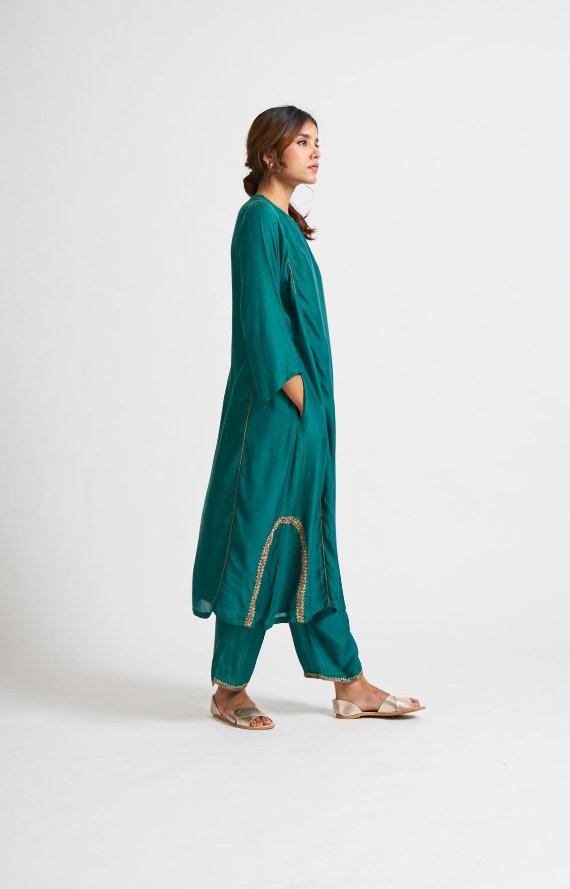 It's a three-piece garment made in cotton silk and chanderi. Colored in a deep emotive shade of turquoise. The asymmetric A-line cut of the kurta is embellished with gold dabka borders, complimenting the sensuality of red with the straight broad fit of the pants in cotton silk.