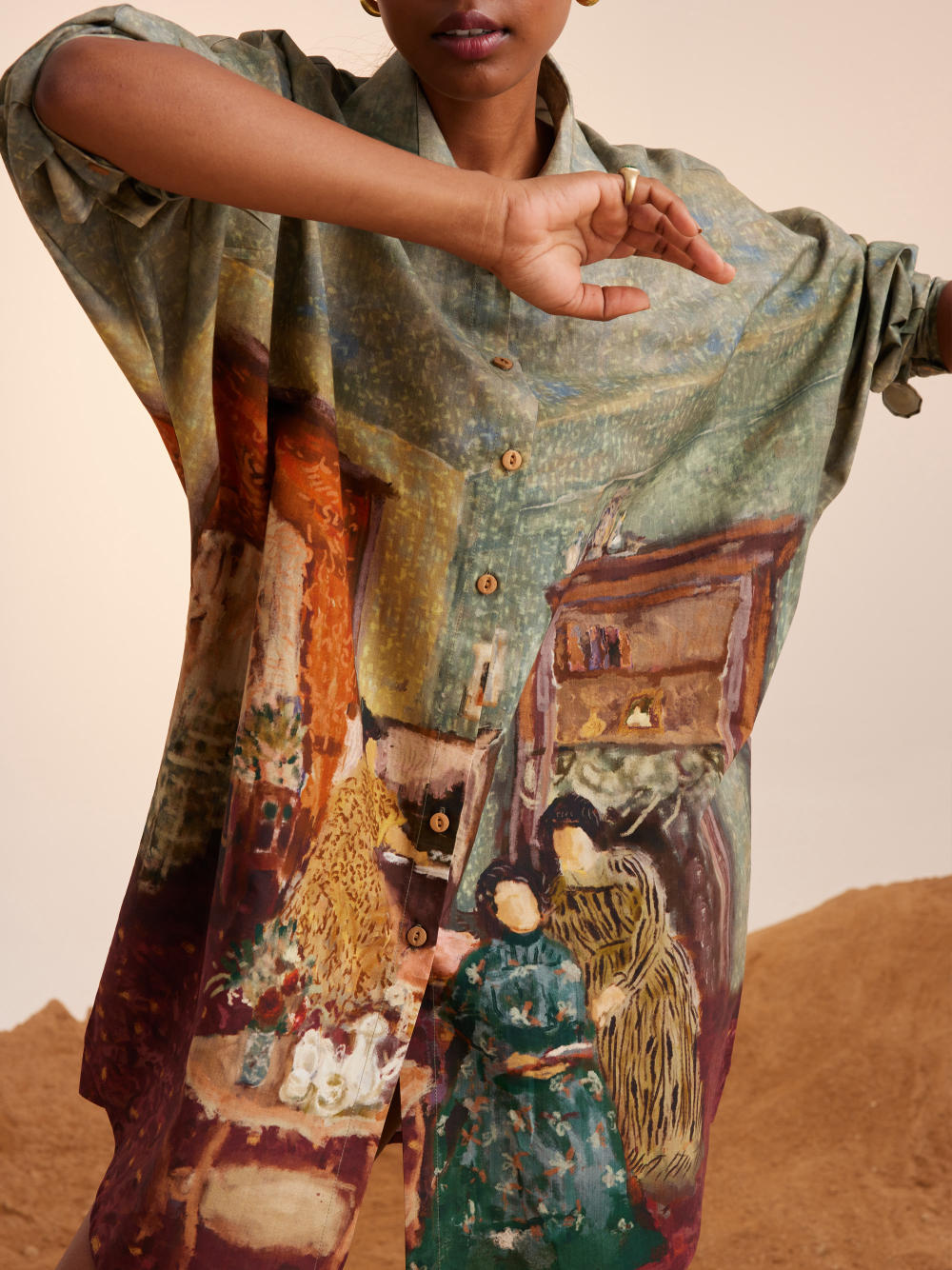 We are talking comfort with a hint of eternal style in cotton poplin when it comes to the Como Long shirt. Reflecting scenic escapades from nature, this shirt-dress is made in a one-size fit all silhouette with droopy shoulders. With full sleeves and a mid-thigh length, the shirt dress features round-flat shirt collars and a front opening with wooden buttons. The organic nature of the fabric promises breathability and falls light on the body naturally. The boxy silhouette can be tapered around the waist with a belt or a crossbody bag to accentuate the look.