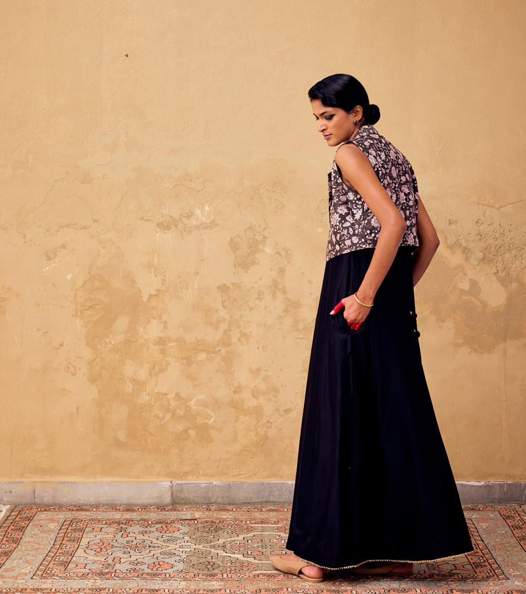 Halter neck maxi dress with adjustable string fastening at the back and bijiya gota detailing in the hemline crafted in chanderi fabric, Paired with a charcoal block printed bolero jacket in chanderi fabric