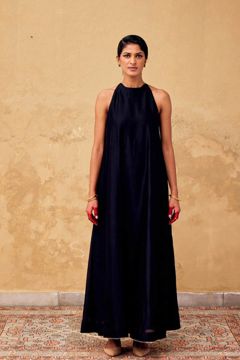 Halter neck maxi dress with adjustable string fastening at the back and bijiya gota detailing in the hemline crafted in chanderi fabric.