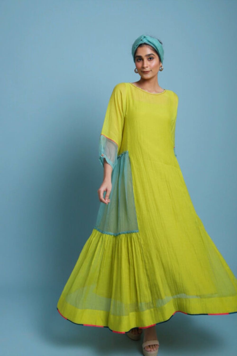 Yellow Dress detailed with Blue Organza striped Side Panel embellished with Dori work and contrast Silk detialing.