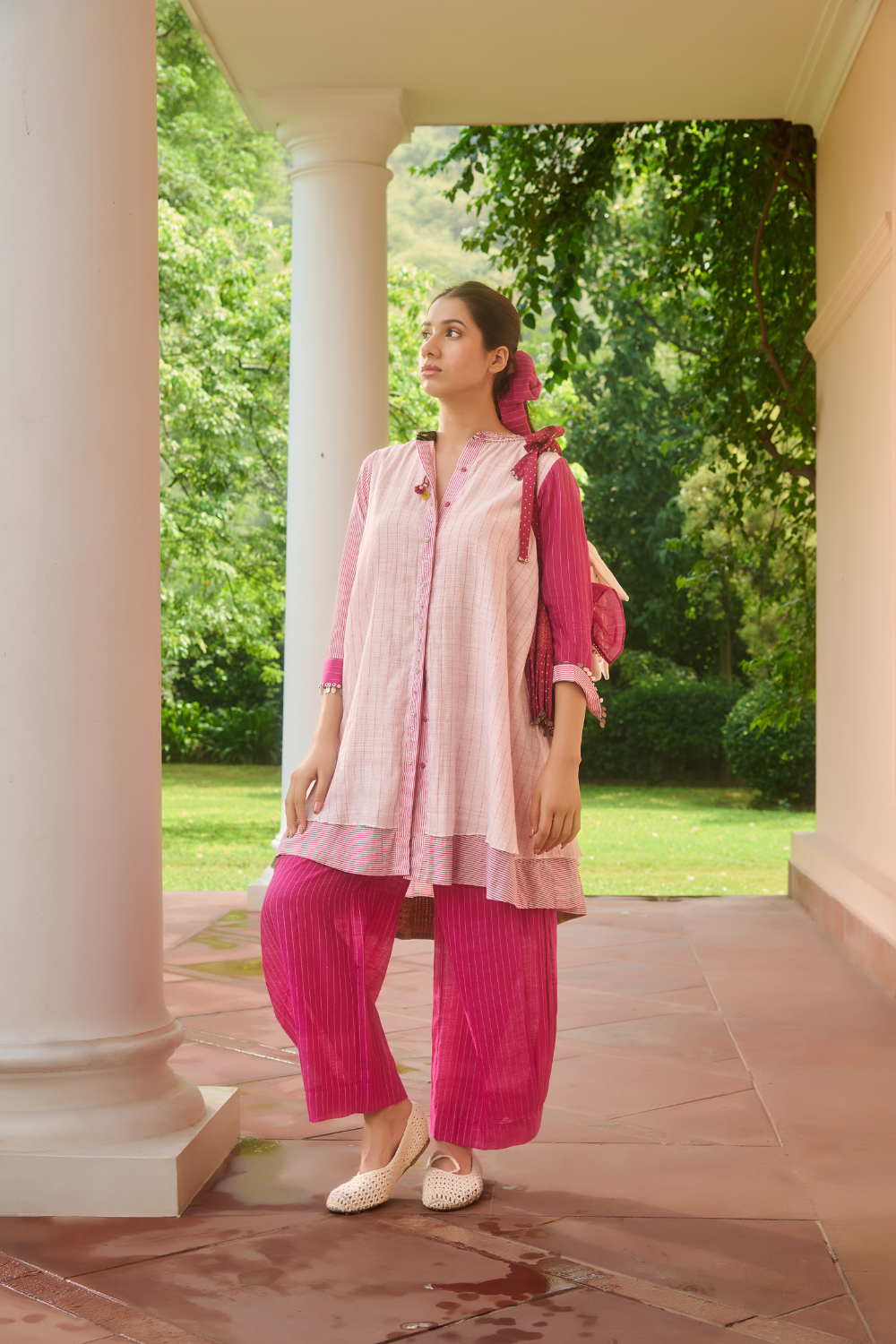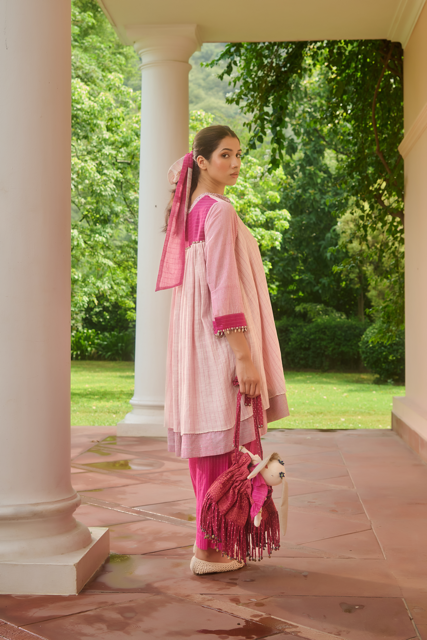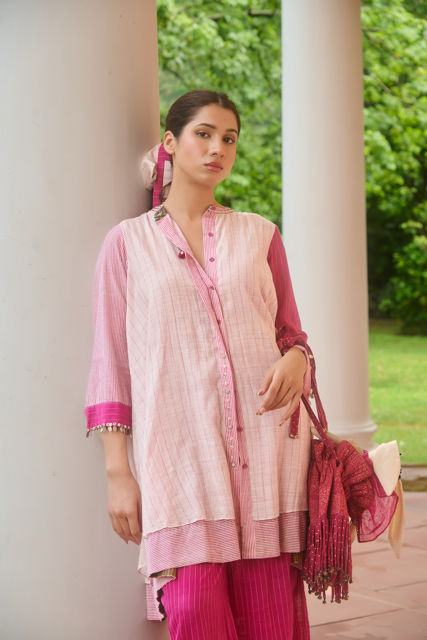 Handwoven Yarn Dyed Silk/Cotton Stripe & 100% Cotton, layered front open Dress with hand block printed inner layer, embellished with hand done beadwork.