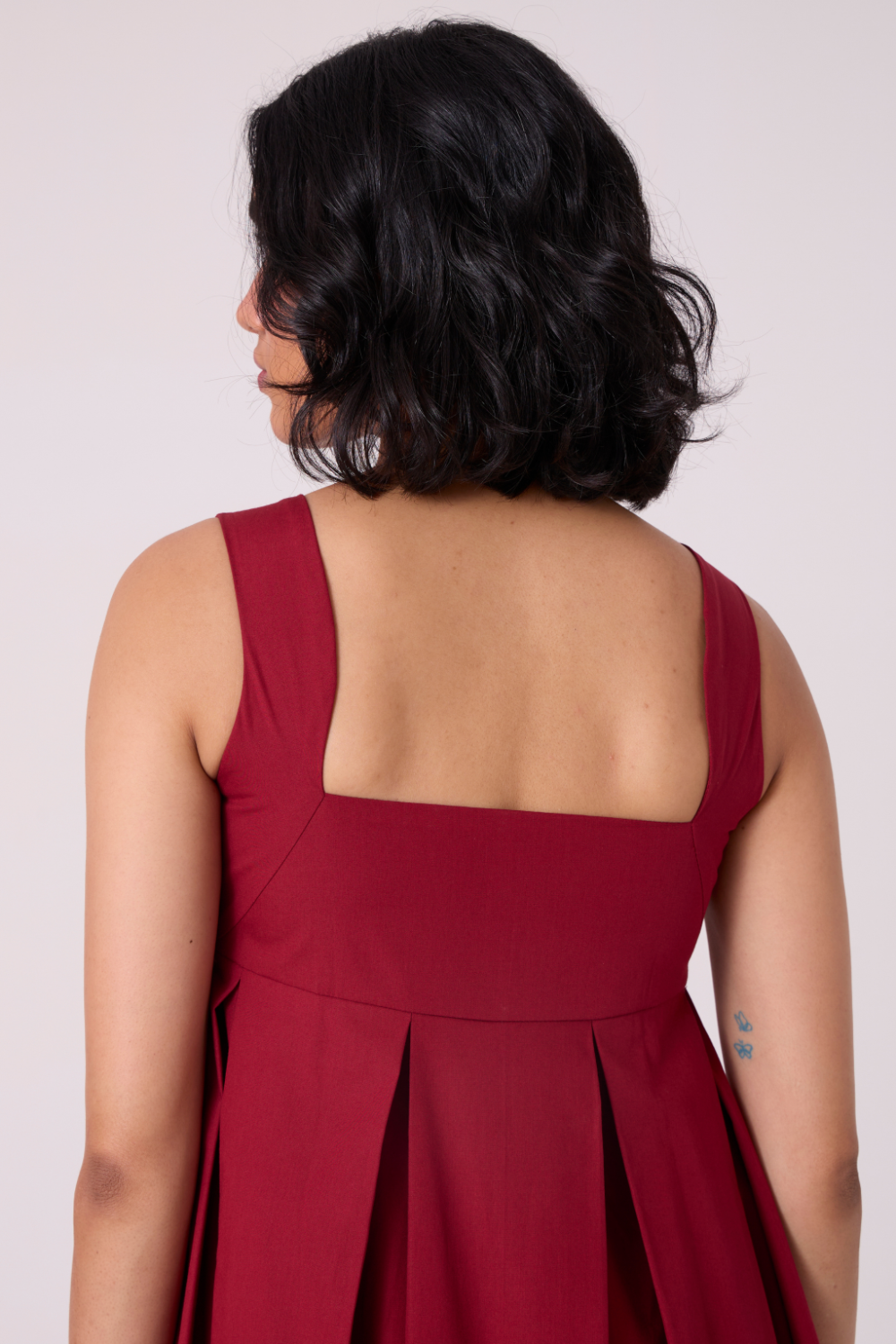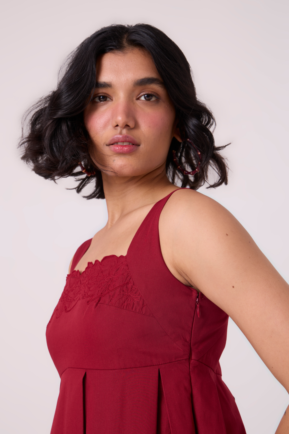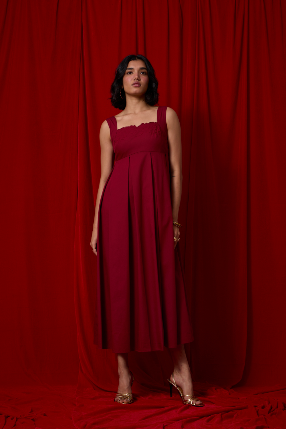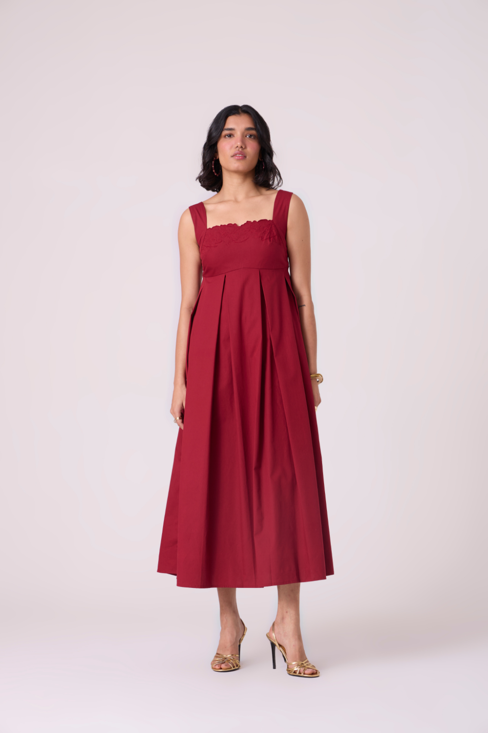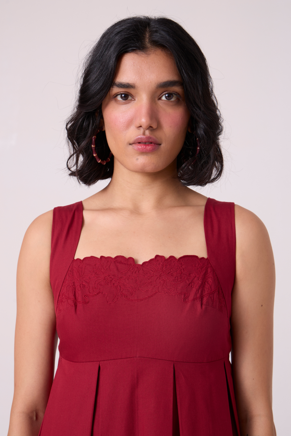 A structured sleeveless silhouette with a confident embroidered neckline. Box pleats open into soft volume, balancing form and ease.
