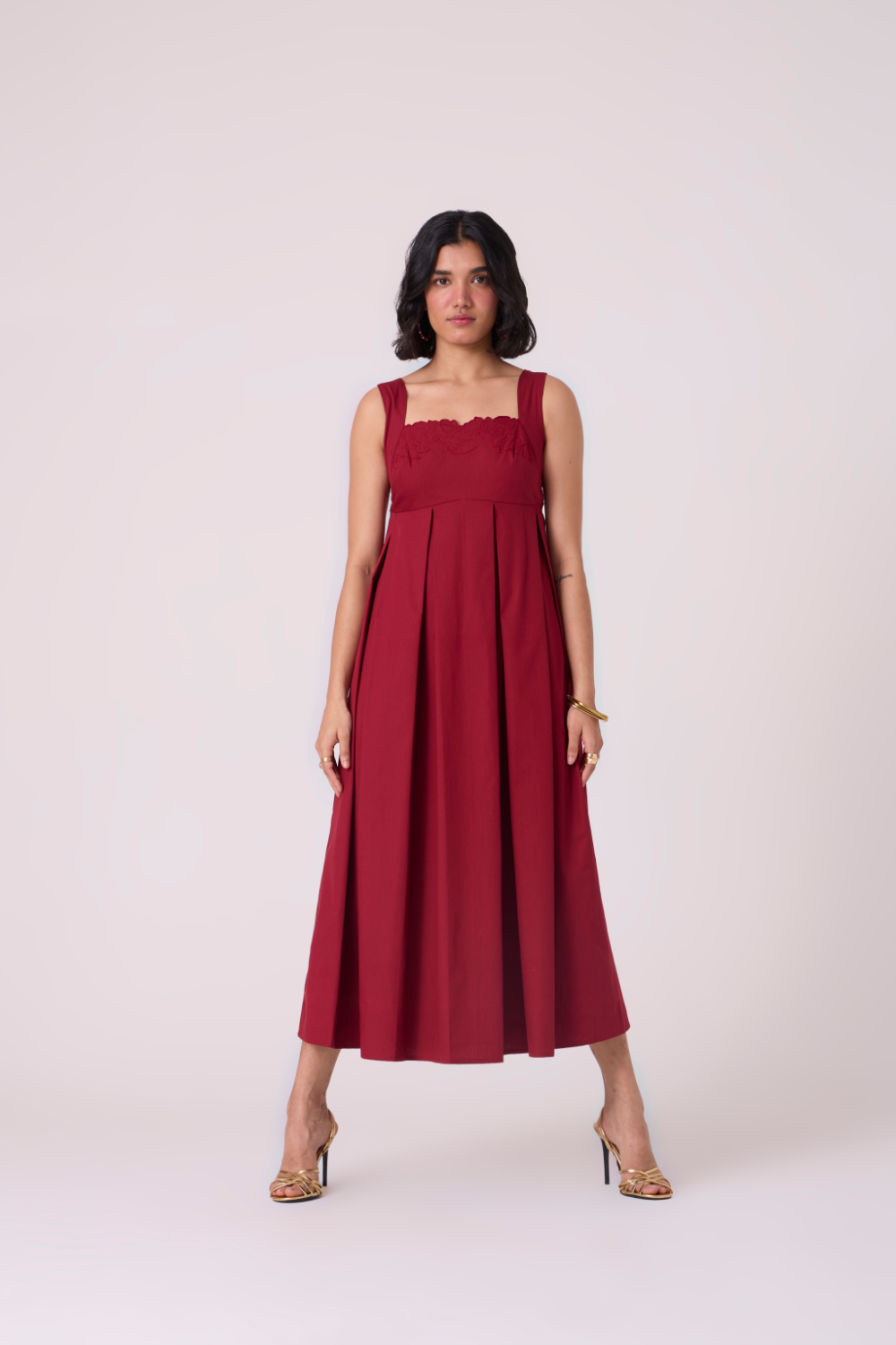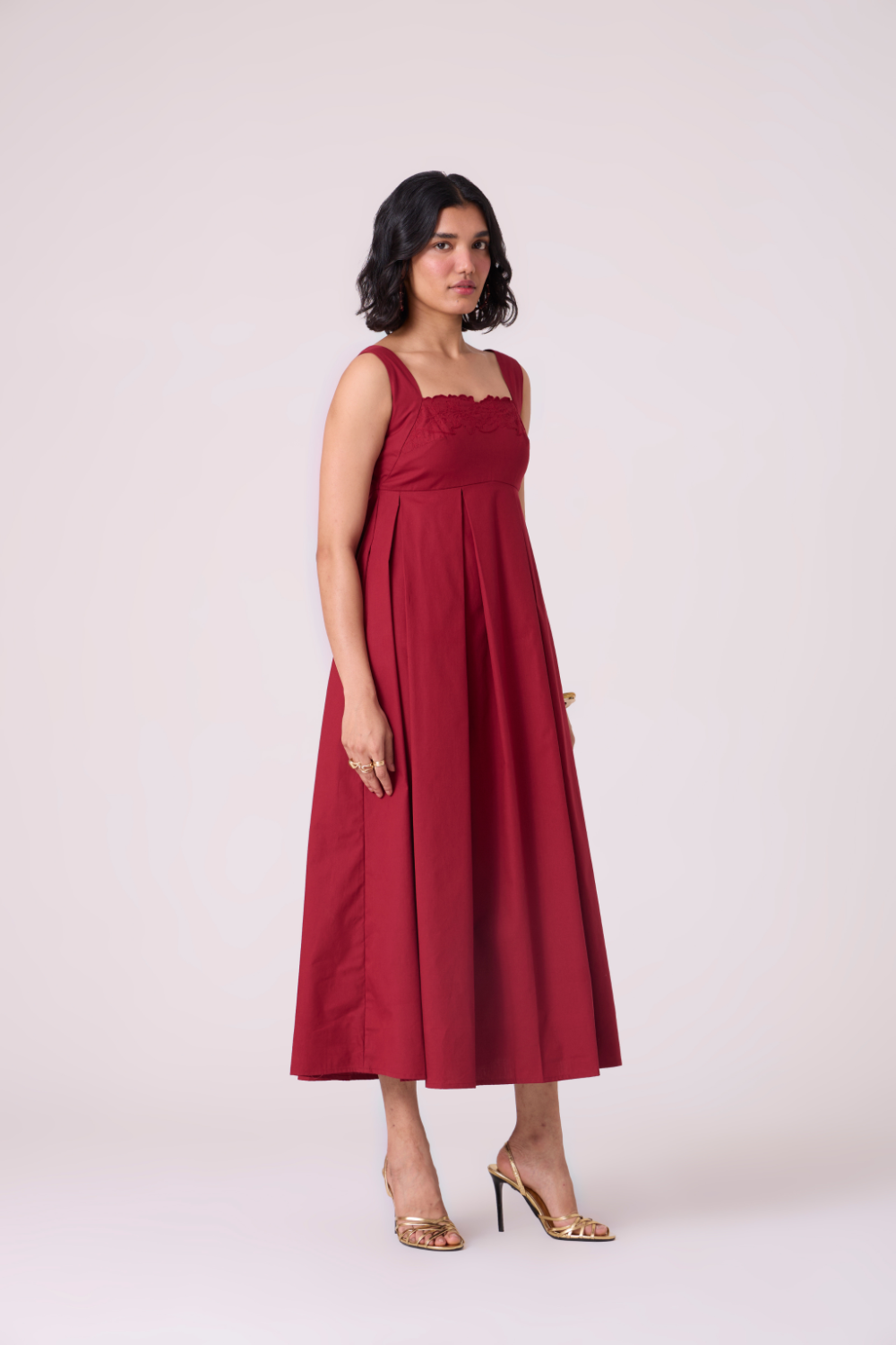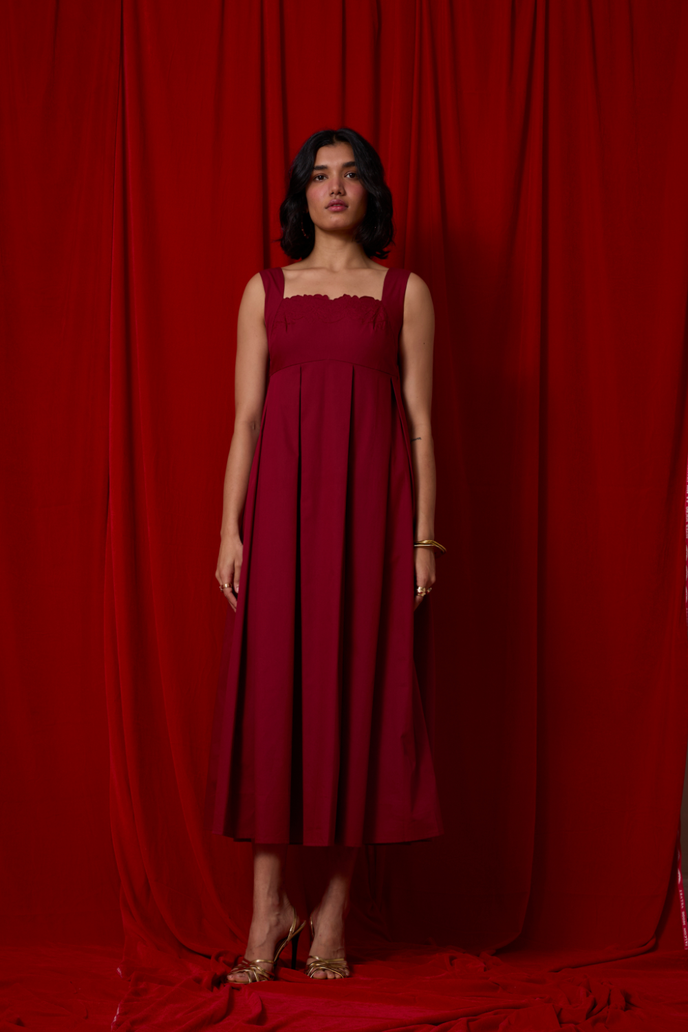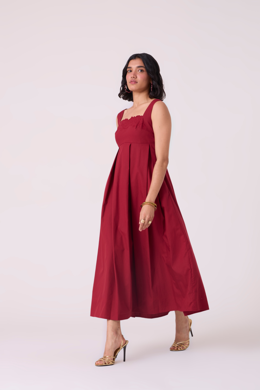 A structured sleeveless silhouette with a confident embroidered neckline. Box pleats open into soft volume, balancing form and ease.