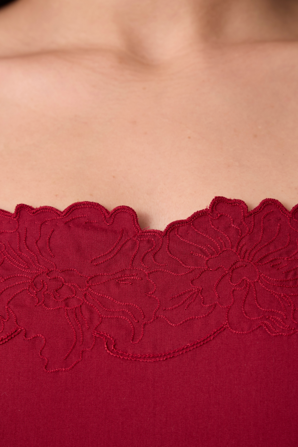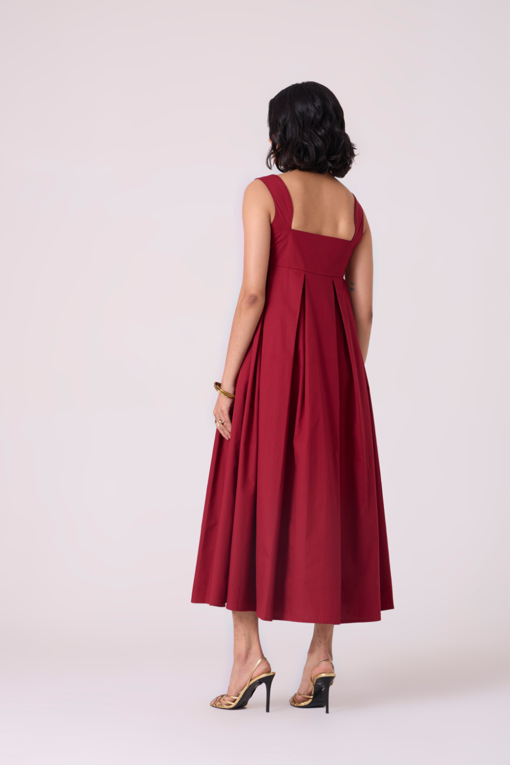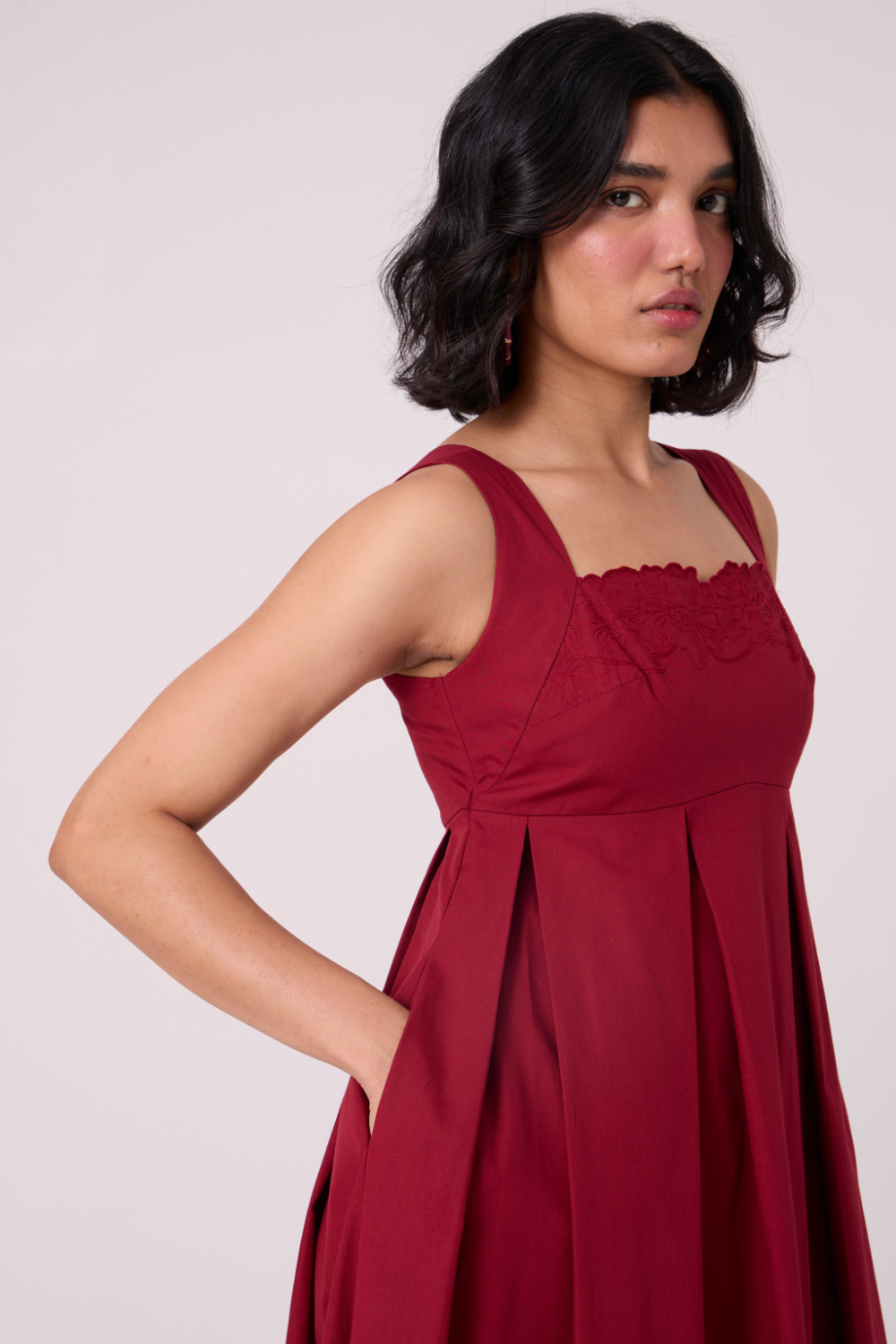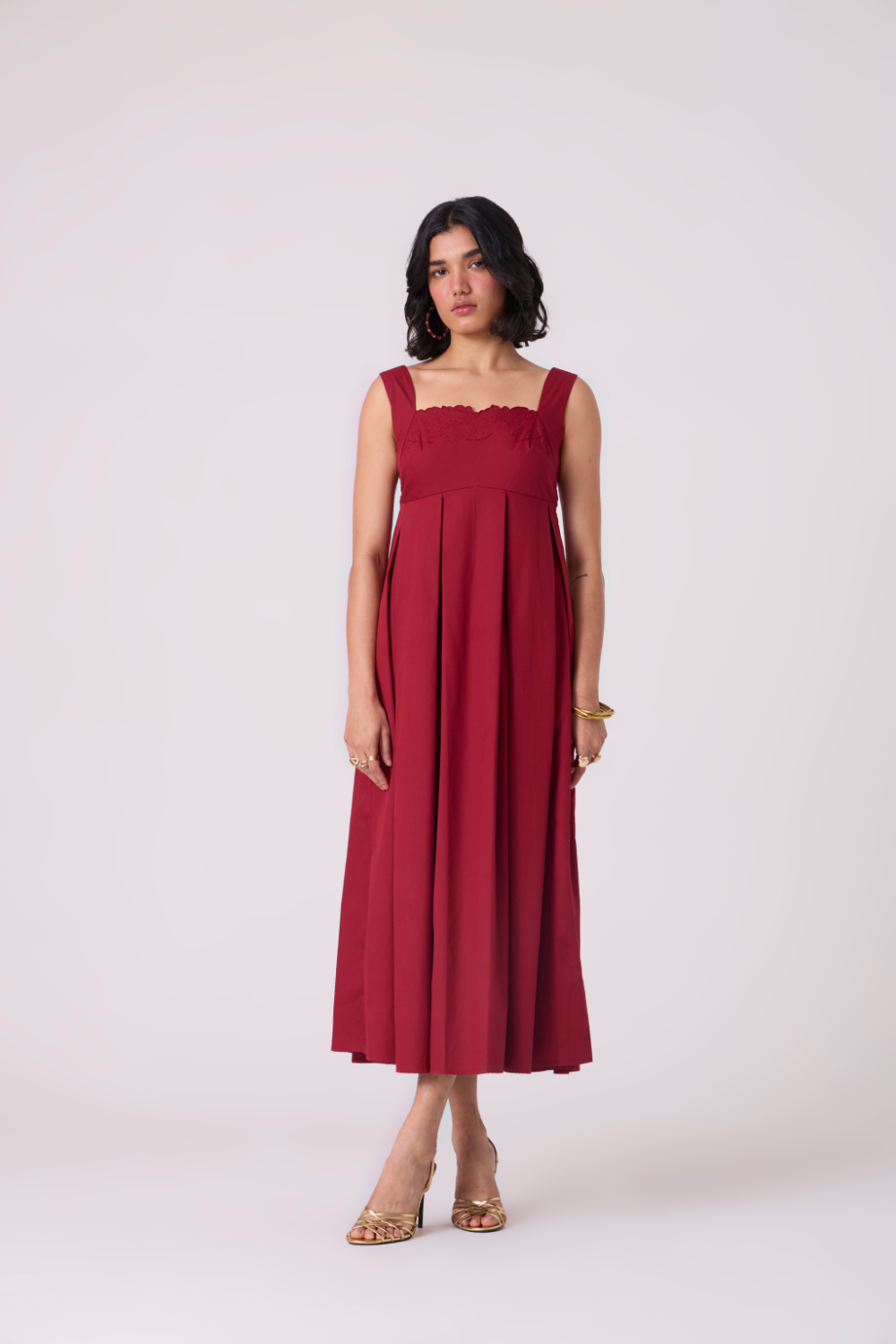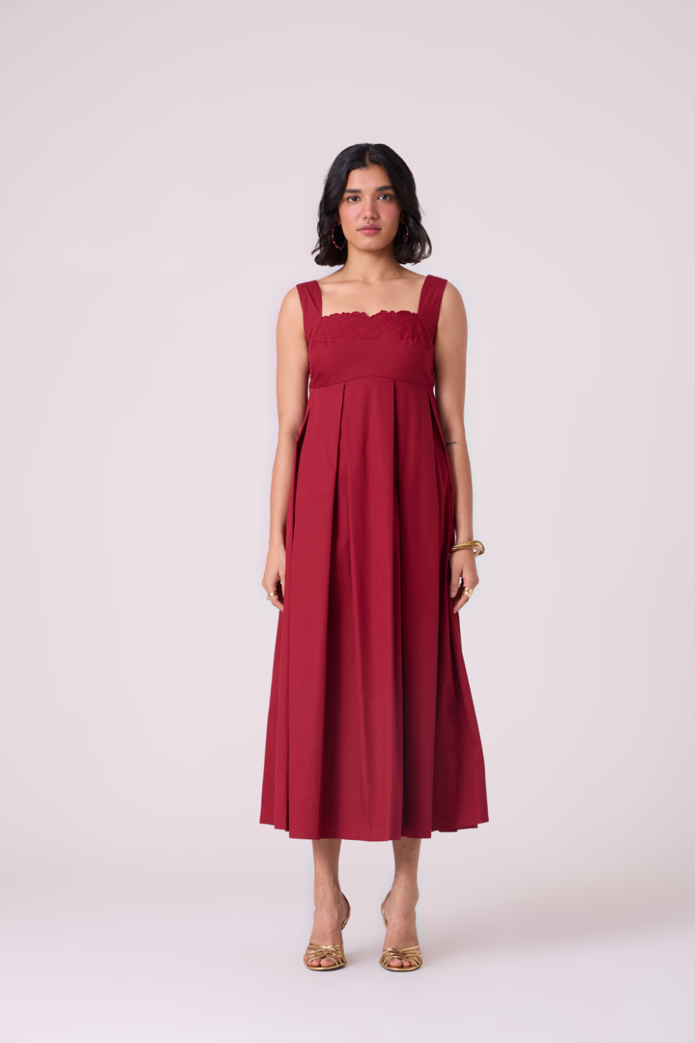 A structured sleeveless silhouette with a confident embroidered neckline. Box pleats open into soft volume, balancing form and ease.