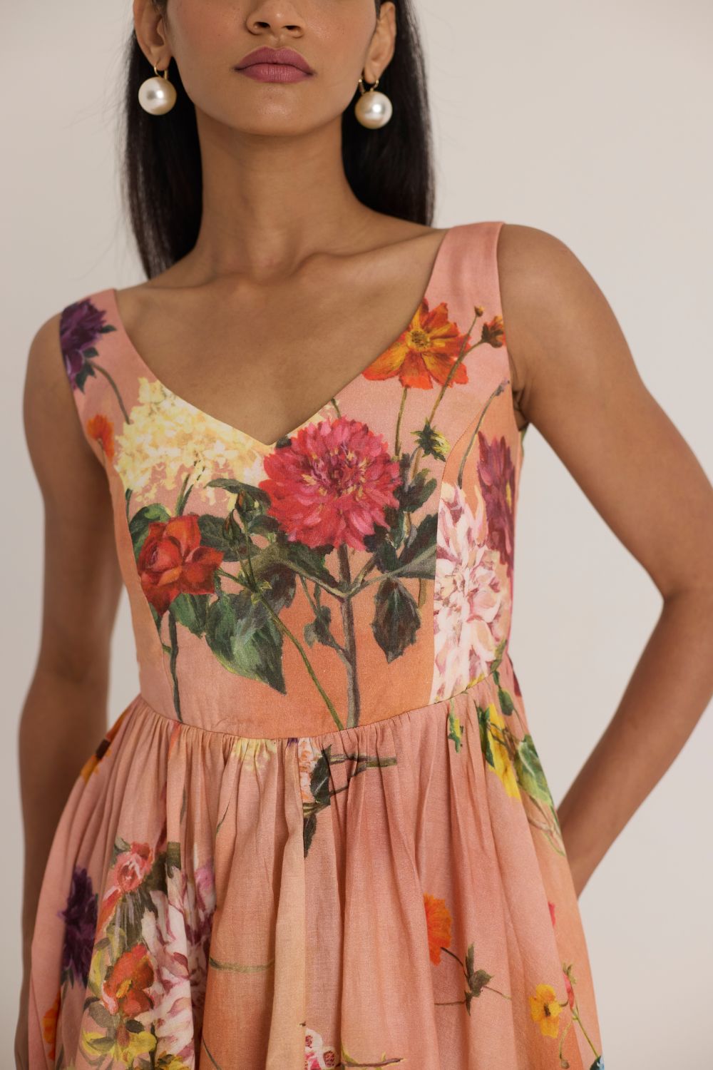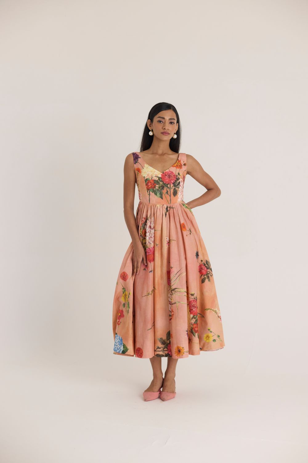 A romantic botanical bloom print that captures the essence of a flourishing garden. Set on a warm blush-toned base, this delicate floral arrangement features lifelike blossoms in vibrant hues of red, white, and blue, accented with intricate green foliage. The print exudes a soft vintage charm while maintaining a modern aesthetic Striking abstract floral print.