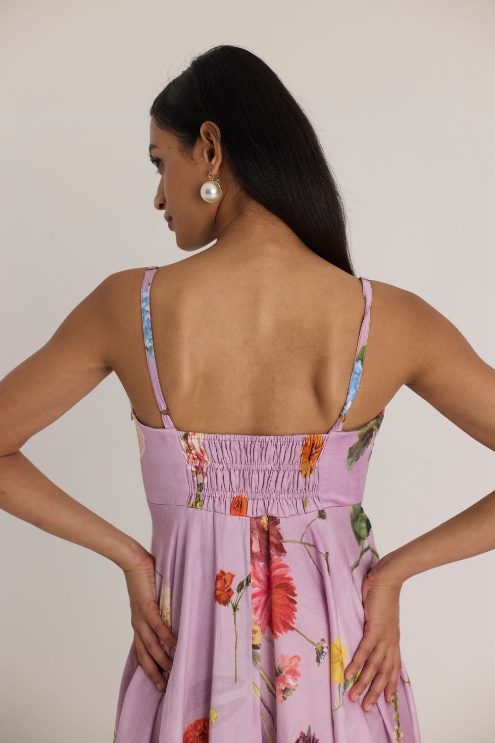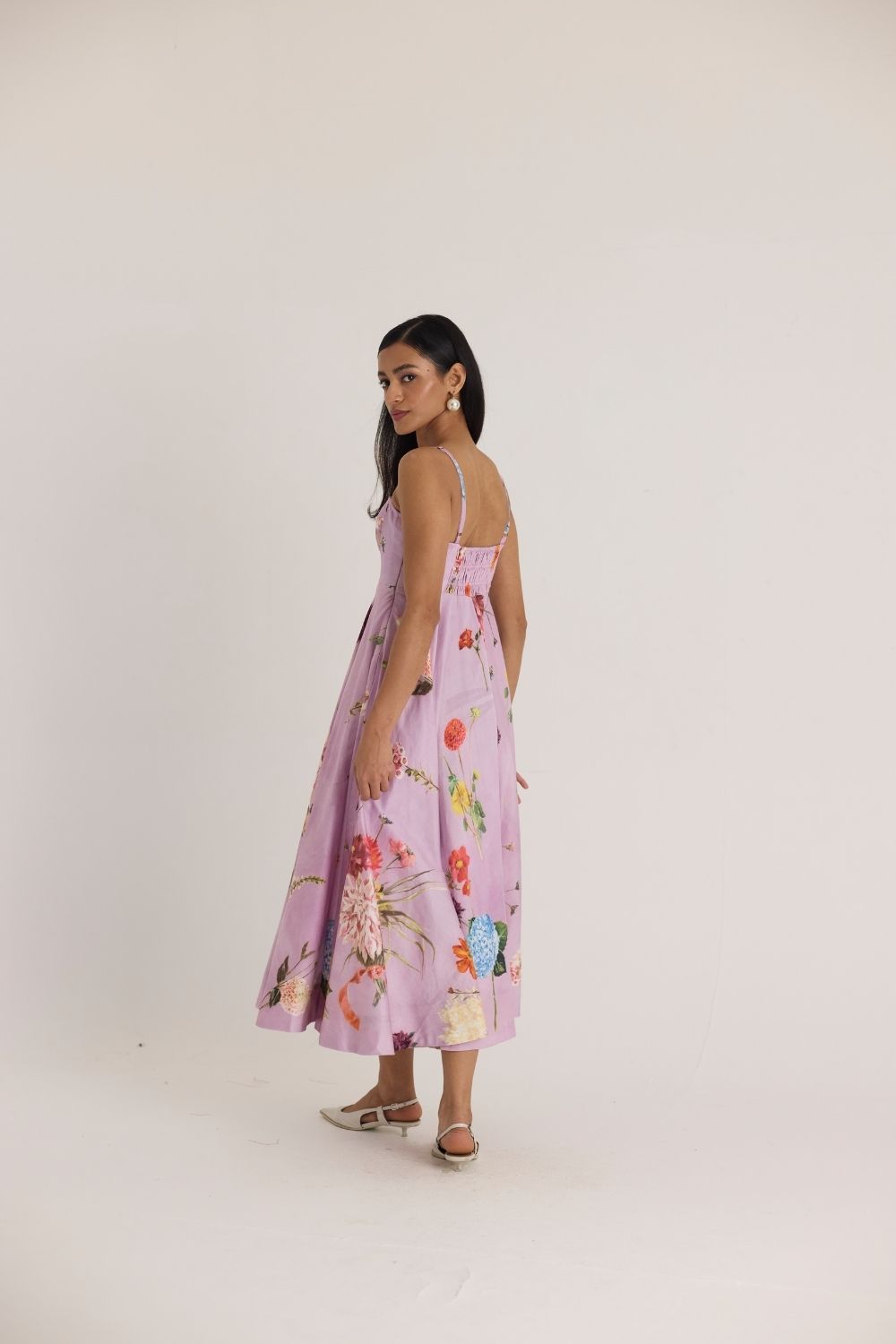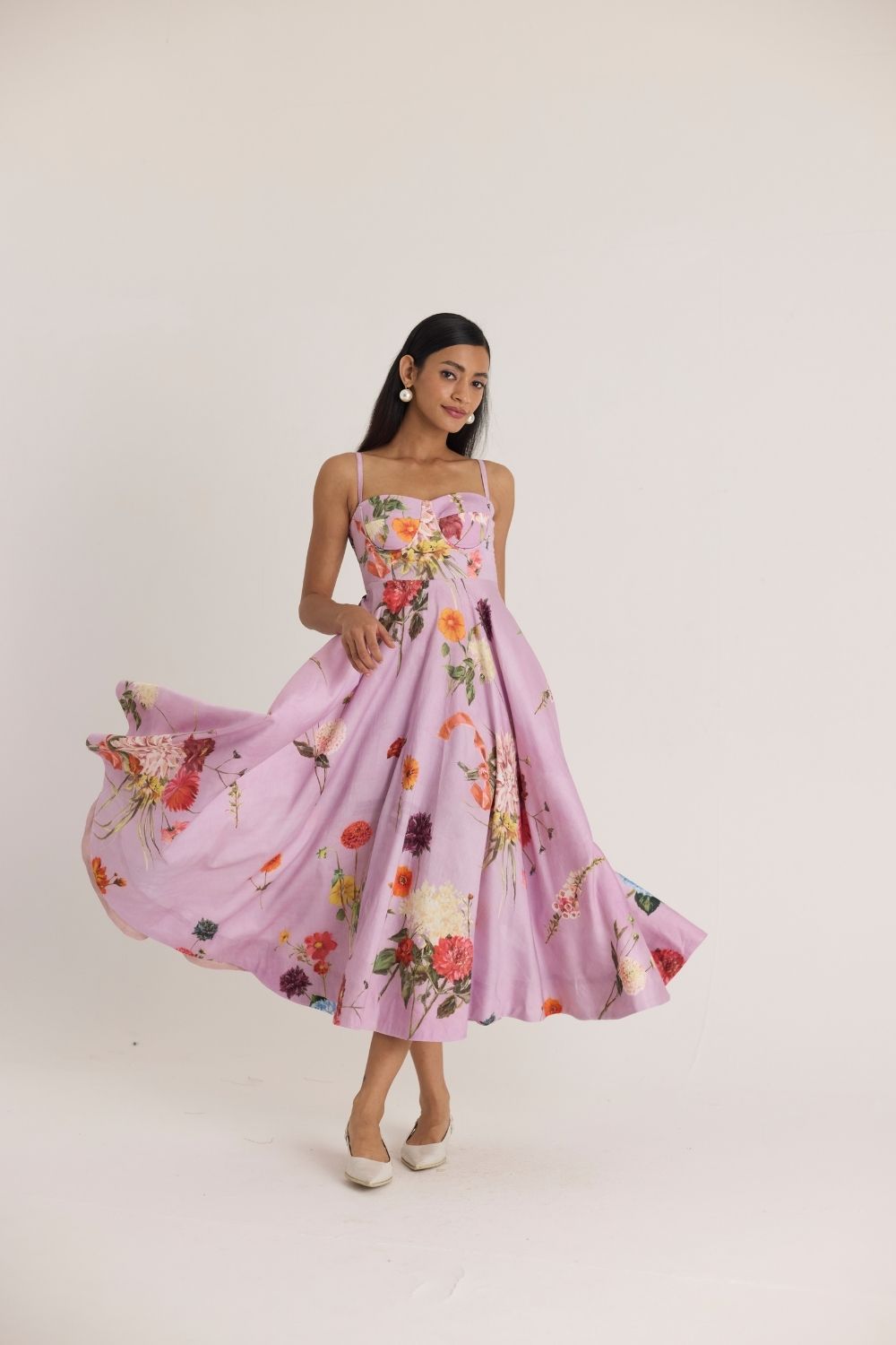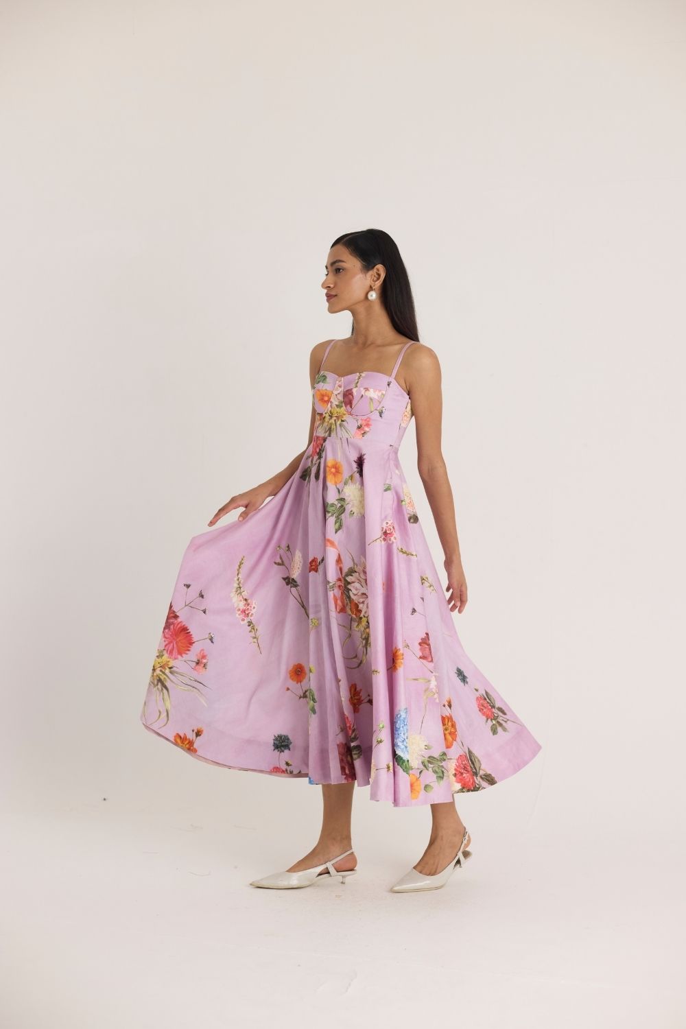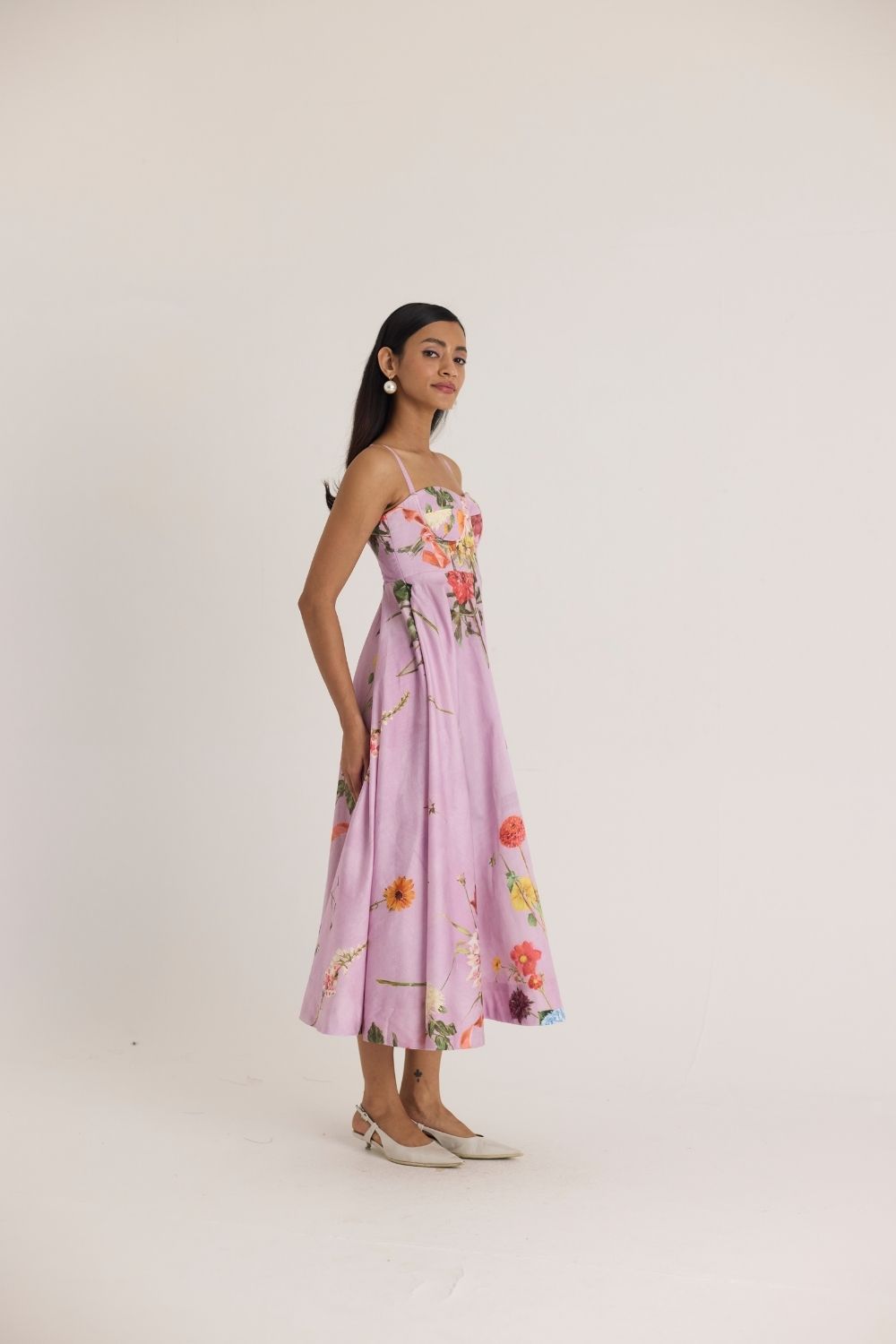 A dreamy lilac midi dress featuring a vibrant floral print inspired by spring blossoms. The fitted bustier bodice enhances the silhouette, while the flared skirt adds graceful movement.