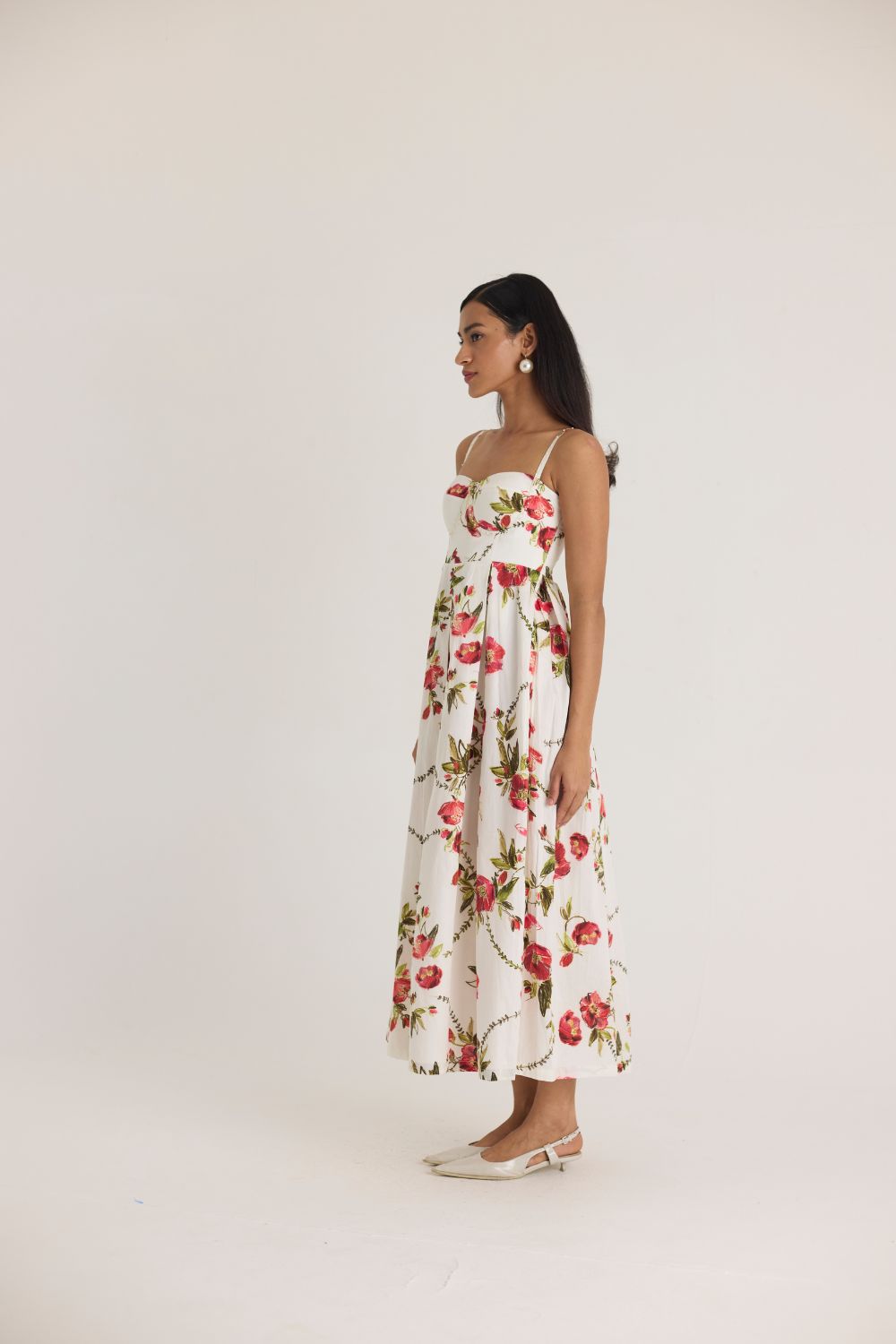 A dreamy, feminine midi dress adorned with delicate red and pink florals on a crisp white base. The structured bodice with a sweetheart neckline and adjustable straps offers a flattering fit, while the pleated skirt adds volume and movement, making it perfect for both daytime elegance and evening soirées.