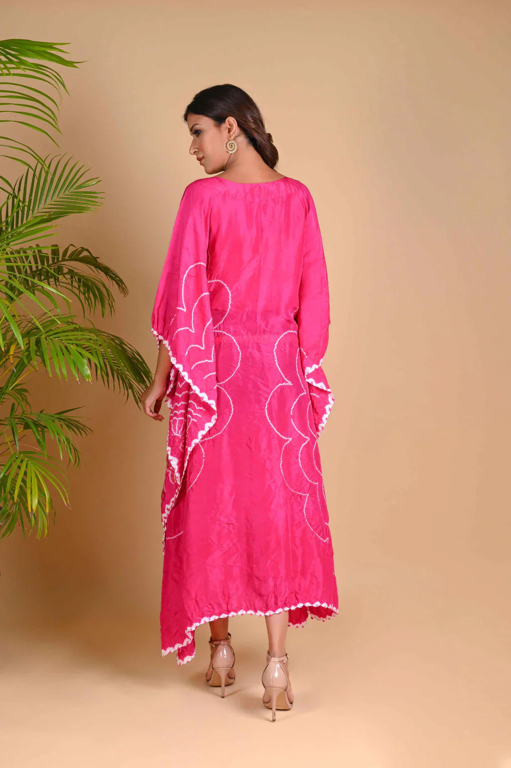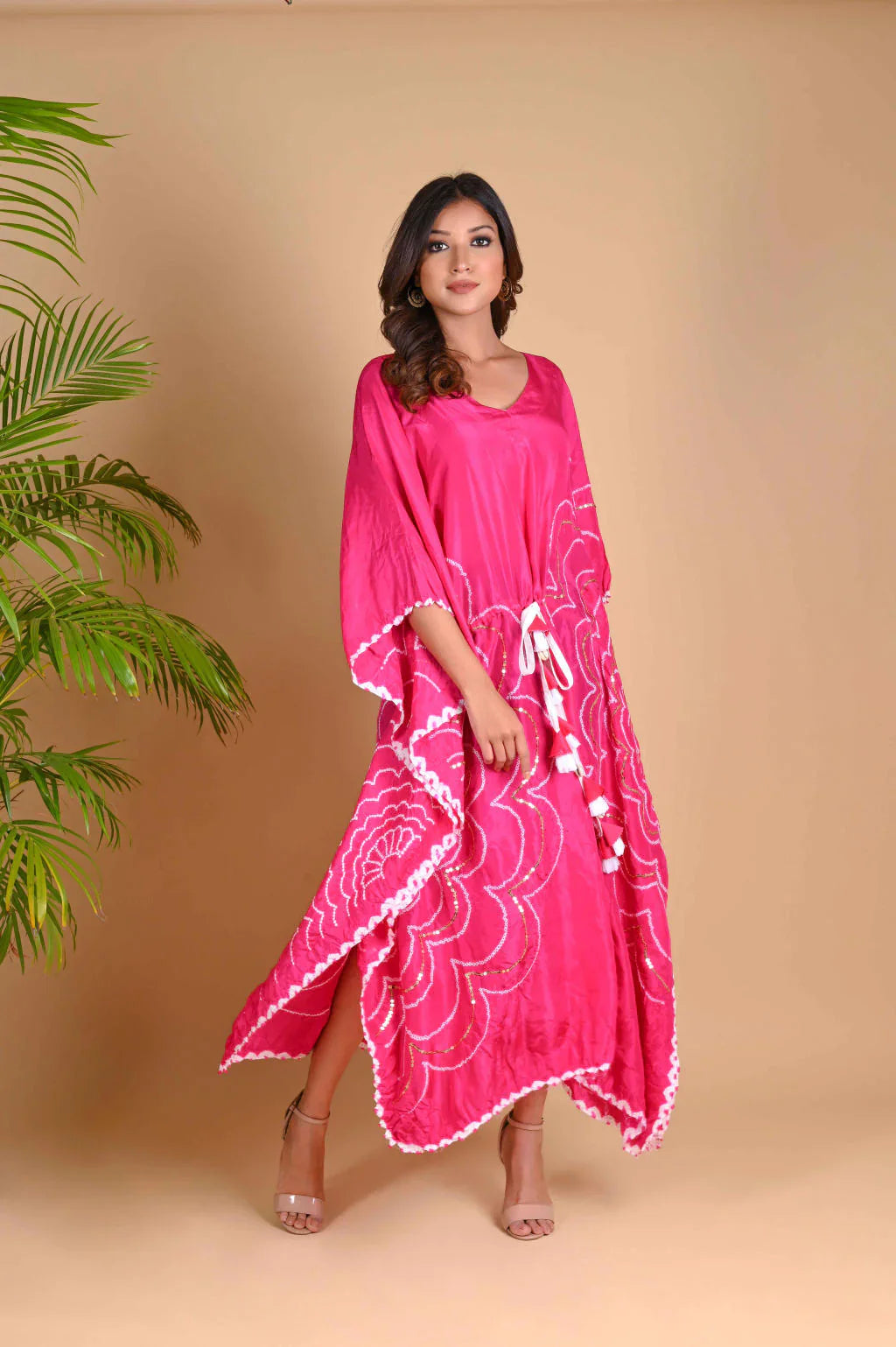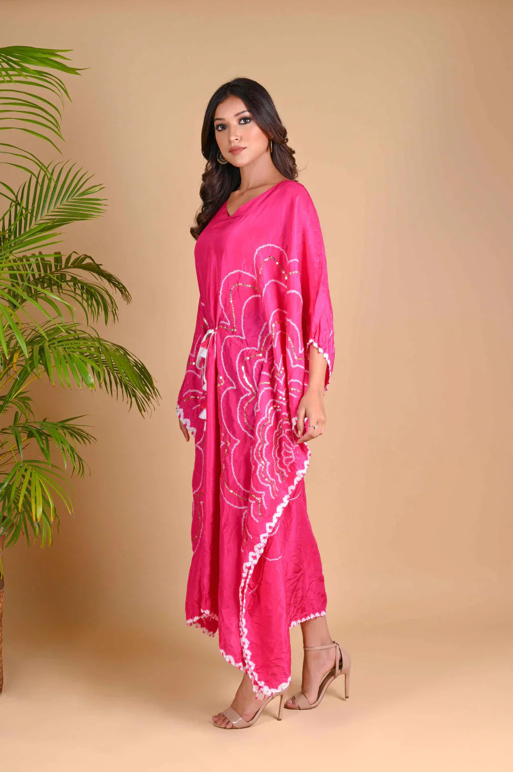 Bandhani flower motifs placed on either side of the kaftan are highlighted with sequence. The drawstring at the waist has handmade tassle and shell details.