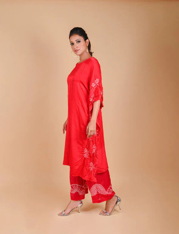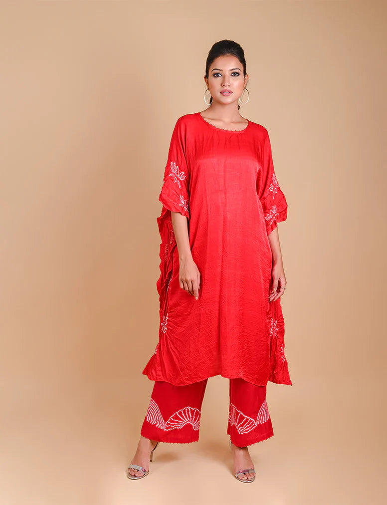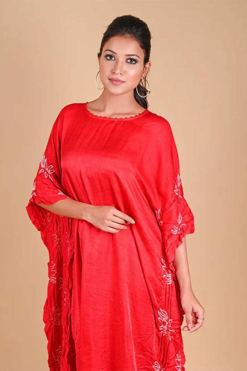 Fine lotus motif in Bandhani on the sides of the kaftan with neck details (beads)