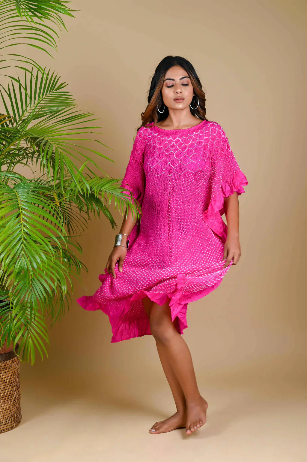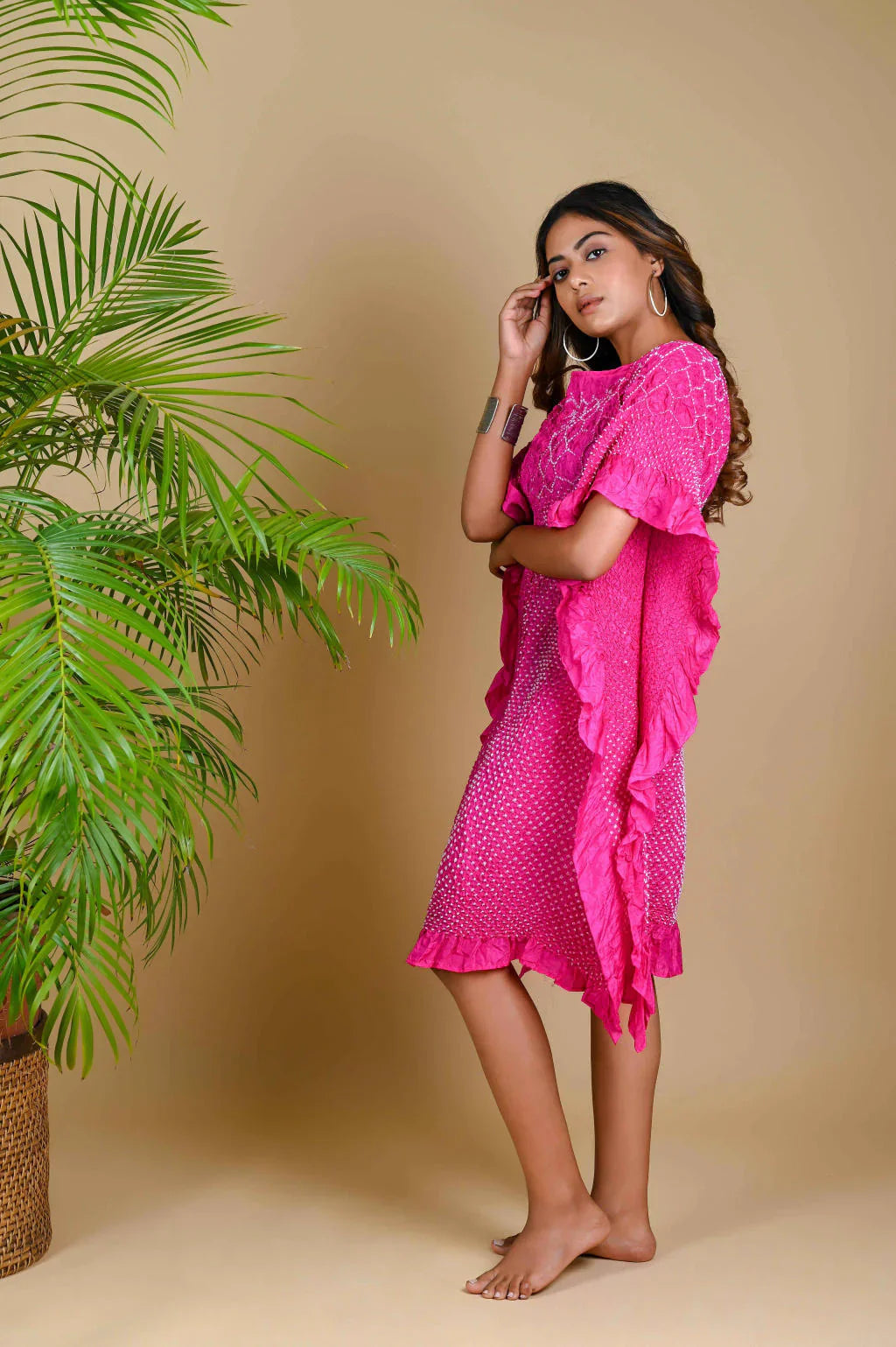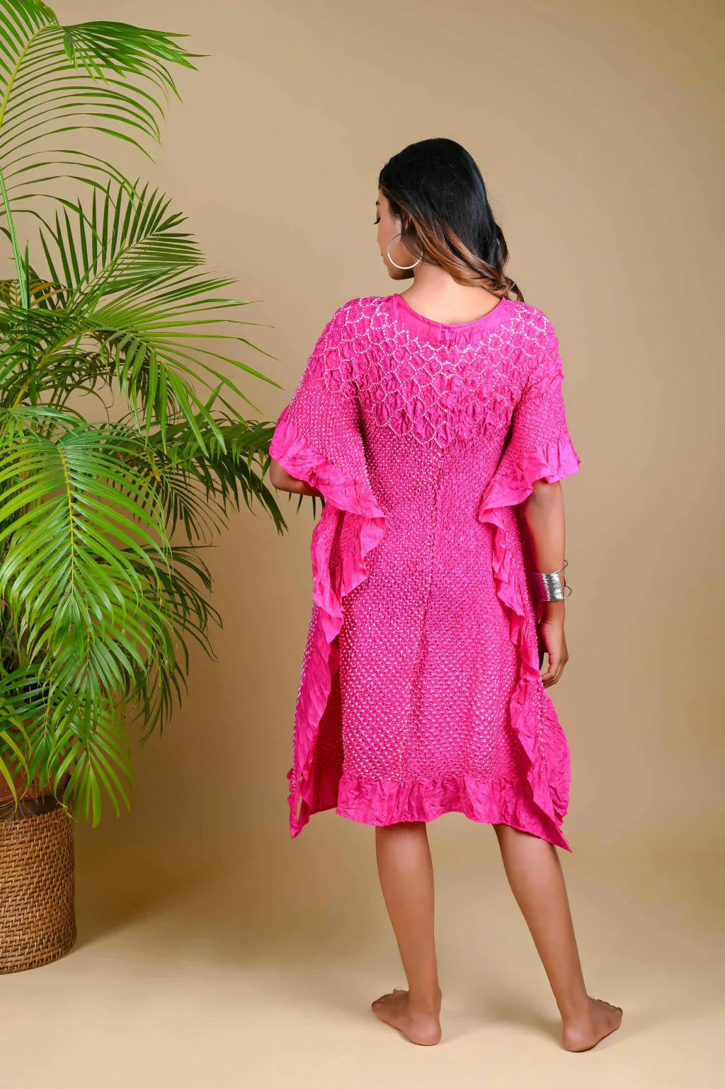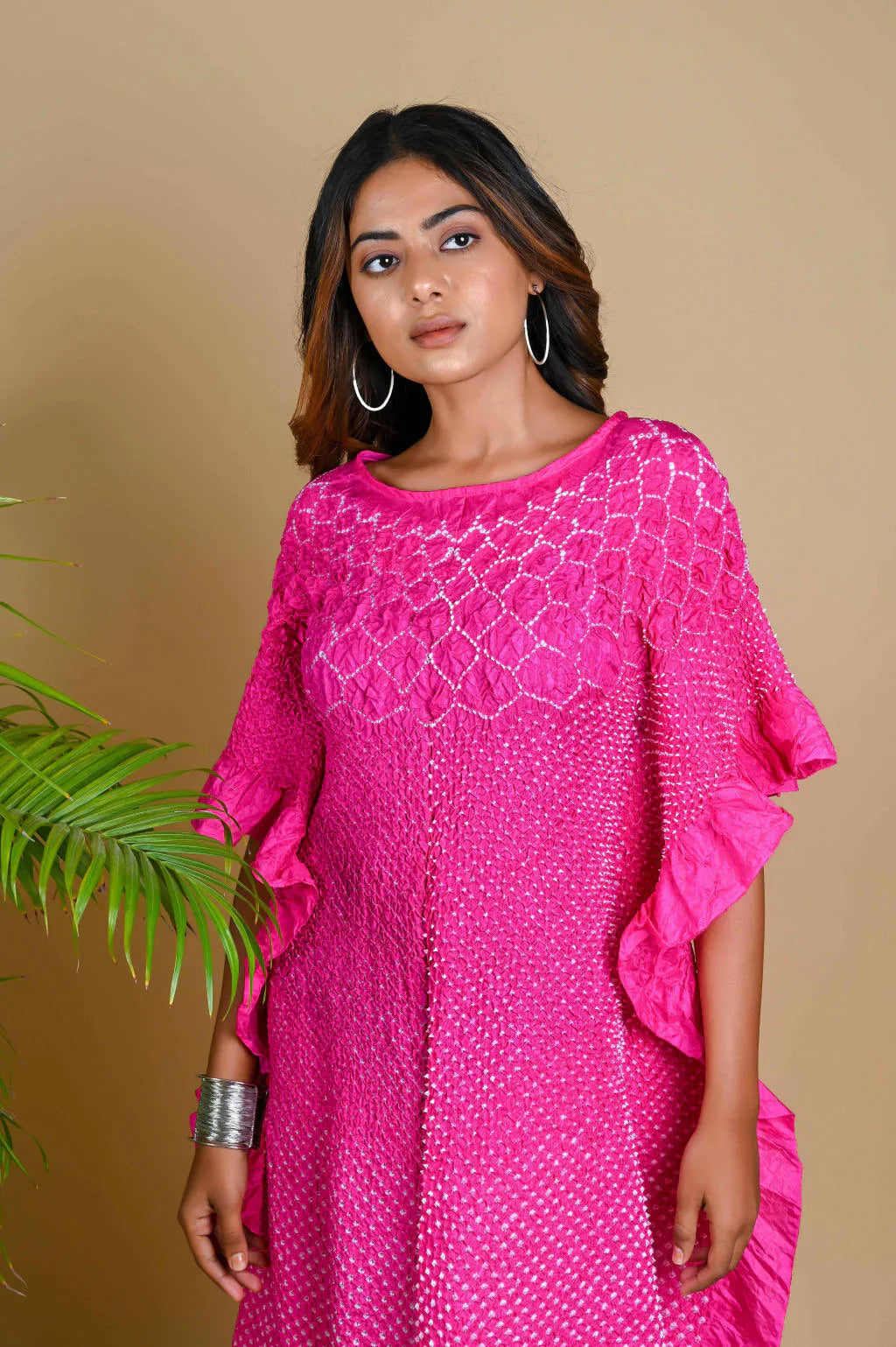 Our signature Kaftan with a custom flower pattern neckline in Bandhani. This versatile garment can be worn as is or teamed with pants.