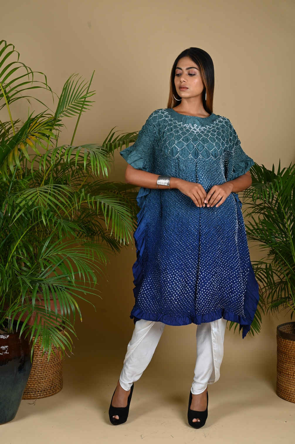 Our signature Kaftan with a custom flower pattern neckline in Bandhani. This versatile garment can be worn as is or teamed with pants.
