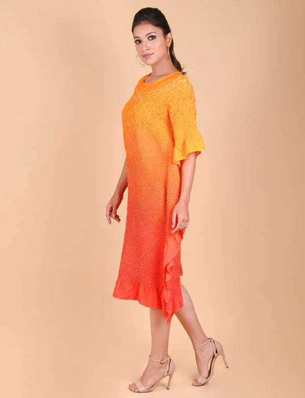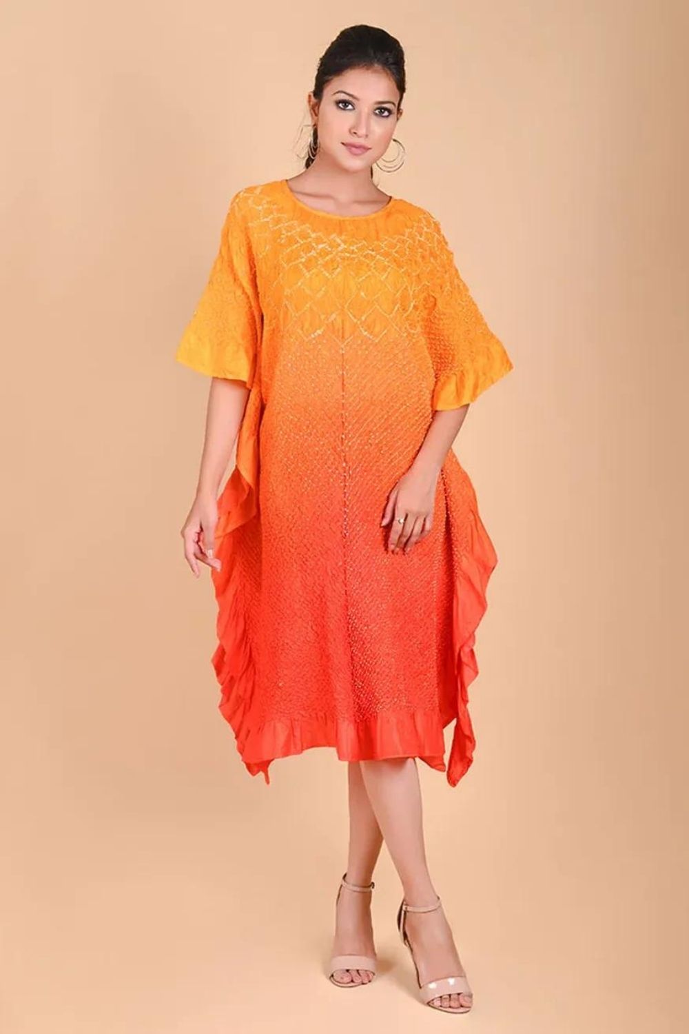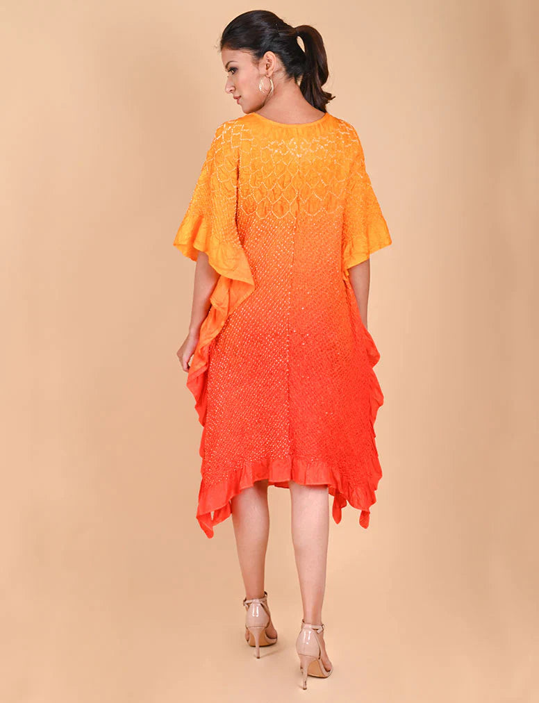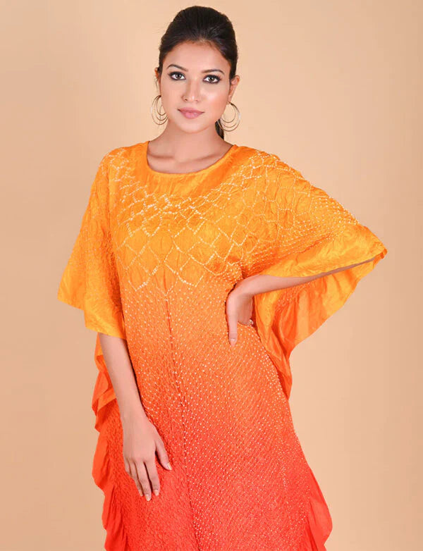 Our signature Kaftan with a custom flower pattern neckline in Bandhani. This versatile garment can be worn as is or teamed with pants.