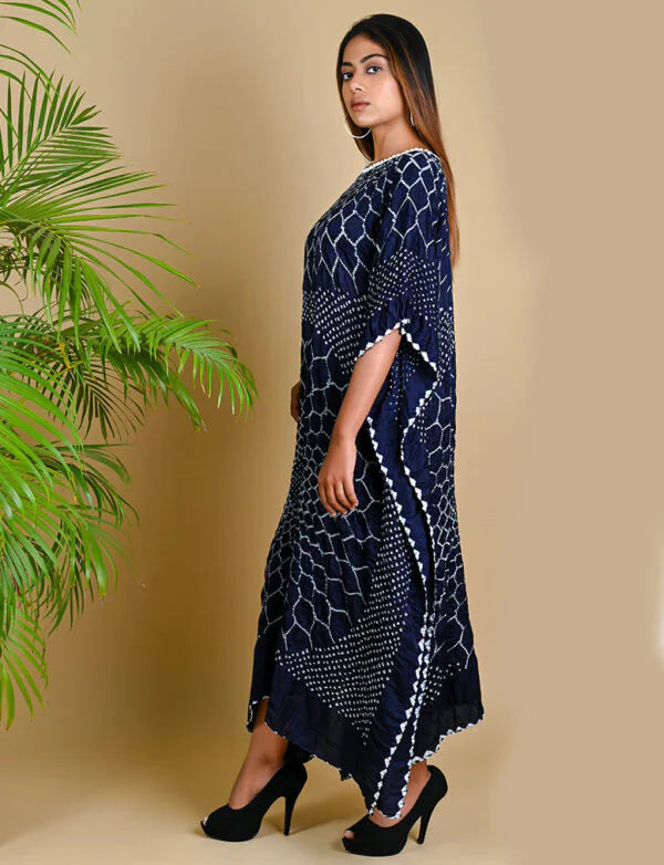 Kaftan with 3 flowers in the Bandhani pattern and handmade silk buttons along the neckline.
