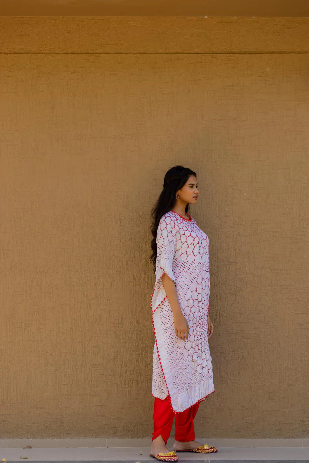 Kaftan with 3 flowers in the Bandhani pattern and handmade silk buttons along the neckline.