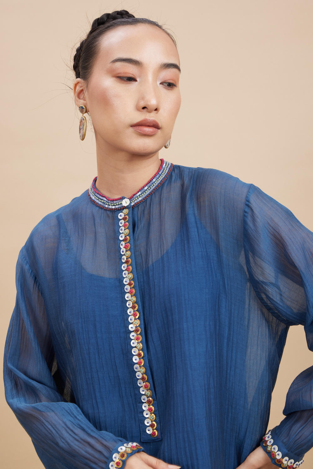 Aavidi’s language is one of soft architecture: silhouettes that breathe, fabrics that hold memory, and surface techniques — from clamp dyeing to block printing — that carry the imprint of time. Here, simplicity isn’t minimalism; it’s clarity. A grounding. A return.