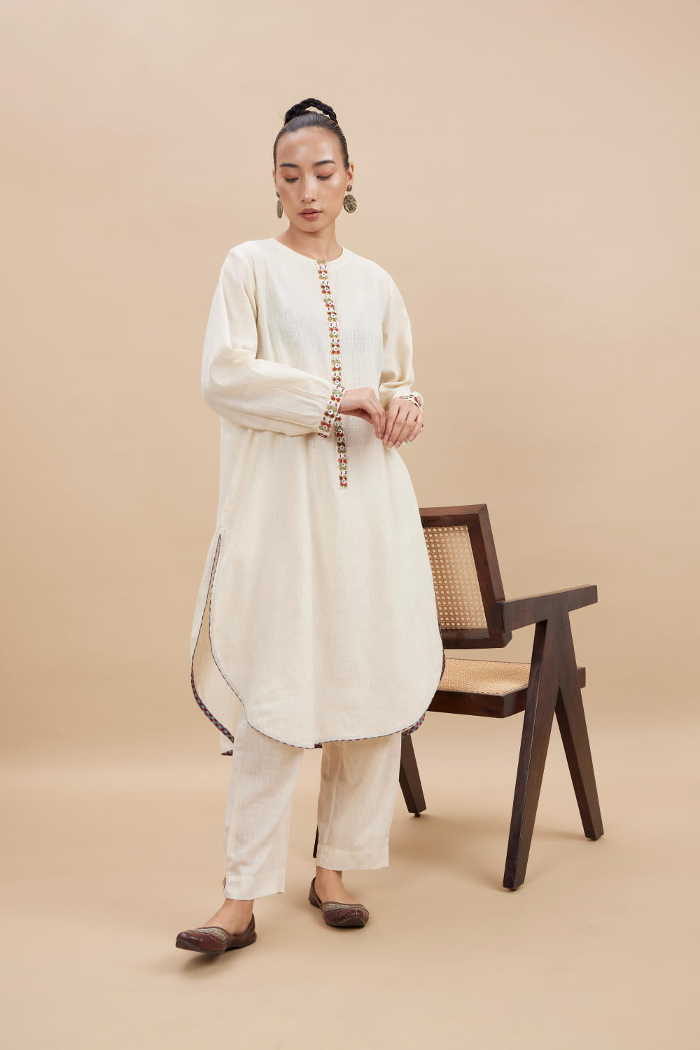 At Canvas & Weaves, we see Aavidi as part of a larger conversation about what it means to dress with intention. These are pieces for women who desire ease without erasing elegance — garments that serve, move, and accompany rather than dictate. Aavidi’s kalidaar kurtas, finished with delicate sacha gota work, exemplify this balance. Classic lines meet modern restraint, pairing effortlessly with salwars adorned in thoughtful gota motifs.