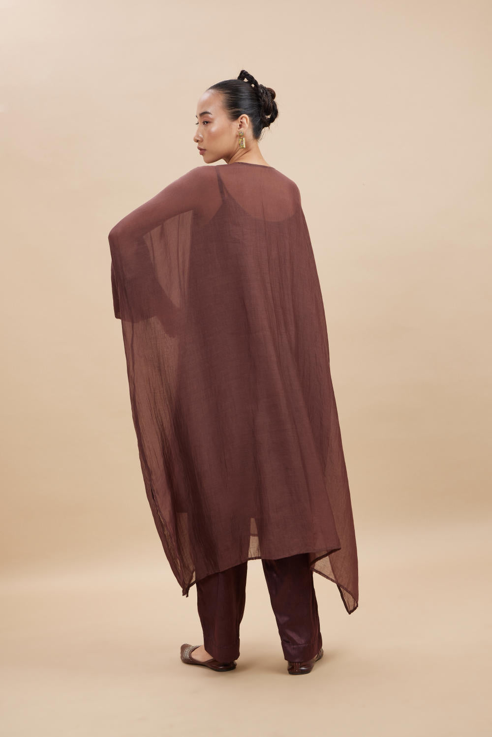 Aavidi’s language is one of soft architecture: silhouettes that breathe, fabrics that hold memory, and surface techniques — from clamp dyeing to block printing — that carry the imprint of time. Here, simplicity isn’t minimalism; it’s clarity. A grounding. A return.