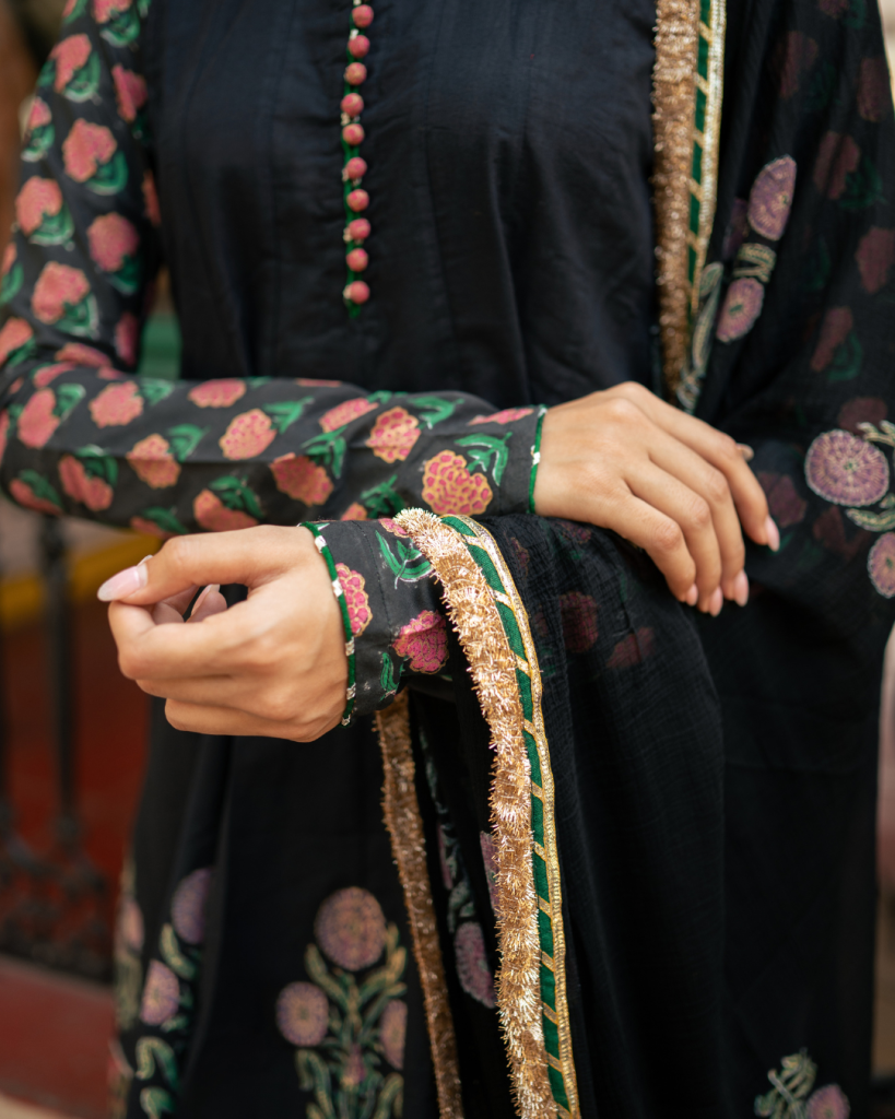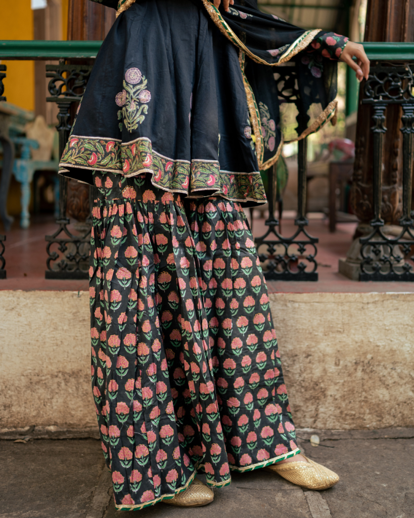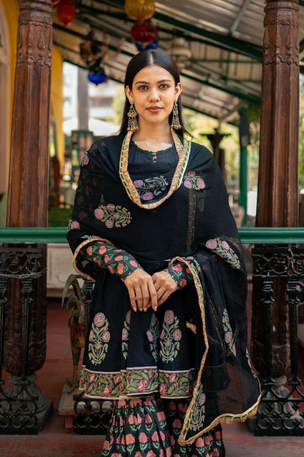 Our Black Block Printed Sharara Set is gracefully paired with a matching sharara, featuring traditional motifs and rich colours for a touch of ethnic elegance.