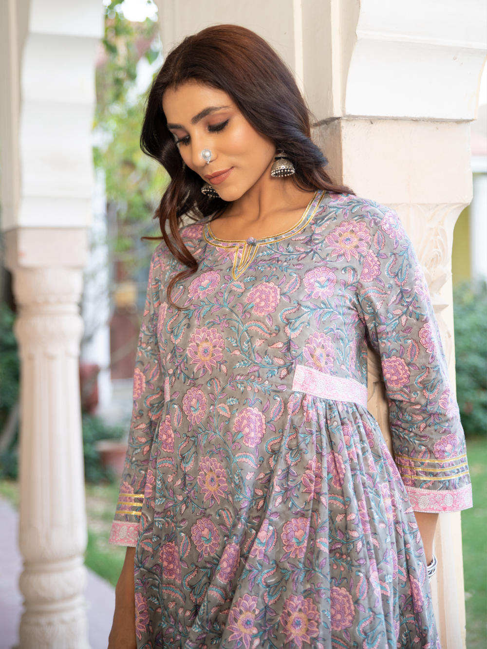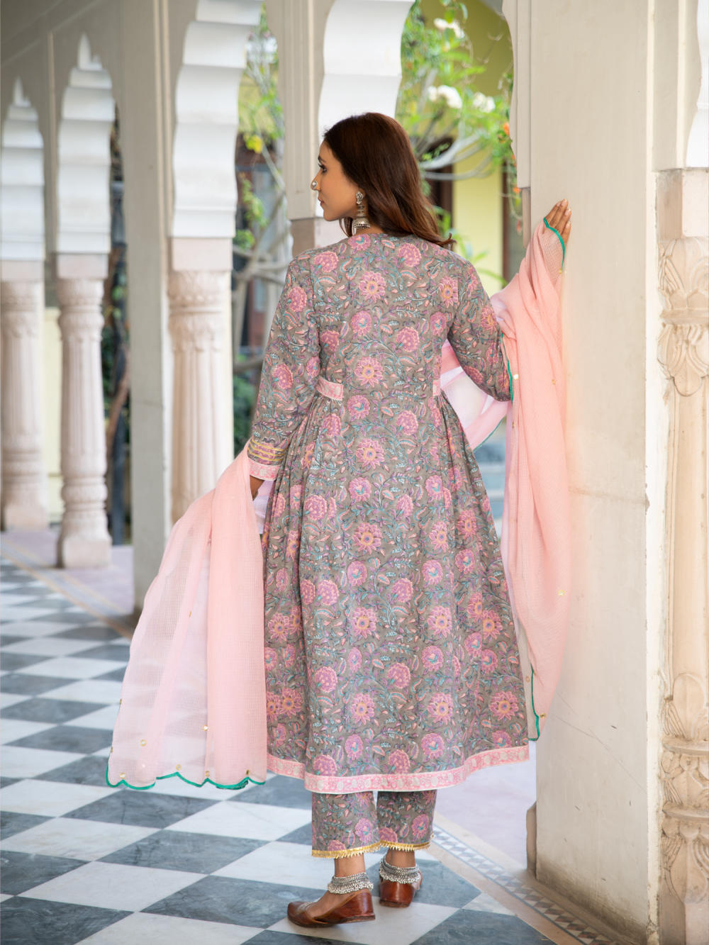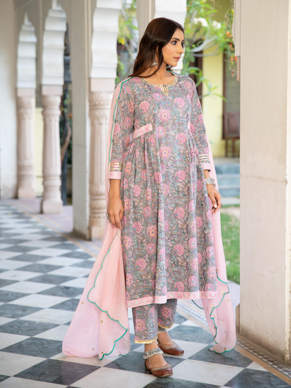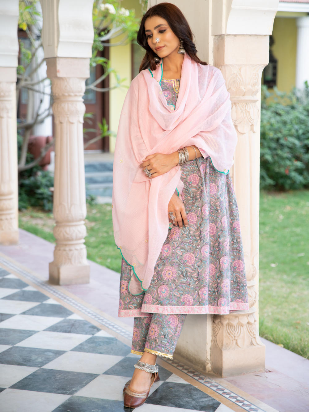 A poetic rendetion of a summer festive collection that makes you nostalgic, in classic luminous block prints. Handcrafted on a bed of fine cotton, mul and doria in hues of pastels. Perfect for light occasions. A set of 3 consists of kurta, pants & dupatta. KURTA: Summery florals combined with the most delicate silhouette inspired by the vintage bhopali grey kurta. This round neck, side gathered ghera kurta in cotton with loop button and gota detailing is a summer staple . Finished with hand printed border on the gather and ghera of the kurta. PANTS: Printed cotton pants finished with gota and bijiya. DUPATTA: Lota doriya dupatta with scalloped edges and mirror zari highlights