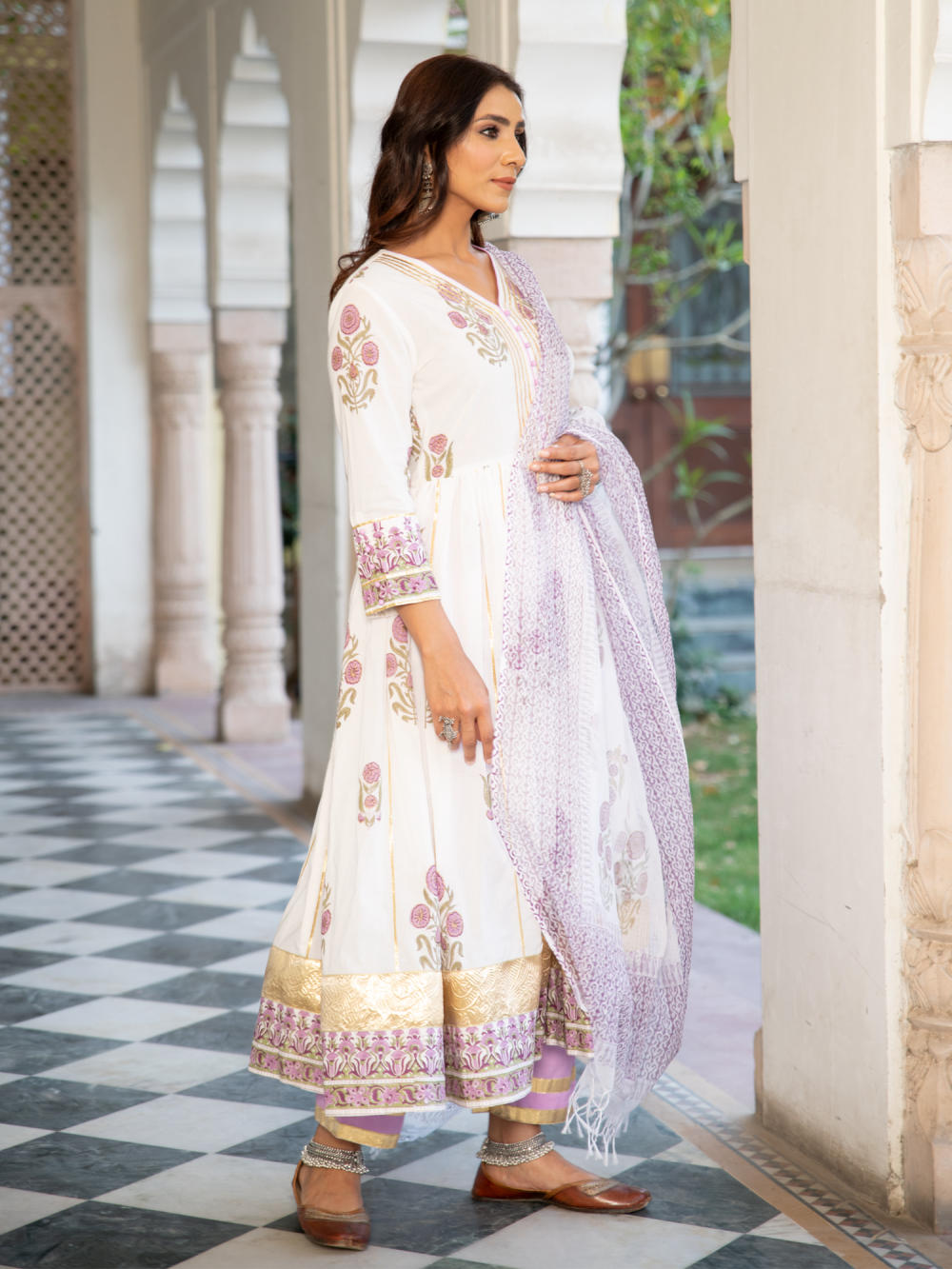 A poetic rendetion of a summer festive collection that makes you nostalgic, in classic luminous block prints. Handcrafted on a bed of fine cotton, mul and doria in hues of pastels. Perfect for light occasions. A set of 3 consists of kurta, staight pant & dupatta. KURTA: A gathered handprinted kurta with mughal buttas on an ivory base. Complete with gota detailing, hand made buttons and lampi work. PANTS: Combined with lavendar straight pants, detailed with gota highlights. DUPATTA: Handblock printed kota doria dupatta
