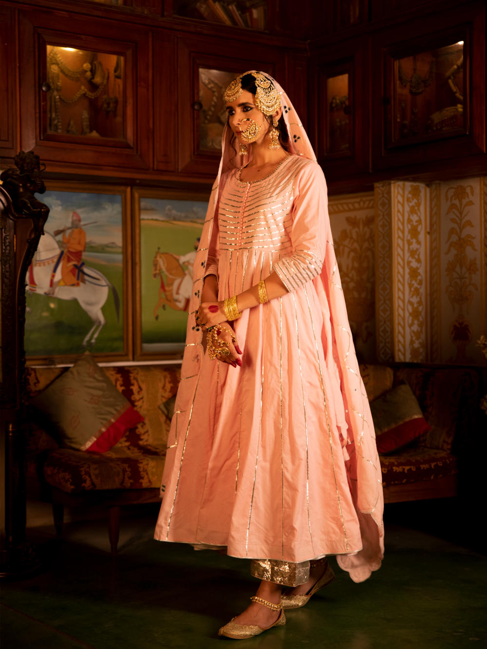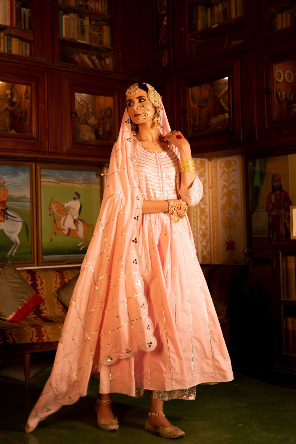 Enter the world of luxurious & regal clothing with Sahiba. Celebrate the grandeur of beauty, celebrations, dressing up and womanhood with vintage textiles and silhouettes. Set of 3 consists of Kalidar, pajama and dupatta. KALIDAR: A pink ghera cotton kalidar is adorned with heavy silver gota work on neck and kalis. PAJAMA: Pink Farshi pajama is detailed with pure metal gold lampi. DUPATTA: A handspun mul pink dupatta is detailed with zari and mirror scallop detailing with heavy gota chaukadi work