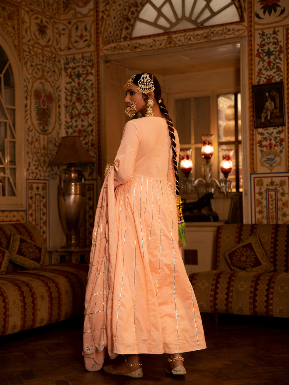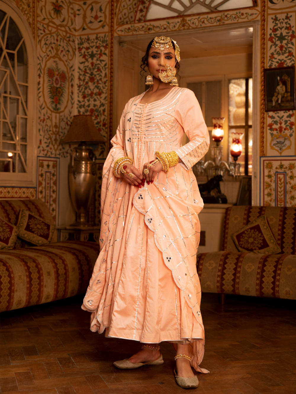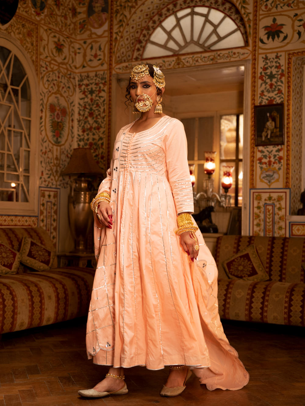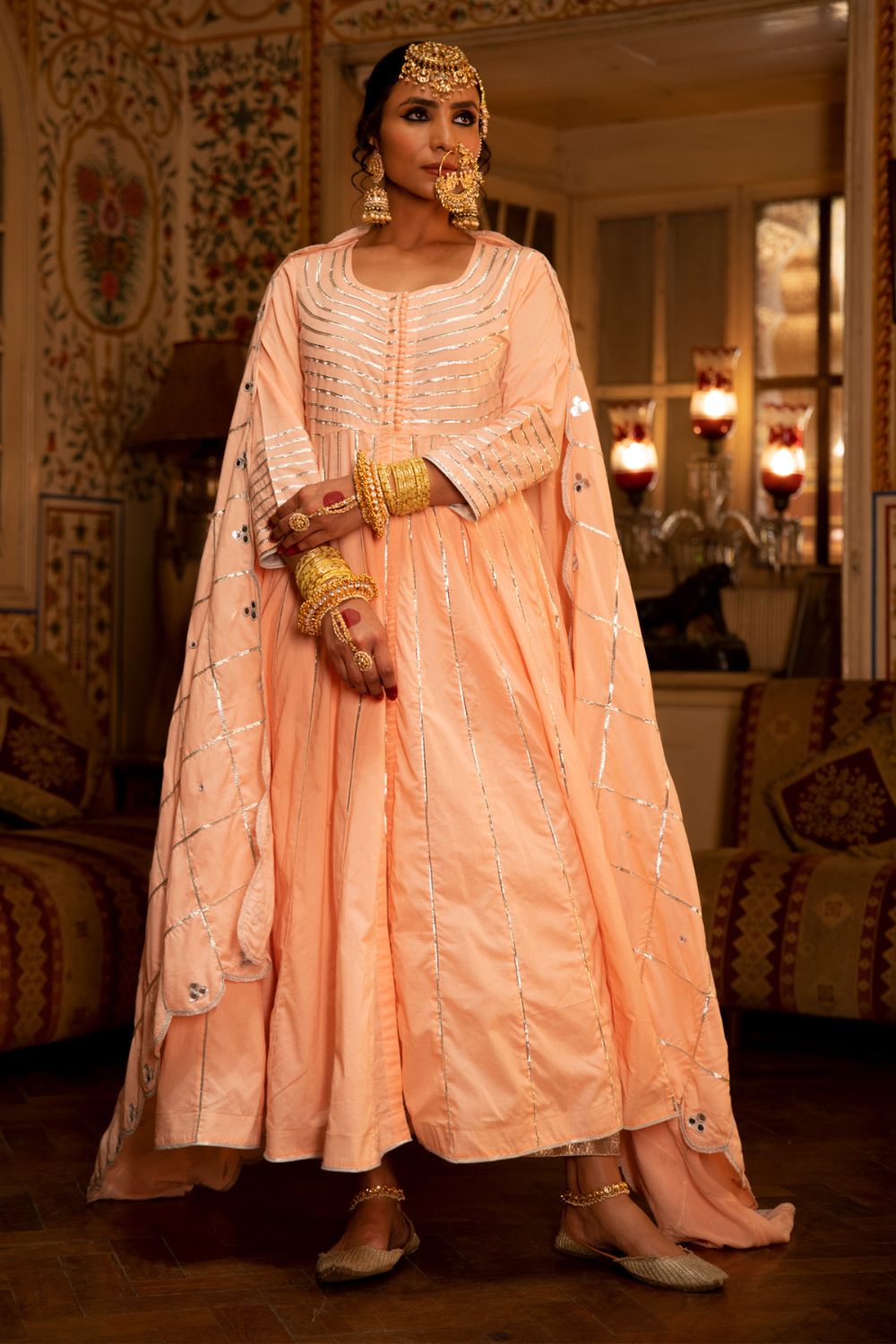 Enter the world of luxurious & regal clothing with Sahiba. Celebrate the grandeur of beauty, celebrations, dressing up and womanhood with vintage textiles and silhouettes. Set of 3 consists of Kalidar, pajama and dupatta. KALIDAR: A peach ghera cotton kalidar is adorned with heavy silver gota work on neck and kalis. PAJAMA: Peach Farshi pajama is detailed with pure metal gold lampi. DUPATTA: A handspun mul peach dupatta is detailed with zari and mirror scallop detailing with heavy gota chaukadi work