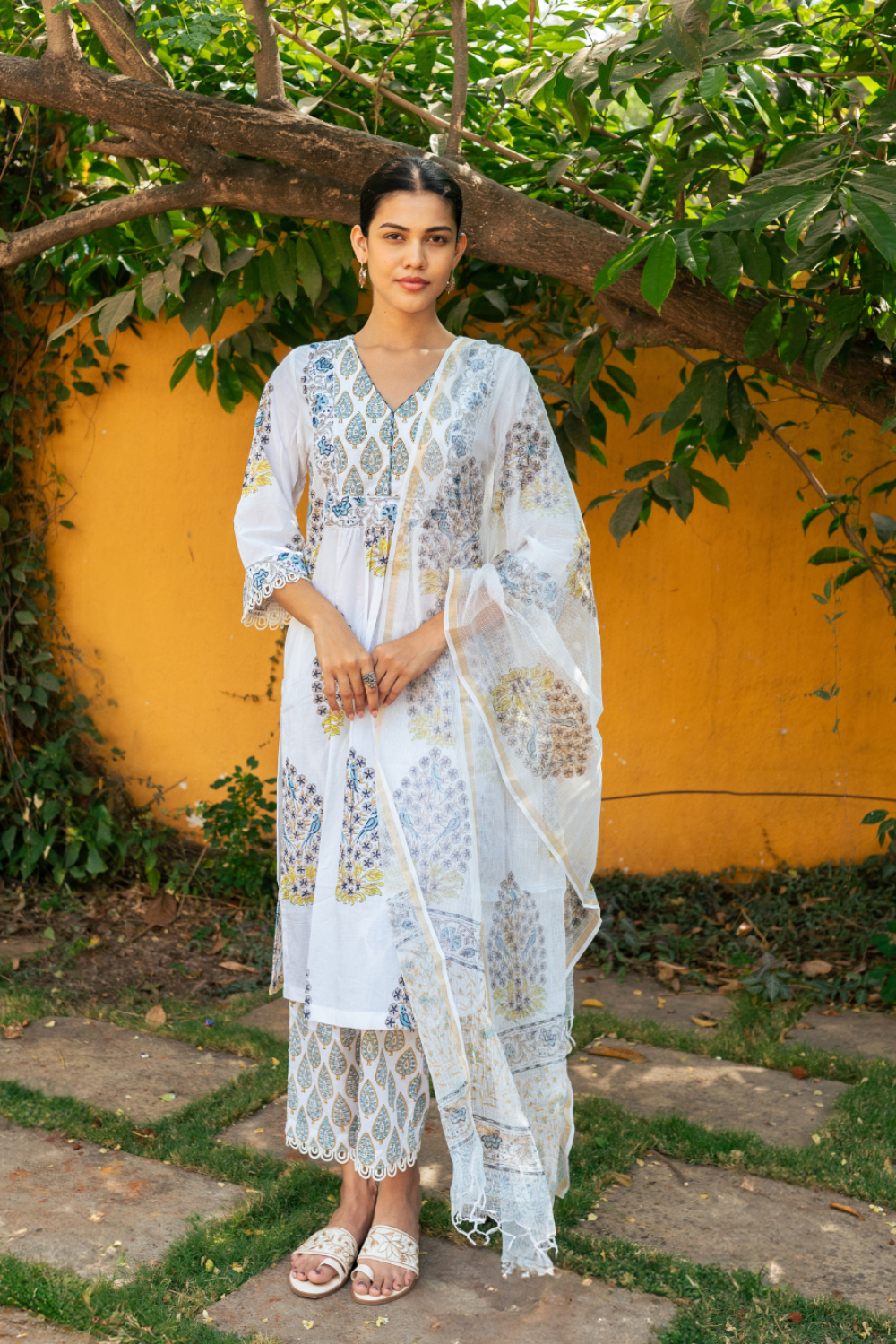 Embrace a burst of freshness in this ivory and blue hand block printed kurta set, adorned with vibrant floral prints that exude joyful elegance.