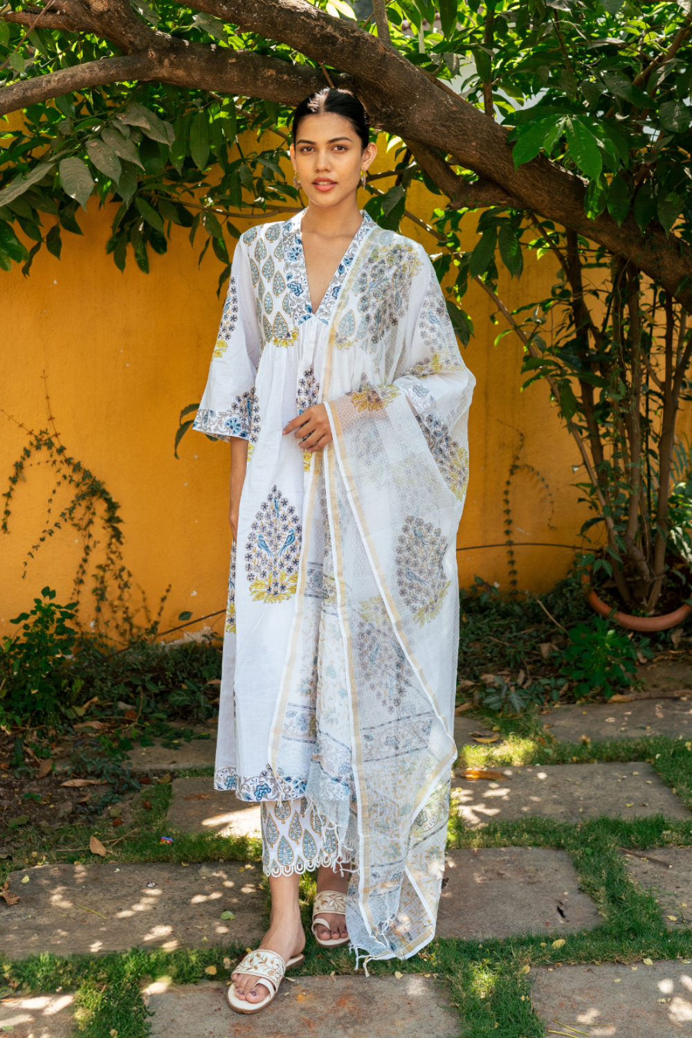 Effortlessly elegant, this ivory and blue hand block printed suit set is a timeless addition to your wardrobe.