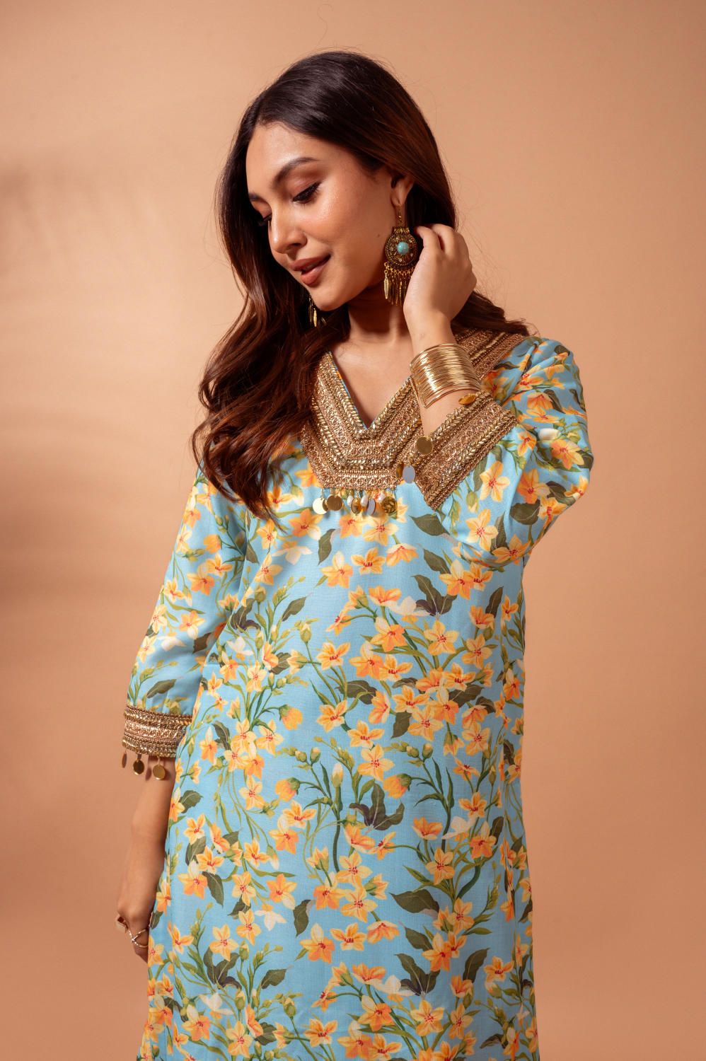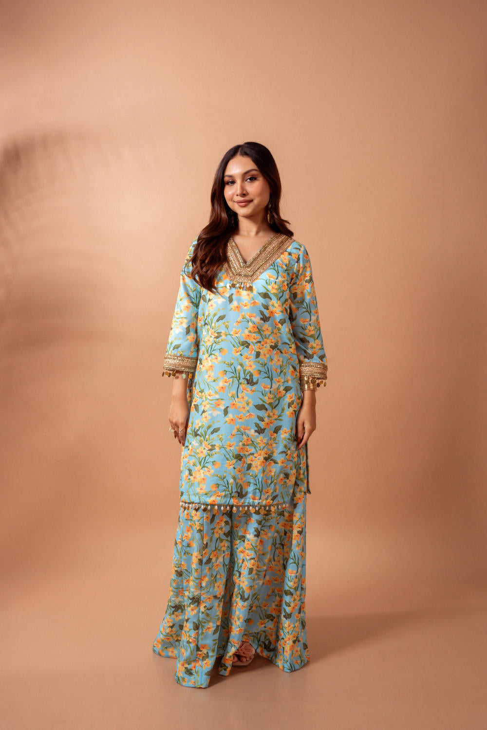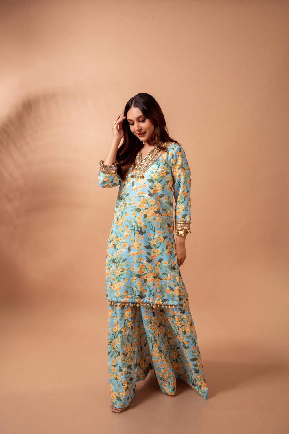 Linen digital print aqua kali sharara set- The set includes kurta and sharara pants with gota and hand work lace detailing, finished with mirror tassels on sleeves and hem for a playful look.