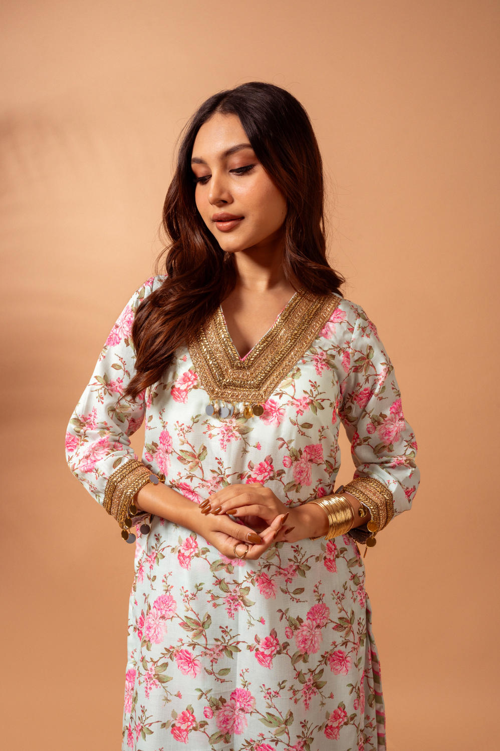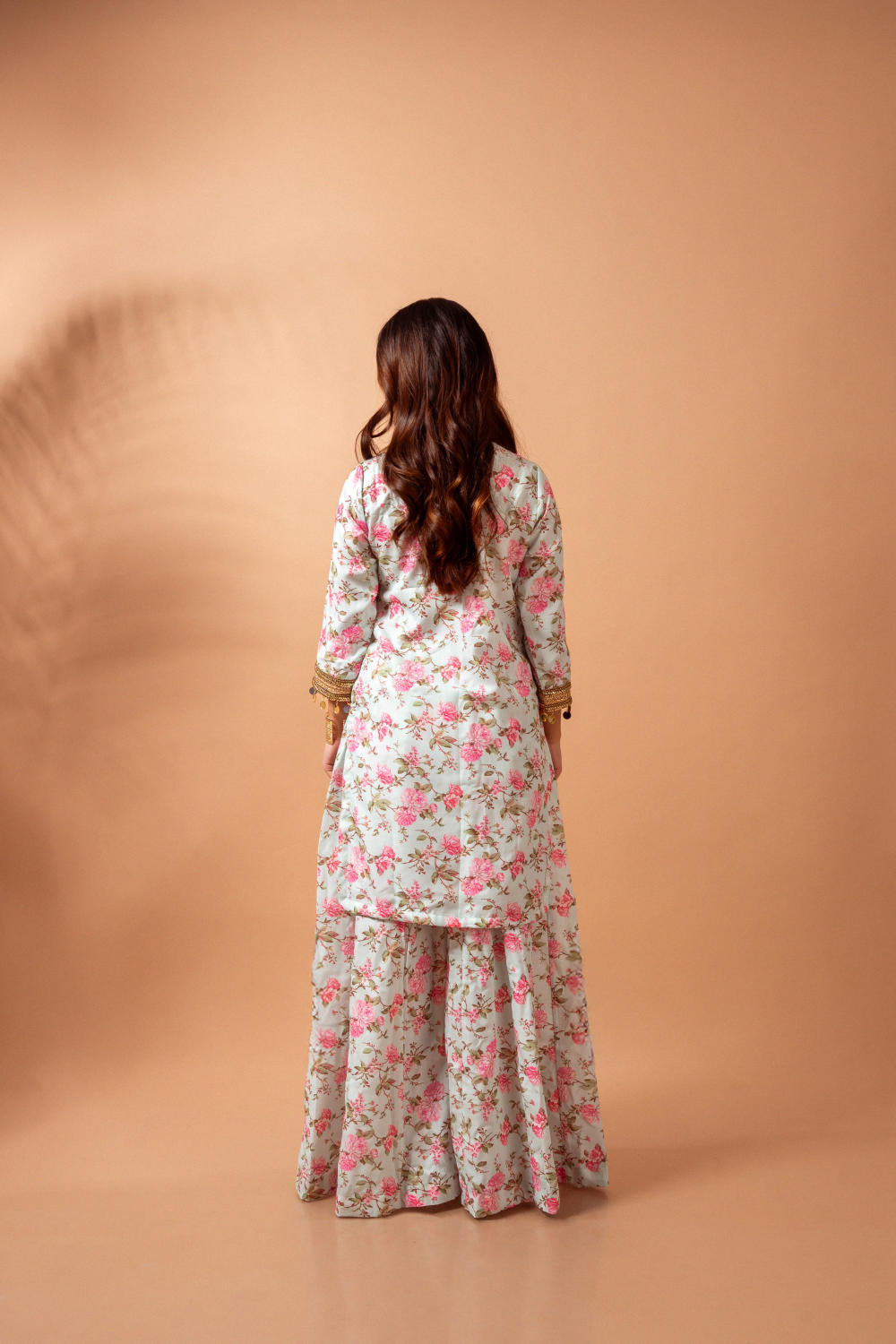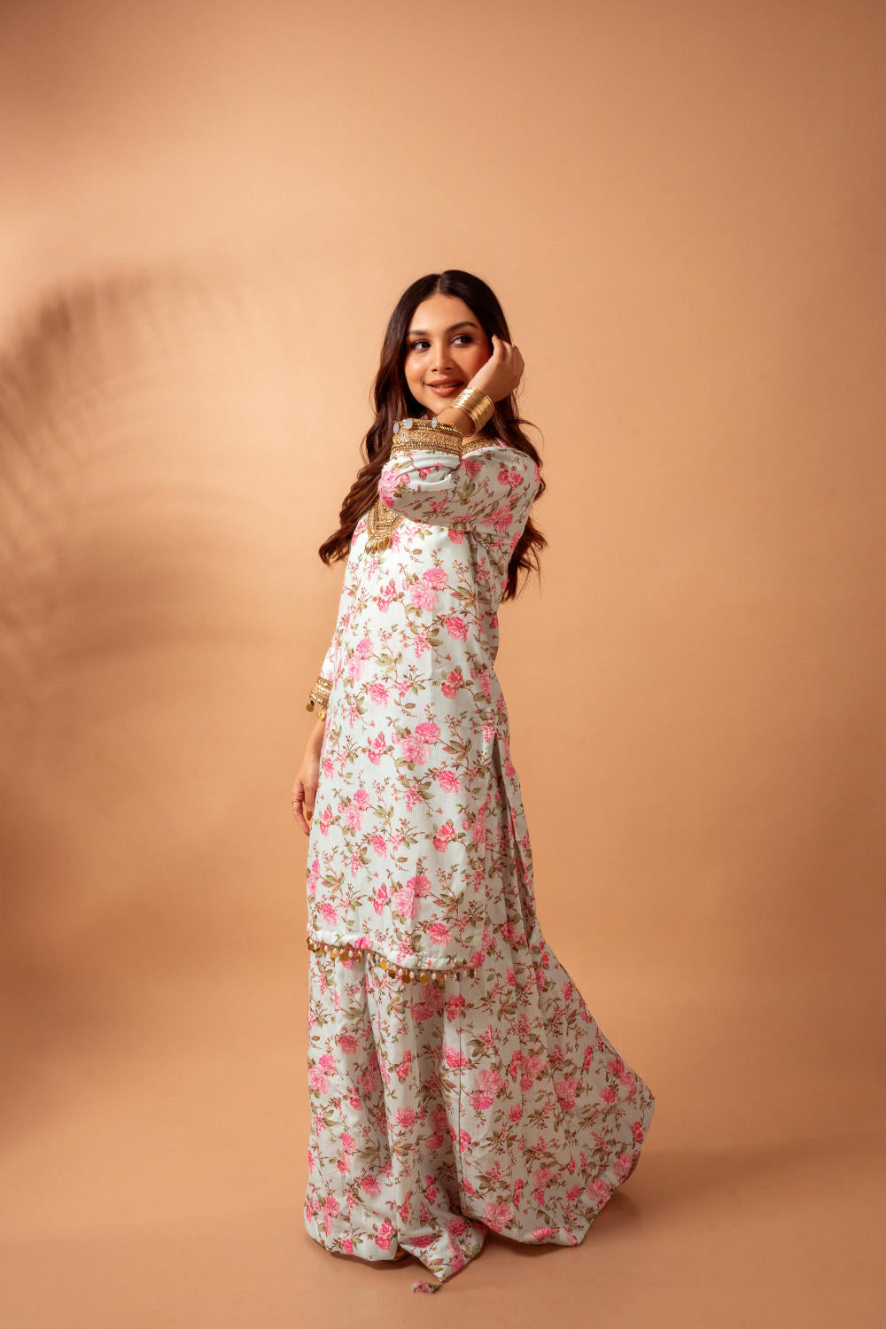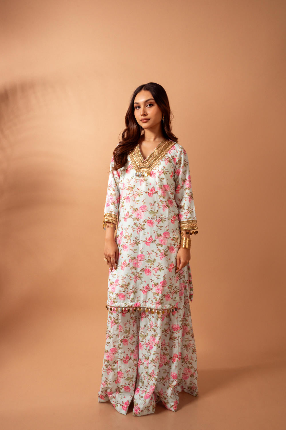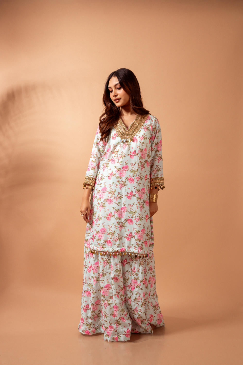 Linen digital print kali sharara set- The set includes kurta and sharara pants with gota and hand work lace detailing, finished with mirror tassels on sleeves and hem for a playful look.
