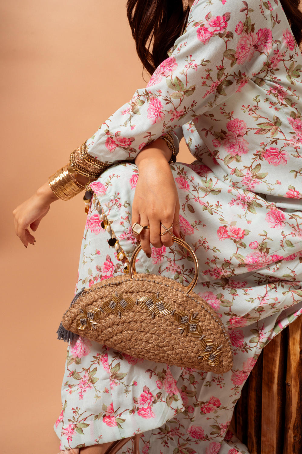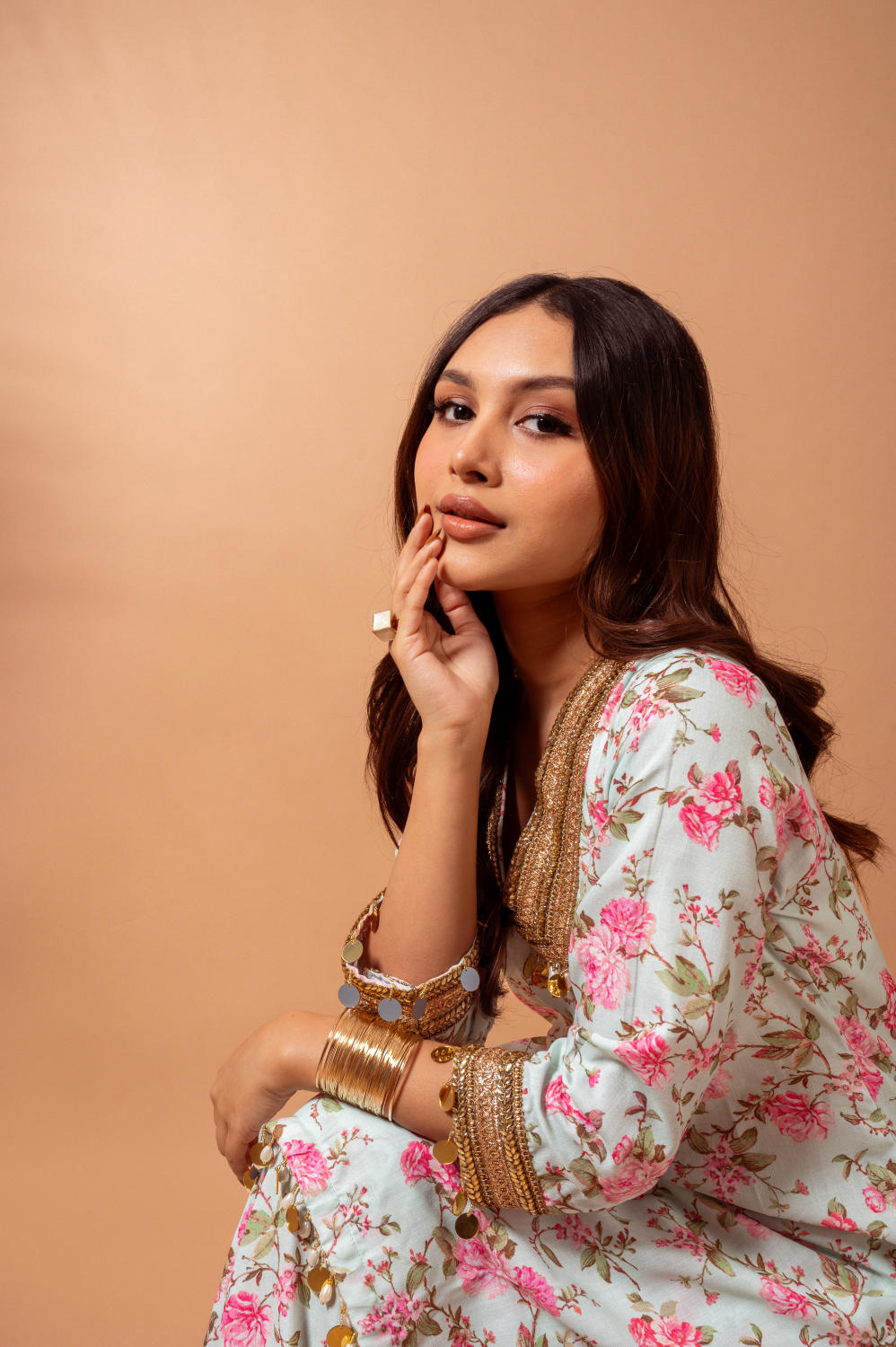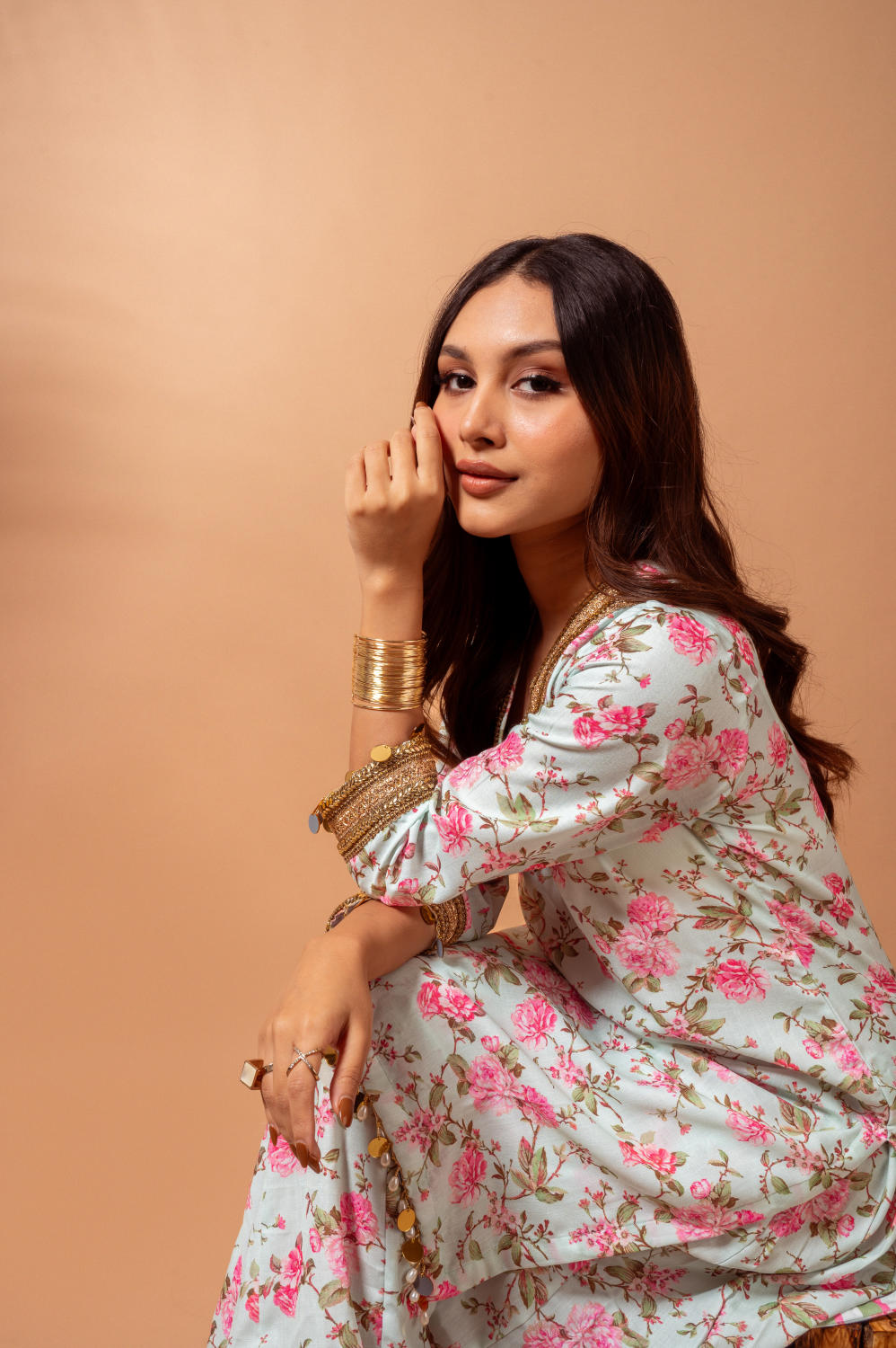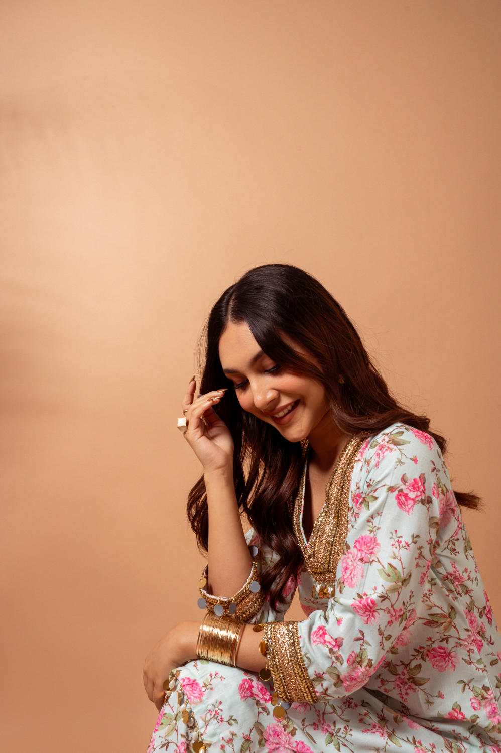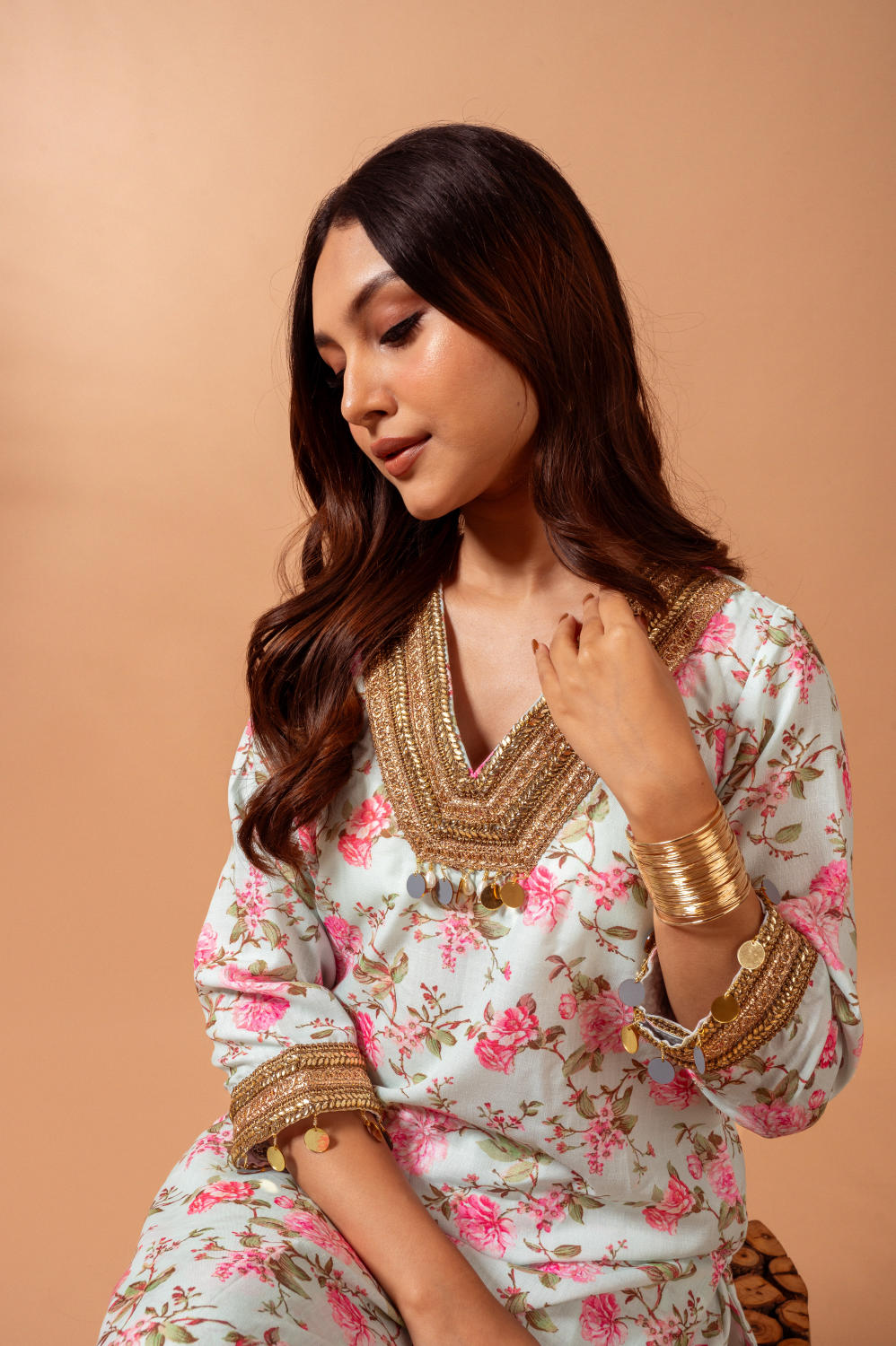 Linen digital print kali sharara set- The set includes kurta and sharara pants with gota and hand work lace detailing, finished with mirror tassels on sleeves and hem for a playful look.