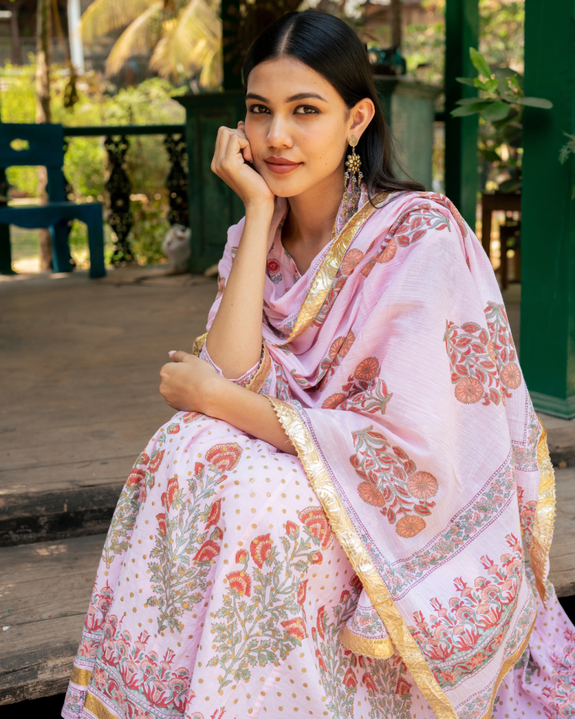 Translating prayer in Persian "Dua" is an amalgamation of our signature block prints, gota patti and classic silhouettes handcrafted on the most delectable base of cotton and Mul Mul.