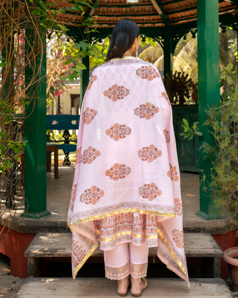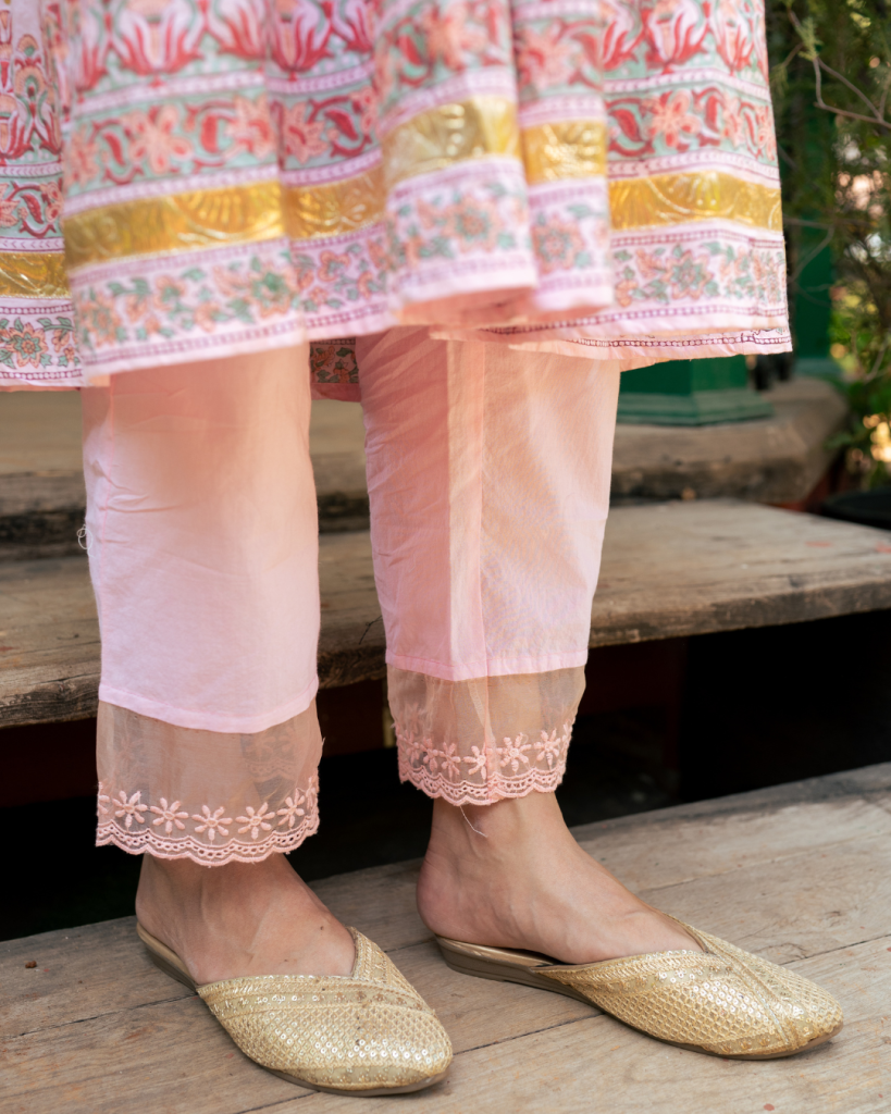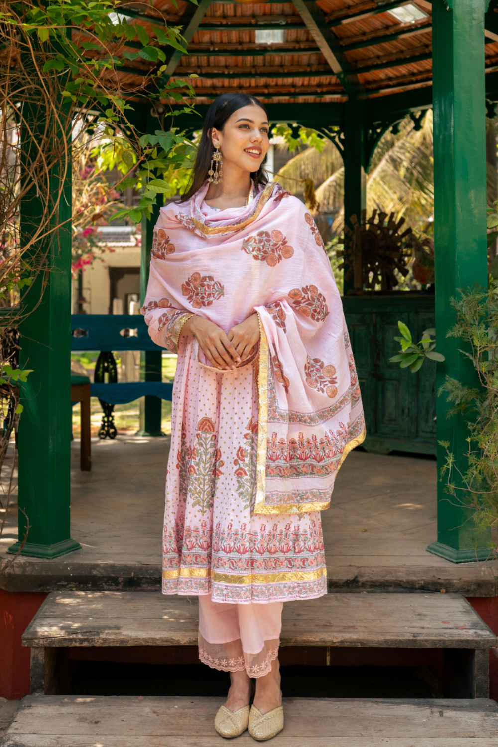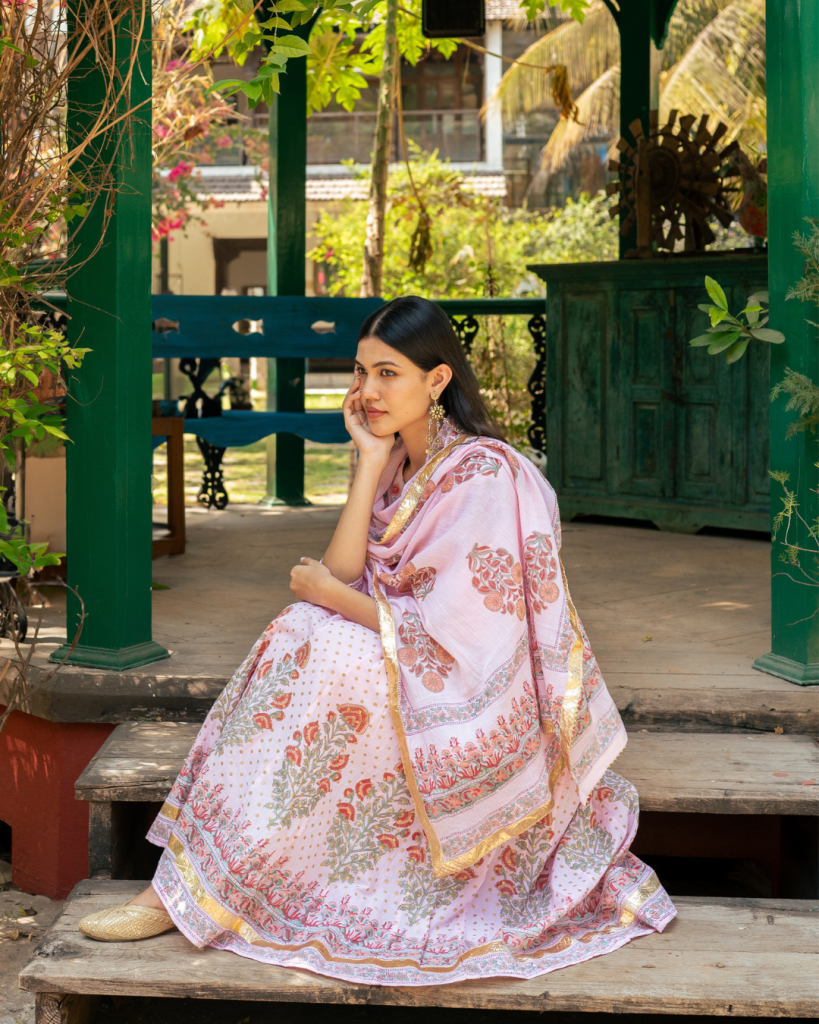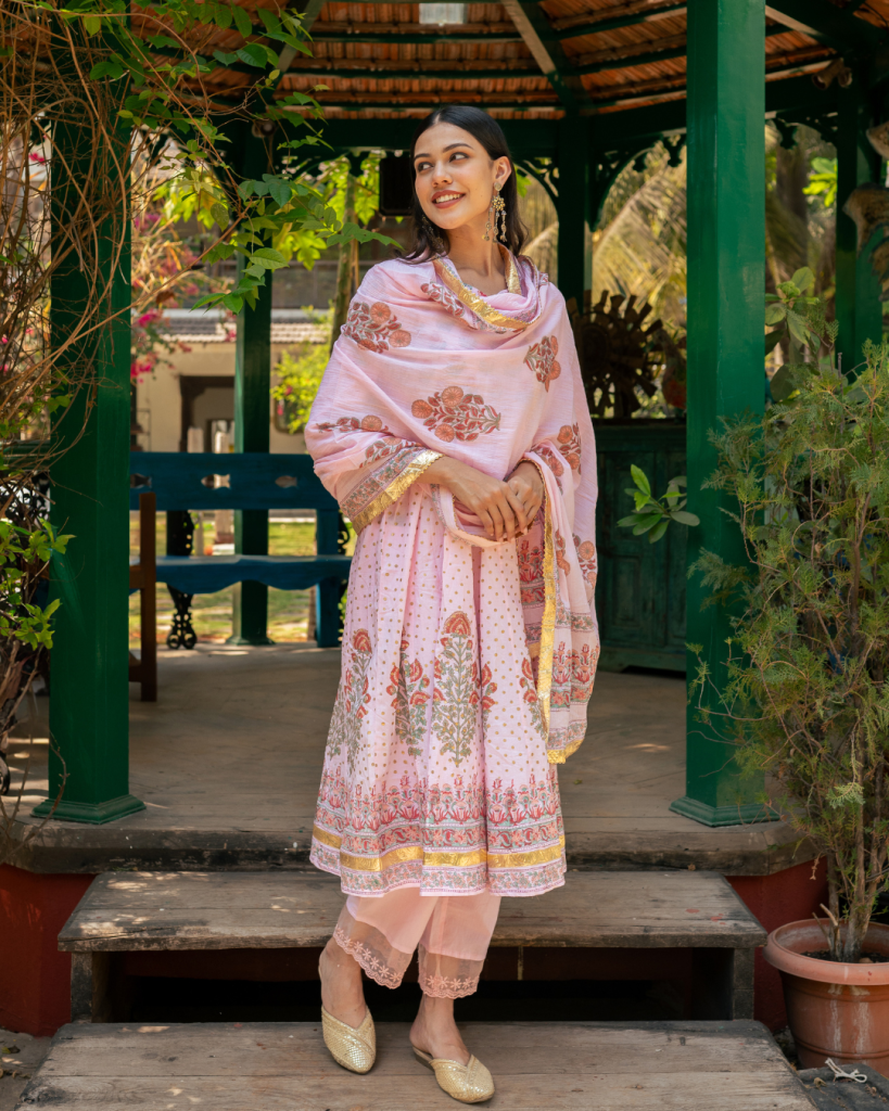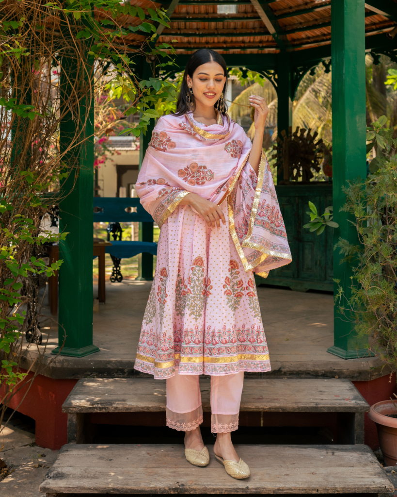 The radiance of our Mughal Pink Boota Anarkali Set exudes warmth and grace, capturing the essence of summer elegance.