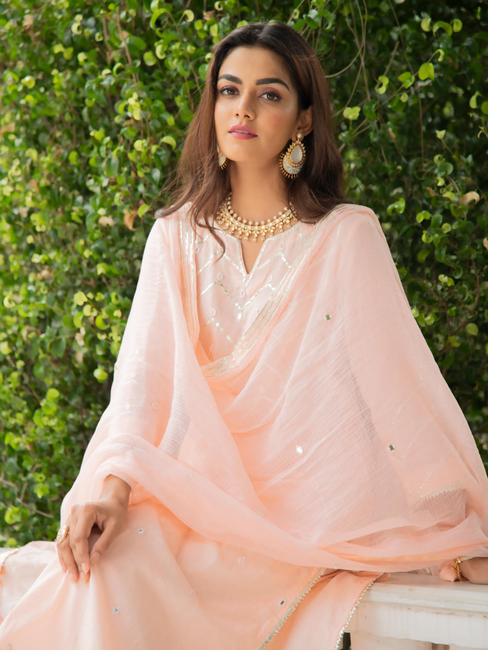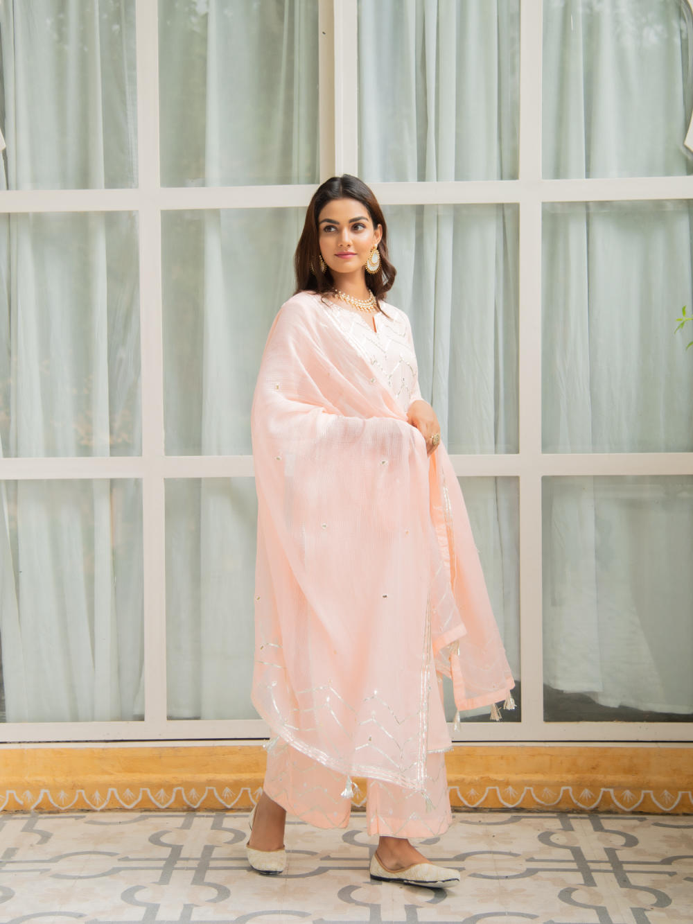 Set of 3 consists of kurta, palazzo and dupatta. Noor, bringing the magic of festivities straight to your closet in shades of pastels. Delicately adorned with mirror & gota detailing.