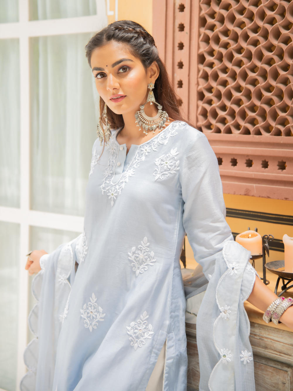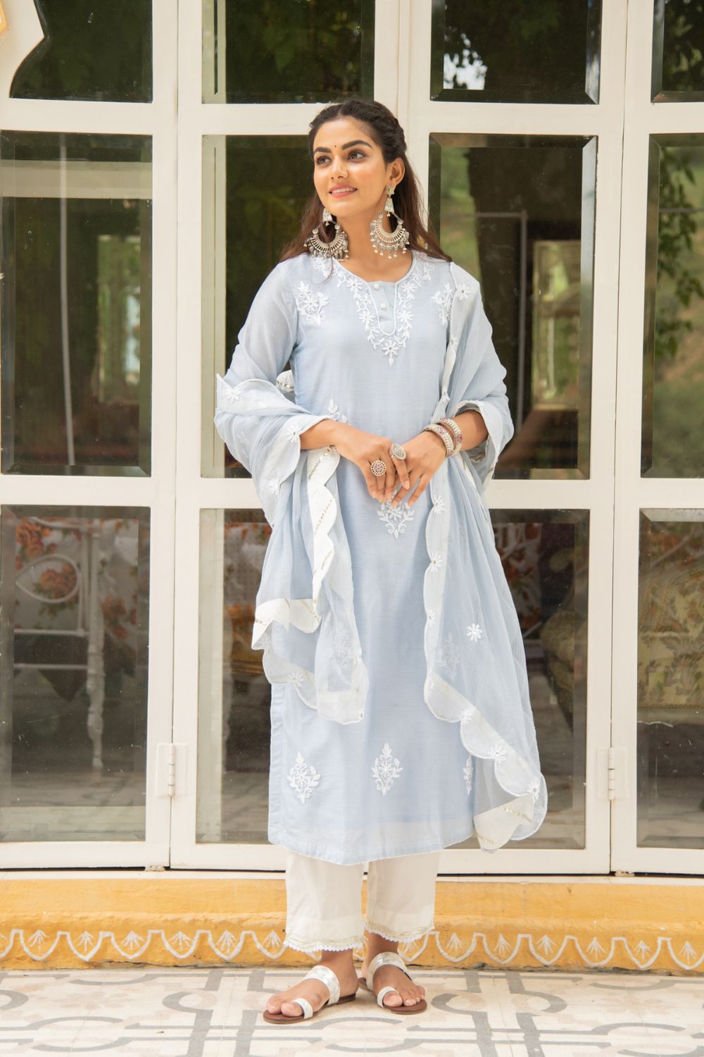 KURTI: A elegant powder blue chanderi kurti with kasida mirror and thread work on the neckline, sleeves & hemline.
