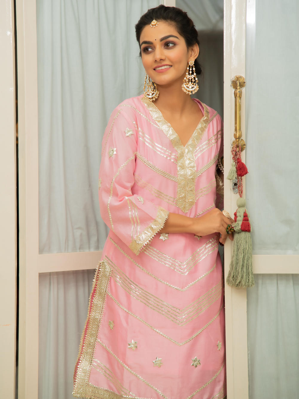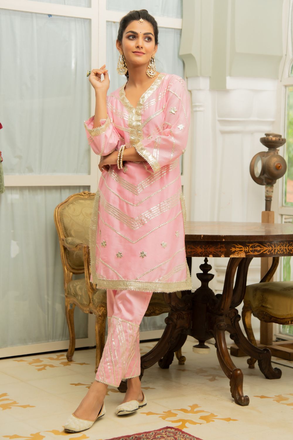 KURTI: A rosy pink short chanderi kurti with heavy gota lace detailing on the neckline, sleeves & hemline. Comes with an inner.
