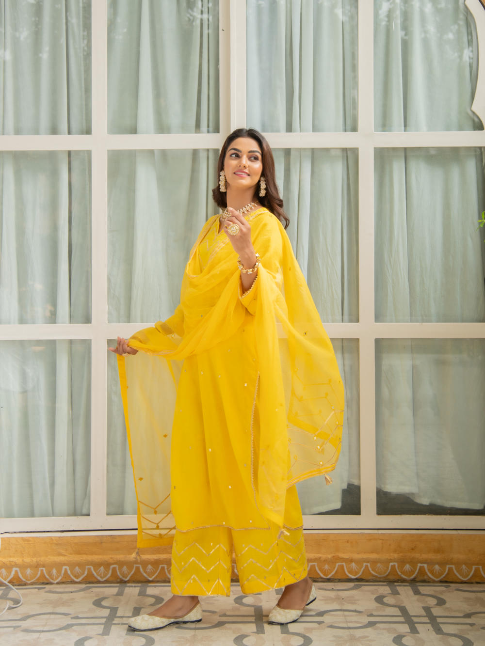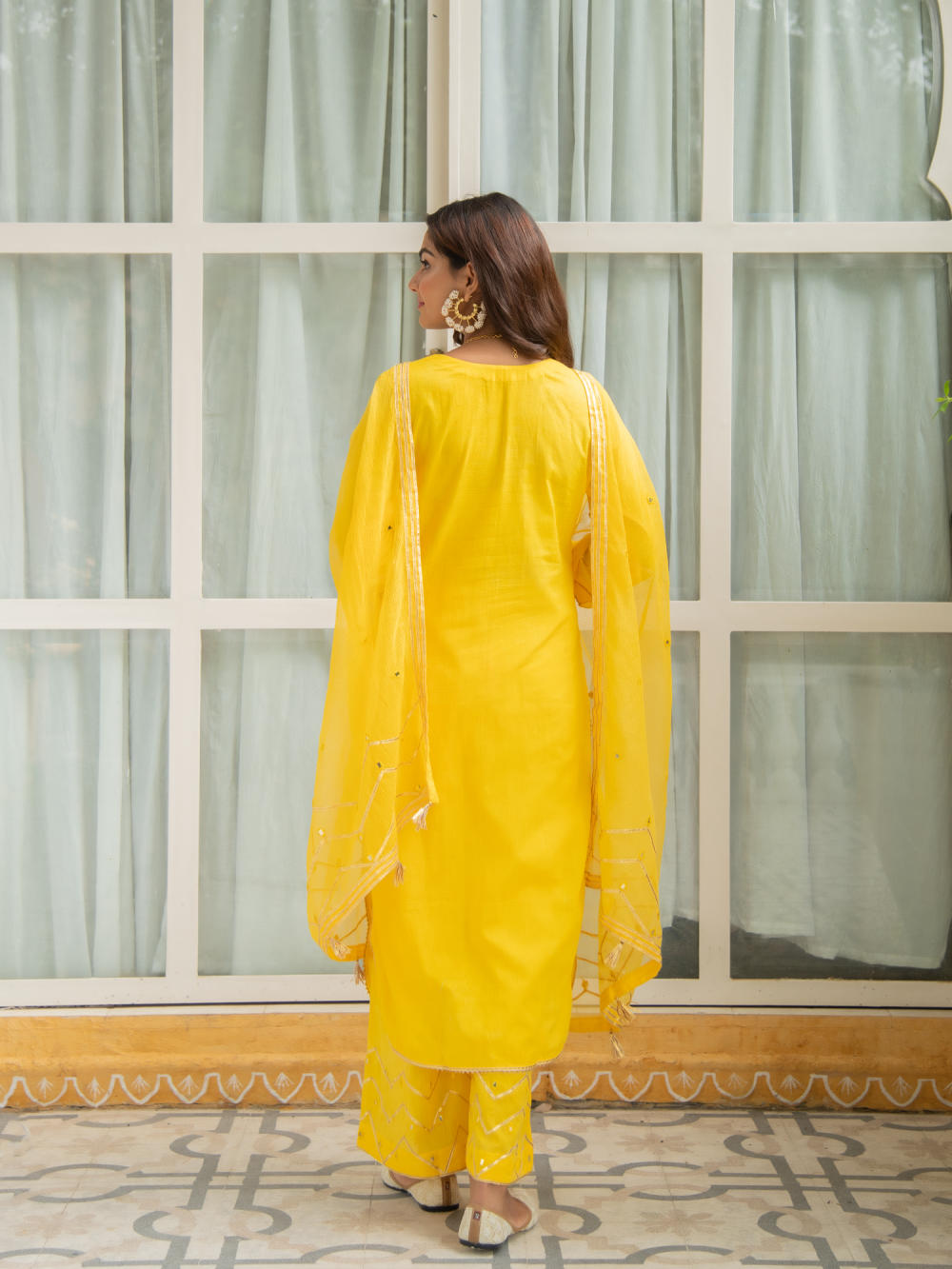 KURTI: A minimal straight fit cheerful yellow kurti with gota &mirror detailing on the neckline, sleeves & hemline.