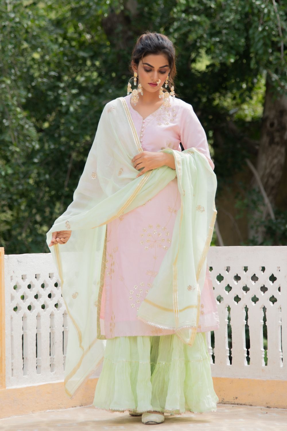 Set of 3 consists of kurta, sharara and dupatta Noor, bringing the magic of festivities straight to your closet in shades of pastels.