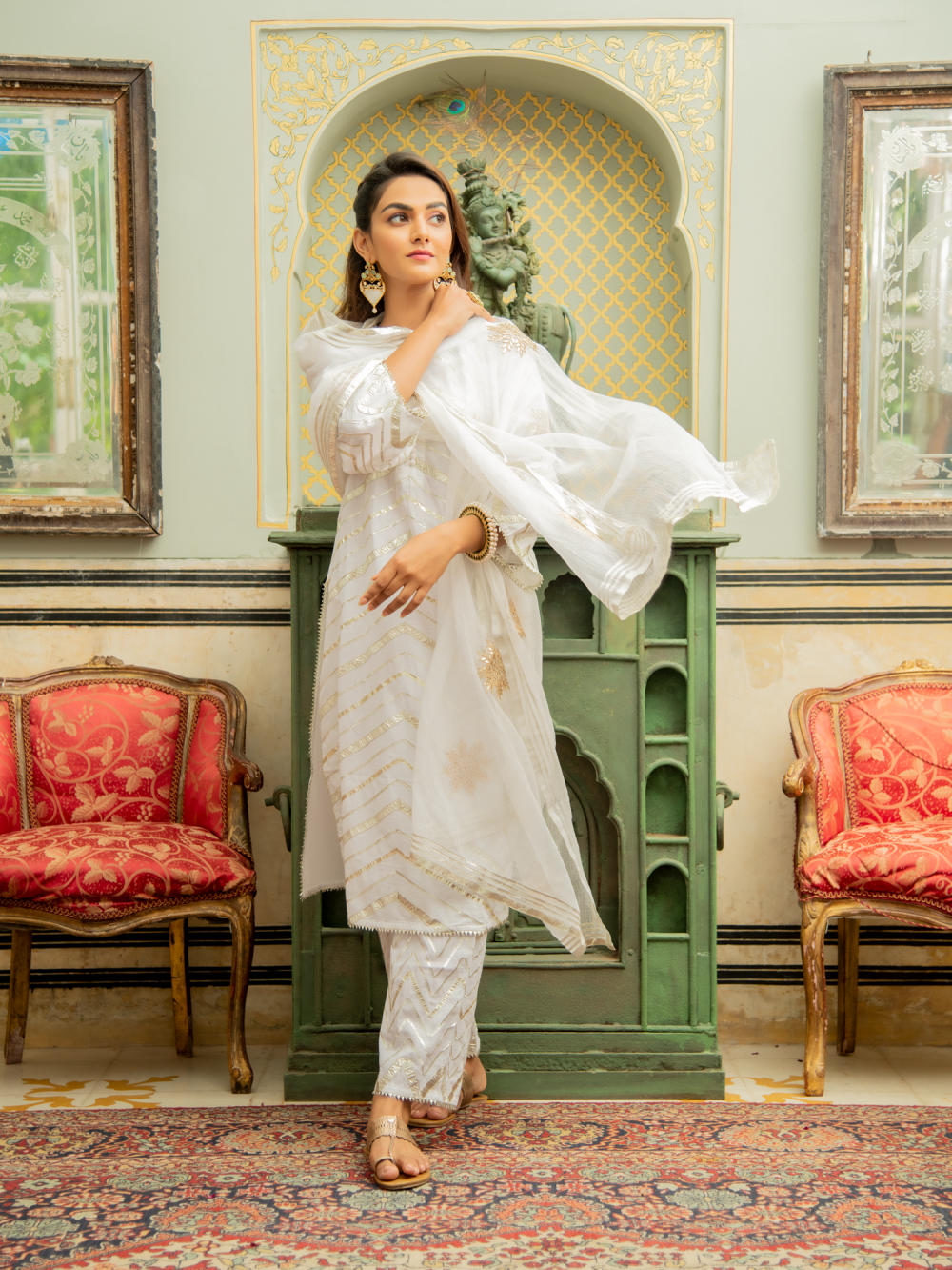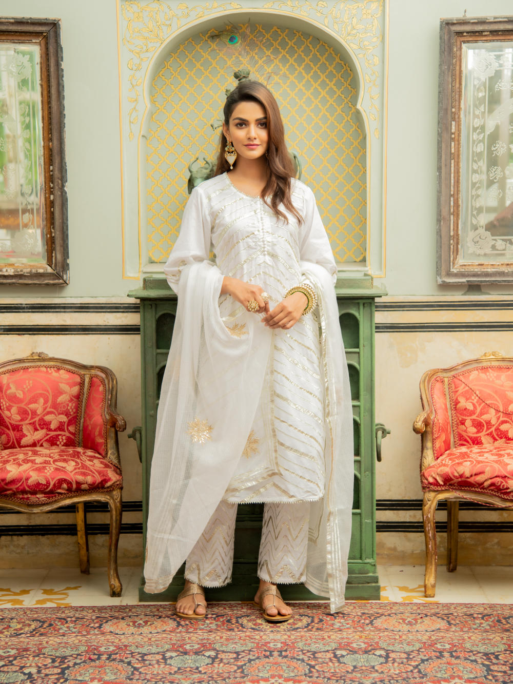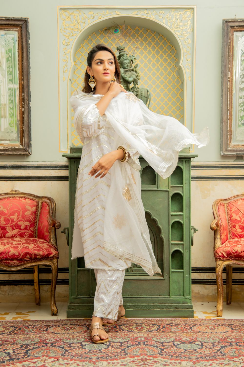 Set of 3 consists of kurta, palazzo and dupatta. Noor, bringing the magic of festivities straight to your closet in shades of pastels. Delicately adorned with lehirya gota detailing.